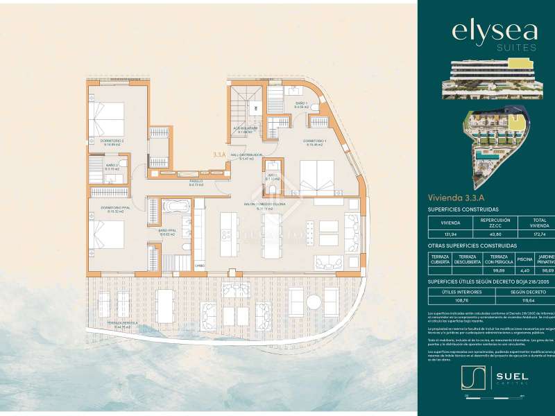 Lucas Fox is pleased to present Elysea Suites, an exclusive new build development with 22 two- and three-bedroom apartments located in Mijas Costa, Málaga. The development enjoys spectacular views of the Mediterranean Sea from all the homes and is located just three minutes' walk from the beach. This penthouse has an open-plan design, especially in the day area that houses the living room, dining room and kitchen in a single open-plan space, to maximize space. The night area consists of three bedrooms, each with its own private bathroom. Likewise, it has large windows that allow natural light to enter throughout the space and offer a warm and cosy atmosphere. On the other hand, the property has a large terrace and, on the roof, a solarium with a pool, to enjoy the area's climate with incredible views of the sea, thanks to the elevated position of the development. The apartment is completed with a garage space with a private storage room included. Furthermore, the property has exceptional features. It allows residents to enjoy a lifestyle that seamlessly combines the best of both worlds: the peaceful serenity of coastal living and the modern amenities of an exclusive community. An impressive community pool is offered, to enjoy a refreshing swim or disconnect from day-to-day life. It also has a fully equipped gym, to continue your exercise routine without having to leave home. Even for those who want to relax after a hard day, the community has a spa. In the gardens, a wide variety of plant species have been carefully selected that are maintained throughout the year and that successfully decorate this outdoor space, for your enjoyment. At Elysea Suites, an organic style of architecture has been used for the façade, with a more rational design on the inside. This has made the terrace and solarium standout features while maintaining the property's privacy. In order to meet all your expectations, there is the possibility of customizing different rooms in your property, introducing improvements and different options in the kitchen and bathrooms. Do not hesitate to ask us for more information.
