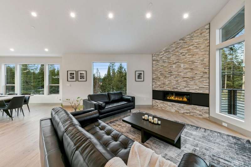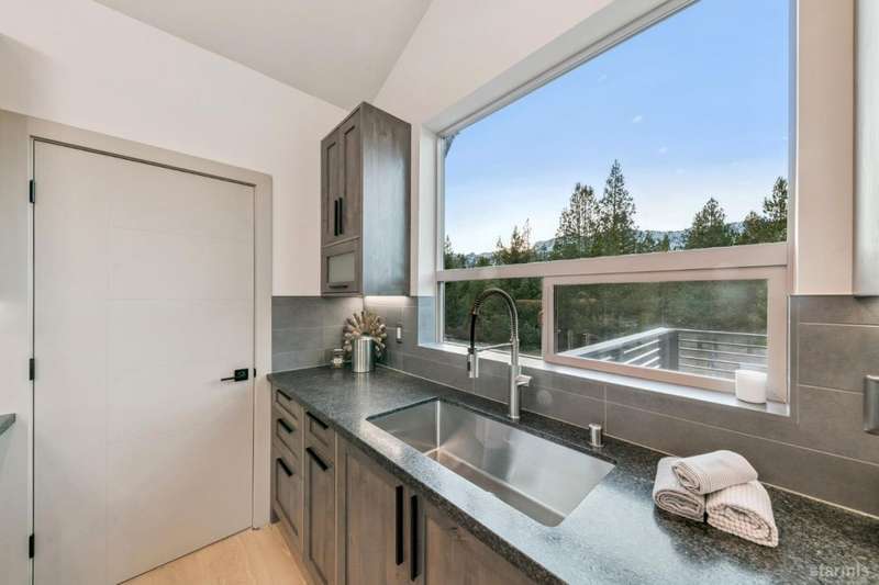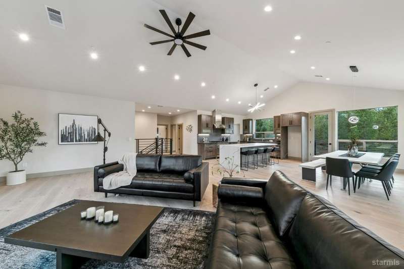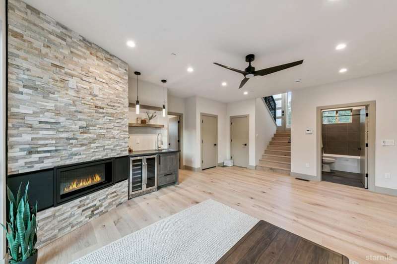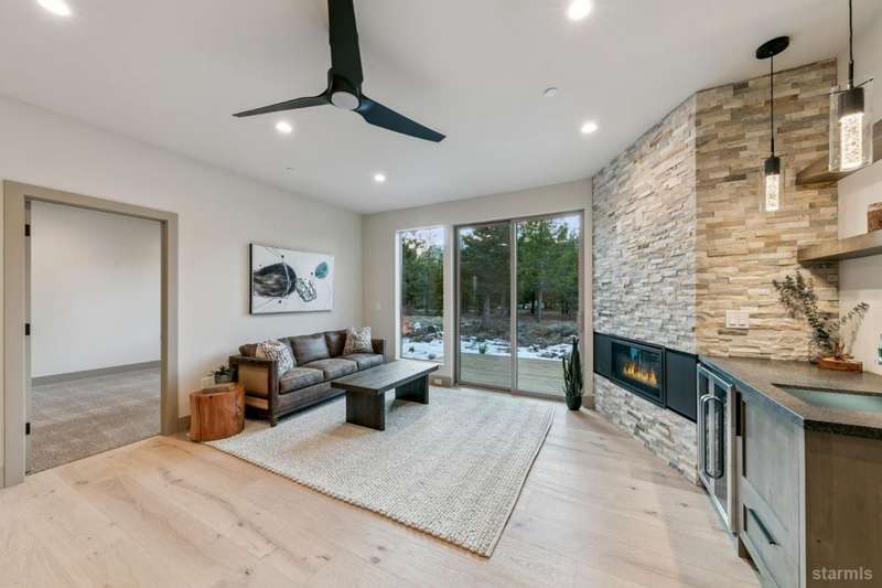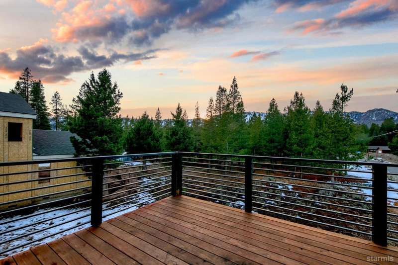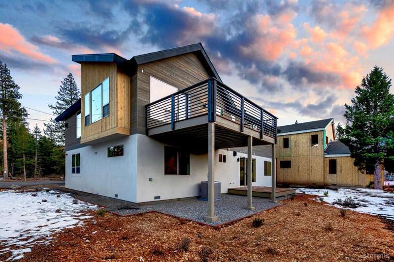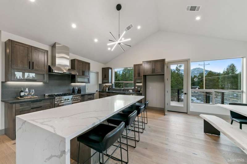Discover your mountain retreat in this stunning brand-new custom home that perfectly balances luxury with Lake Tahoe's natural beauty. This impressive 3,100 square foot residence offers five bedrooms and four full bathrooms, all situated on a sunny flat lot that backs to Conservancy and Forest Service land.This mountain contemporary home features a spacious great room with vaulted ceilings and beautiful brushed white oak hardwood floors throughout. A luxurious gas fireplace creates the perfect gathering spot, while front and rear decks showcase the forest and mountain views.The gourmet kitchen features custom solid knotty alder cabinets paired with elegant quartz and granite slab counters. Stainless steel appliances include a commercial-style gas range and a beverage refrigerator, while a well-appointed pantry ensures ample storage.The main level primary bedroom is complete with a walk-in closet, private balcony, and spa-inspired bathroom featuring a dual-head shower, double sink vanity, and custom tilework. Downstairs, you'll find a second living area with built-in wet bar and custom gas fireplace, plus a junior primary suite with full ensuite bathroom.Quality craftsmanship shines throughout with custom built iron railings, on-demand water heater, and attention to detail. The location offers unparalleled outdoor recreation opportunities, with Tahoe Paradise Park just steps away, providing access to pickleball, hiking trails, swimming, fishing, and year-round mountain activities.