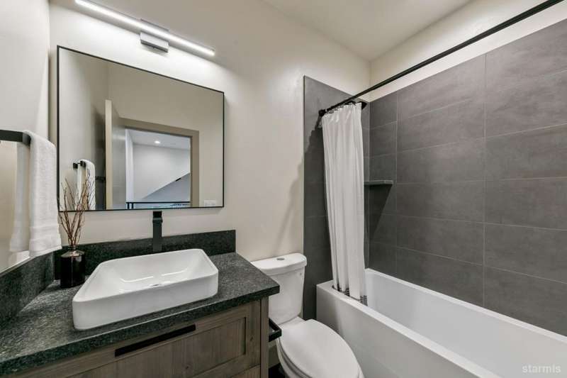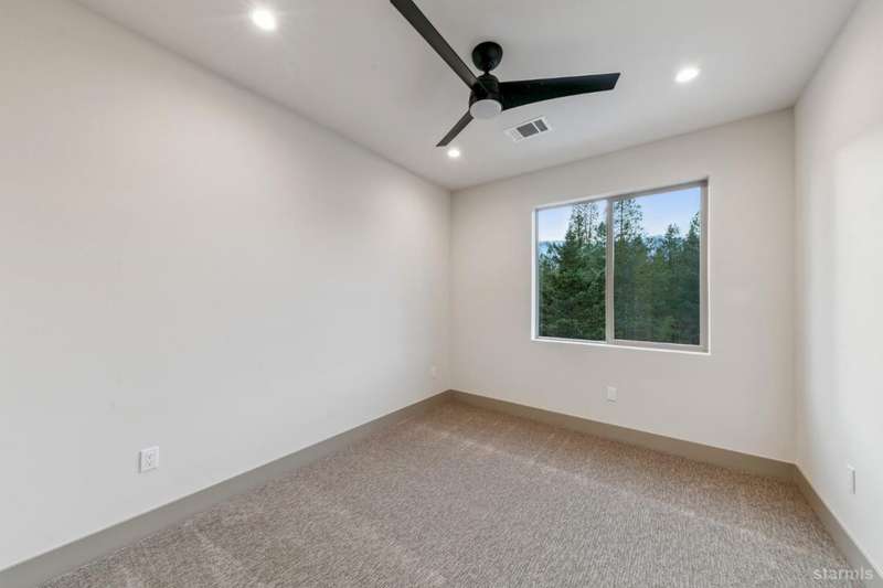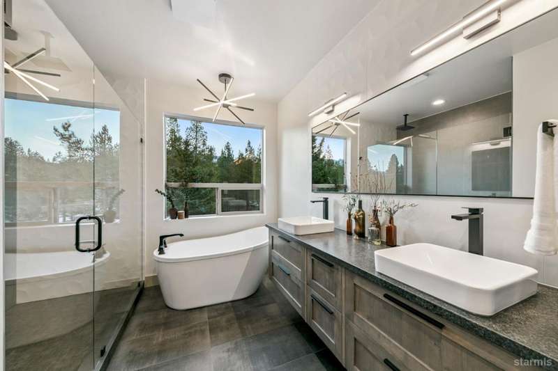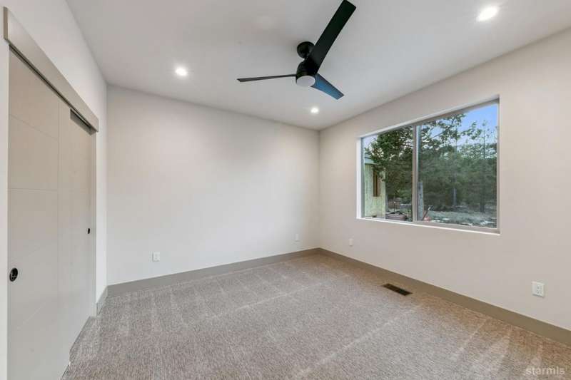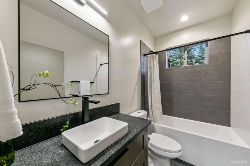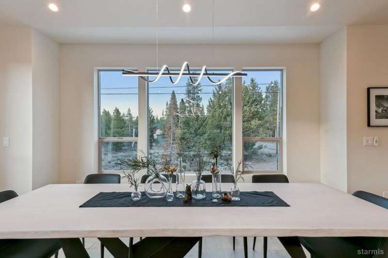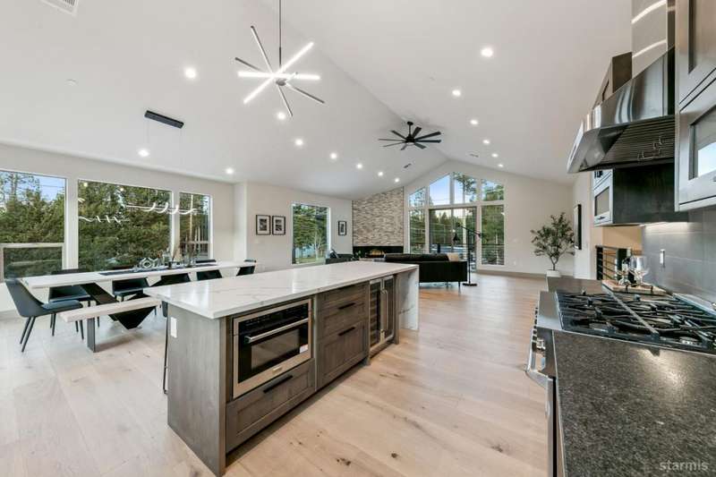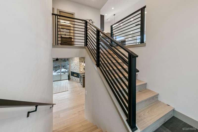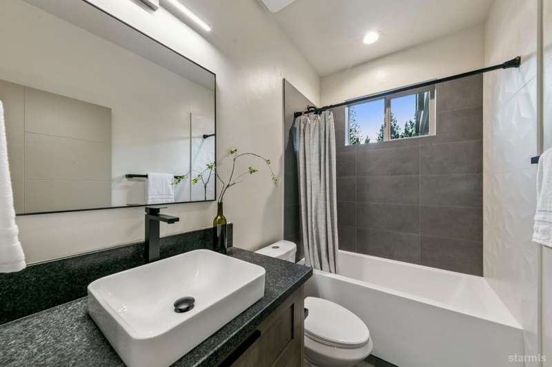 Discover your mountain retreat in this stunning brand-new custom home that perfectly balances luxury with Lake Tahoe's natural beauty. This impressive 3,100 square foot residence offers five bedrooms and four full bathrooms, all situated on a sunny flat lot that backs to Conservancy and Forest Service land.This mountain contemporary home features a spacious great room with vaulted ceilings and beautiful brushed white oak hardwood floors throughout. A luxurious gas fireplace creates the perfect gathering spot, while front and rear decks showcase the forest and mountain views.The gourmet kitchen features custom solid knotty alder cabinets paired with elegant quartz and granite slab counters. Stainless steel appliances include a commercial-style gas range and a beverage refrigerator, while a well-appointed pantry ensures ample storage.The main level primary bedroom is complete with a walk-in closet, private balcony, and spa-inspired bathroom featuring a dual-head shower, double sink vanity, and custom tilework. Downstairs, you'll find a second living area with built-in wet bar and custom gas fireplace, plus a junior primary suite with full ensuite bathroom.Quality craftsmanship shines throughout with custom built iron railings, on-demand water heater, and attention to detail. The location offers unparalleled outdoor recreation opportunities, with Tahoe Paradise Park just steps away, providing access to pickleball, hiking trails, swimming, fishing, and year-round mountain activities.