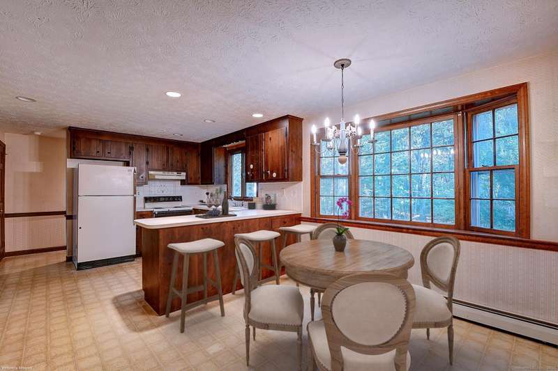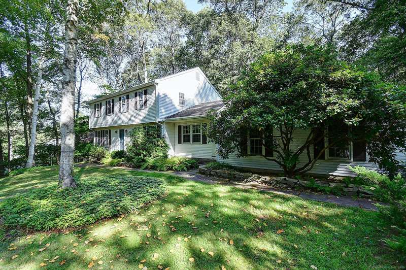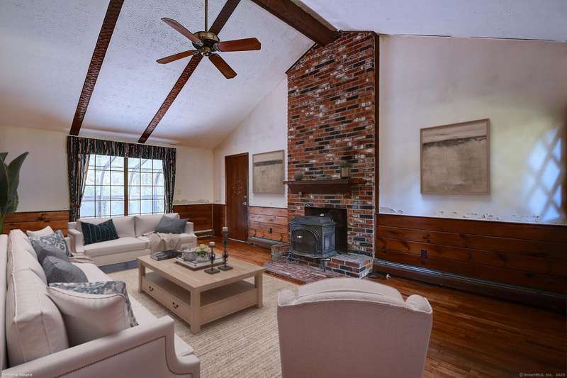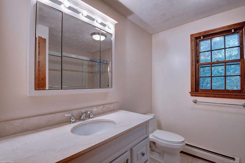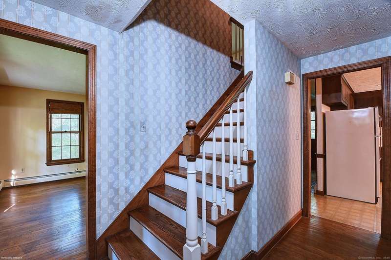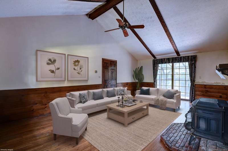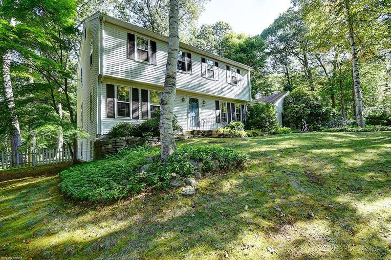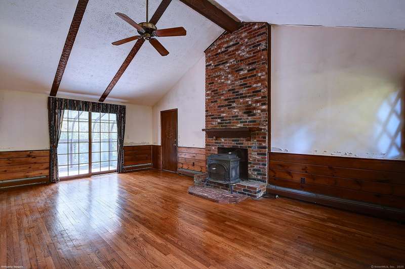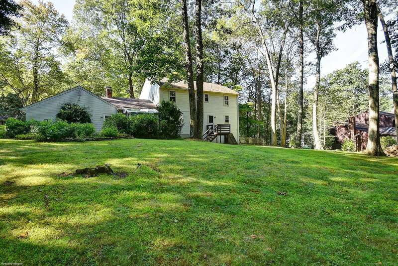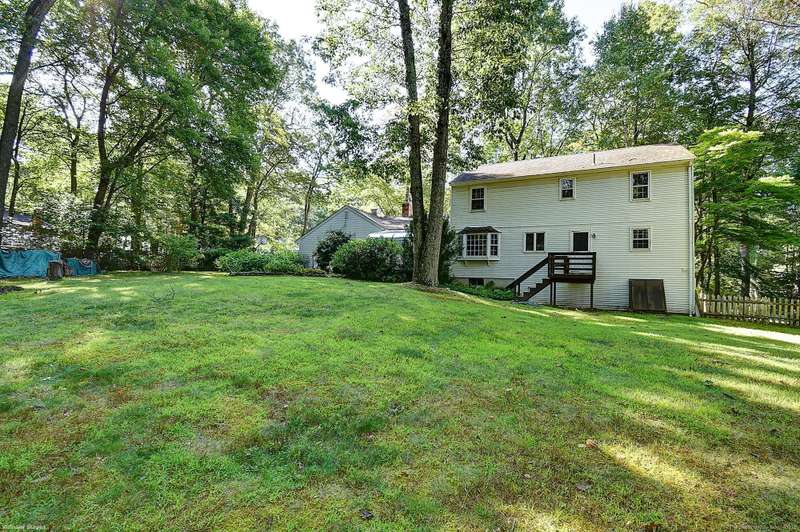 Large four-bedroom colonial awaits your finishing touches. Traditional layout with kitchen at the center of the home adjacent to the dining room and family living spaces. Great room features soaring ceiling, floor to ceiling brick fireplace, wood burning stove and access to back sunroom. Fabulous private backyard with plenty of room to enjoy. Hardwood floors throughout most of the home. All bedrooms located on the second floor with primary suite. Finished lower level for den, home office, gym or play space. Attached two car garage, convenient location for laundry on main level. Fabulous location just moments to the center of town with easy access to highway for a fast commute.