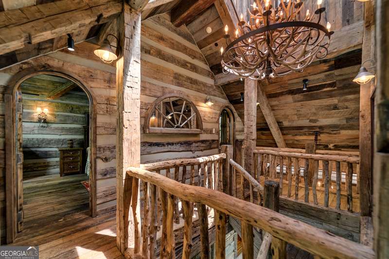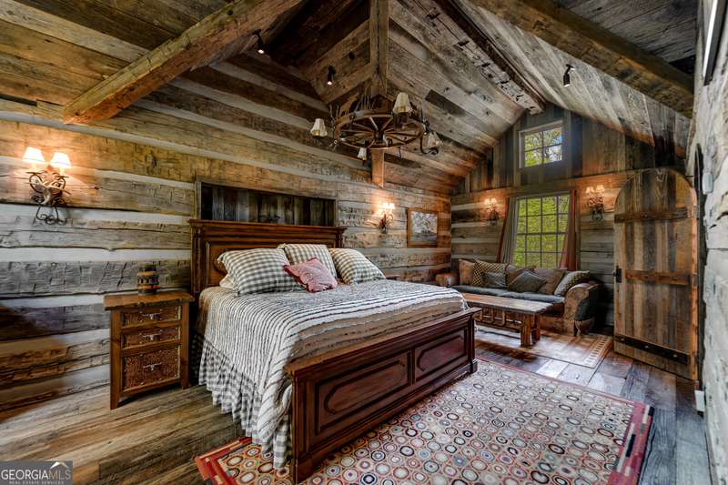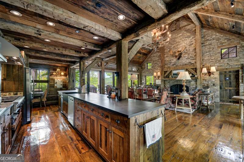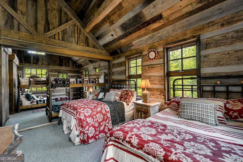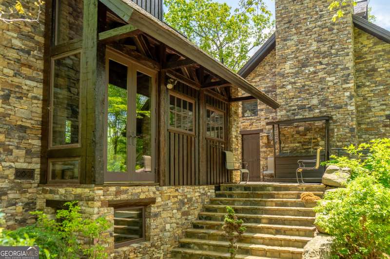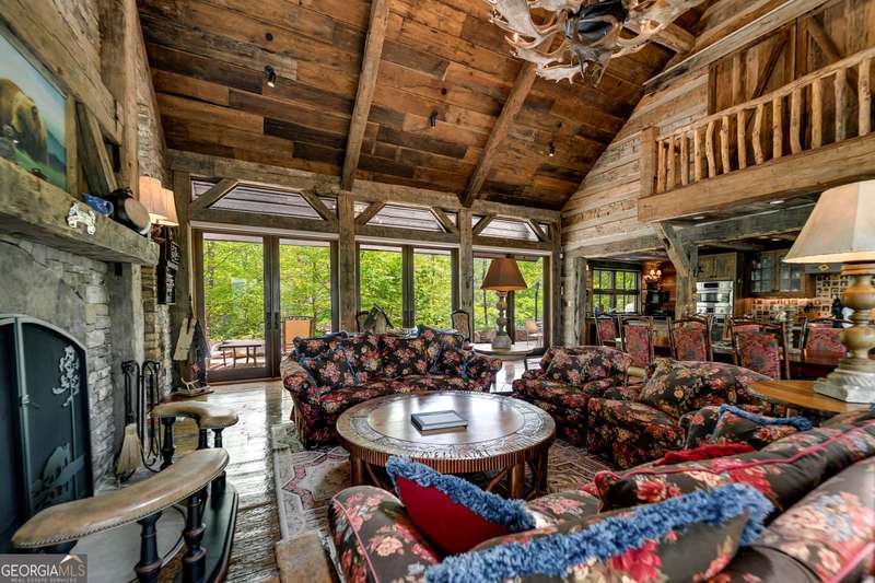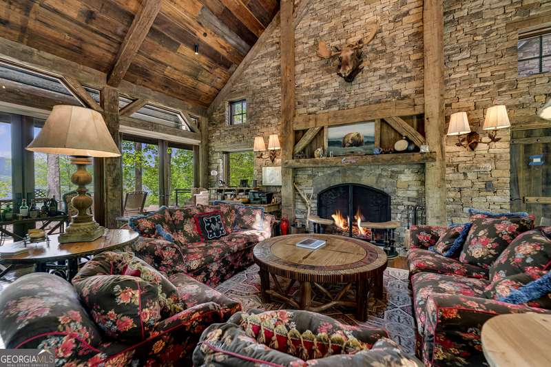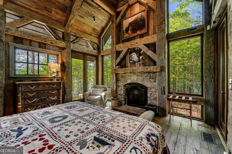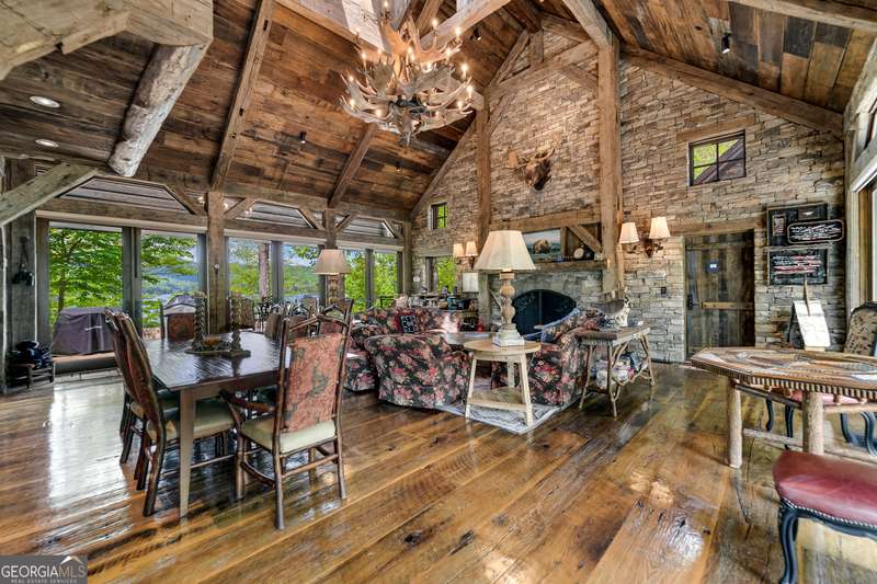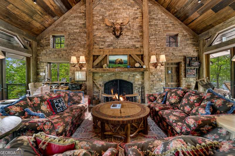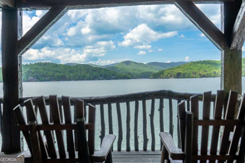 Once-in-a-Lifetime Private Island Estate on Lake Burton Discover the pinnacle of lakeside luxury with this extraordinary 6,186 sqft mountain lodge, perched on its own private island in the heart of Lake Burton's coveted big basin. Offering 360- degree lake and mountain views, total privacy, and Yellowstone-inspired rustic elegance, this one-of-a-kind estate redefines waterfront living. Crafted from reclaimed timbers sourced from Southern cotton mills, the residence exudes old-world craftsmanship and frontier charm. Hand-hewn oak siding with classic chinking, dry stack Tennessee fieldstone, rough-sawn wide plank oak floors, and steel structural supports anchor the home with strength and character. An elegant entry foyer welcomes you from two directions, showcasing east and west views through an open riser staircase with reclaimed treads and flagstone flooring. The soaring great room features lake views from 2 walls, a dramatic cupola, flanking fireplace posts reclaimed from Zachary Taylor Scott's historic home, and a moose antler chandelier complete with a buckshot hole. The chef's kitchen blends style and substance with black soapstone countertops, custom barn wood cabinetry, Viking 6-burner range, dual Bosch dishwashers, refrigerator drawers, custom soapstone sinks and two pantries. The private owner's suite features 3 walls of lake views, a barn wood clad vaulted ceiling and stone fireplace. Each guest bedroom offers unique views and details. The main floor provides 2 guest bedrooms, each with chinked log walls and a private bath. Upstairs, a clever bunk room offers access from 2 separate hallways with a full bath on each end. A large hidden pocket door opens to separate the space into 2 separate bunkrooms when desired. A library with a vaulted ceiling and lake views is currently styled as another guest bedroom upstairs. The terrace level offers a spacious yet cozy media room with a wall of bunk beds against the back wall, a kitchenette with a full fridge/freezer combo, range, sink and dishwasher and laundry room with sink. The gym was designed to mirror the upstairs bunk room, featuring full bathrooms on each end. This space could easily be converted into 2 separate guest bedrooms with the addition of a wall. Outdoors, expansive flagstone patios wrap the home offering views from all directions. Meandering trails of recycled tire wrap the Island, leading to the east wharf and swim dock, putting green, and west side 2-story, 2-stall covered boathouse overlooking one of the most epic sunset views on Lake Burton. Additional Details include: self-contained fire suppression system, copper-clad Kolbe windows, antique terracotta tile, LiteTouch lighting system, extensive security system, 1GB Fiber Optic Internet, slate roof, lightning rods, Generator, central vac. Proof of Funds required before showing. There are security surveillance cameras throughout the island. Do not attempt to access the property without listing agent being present.