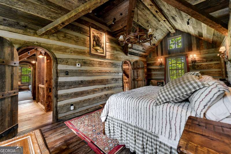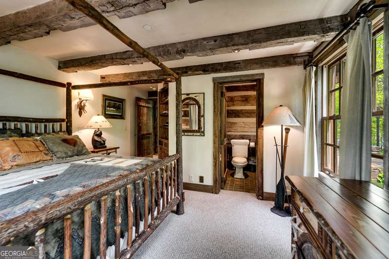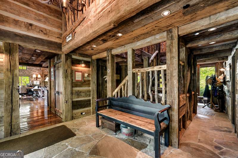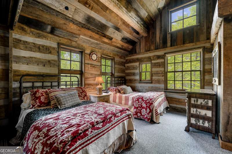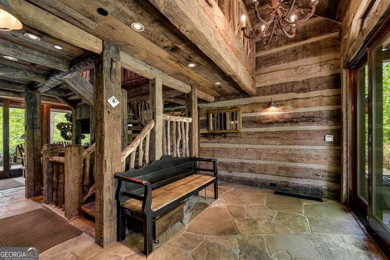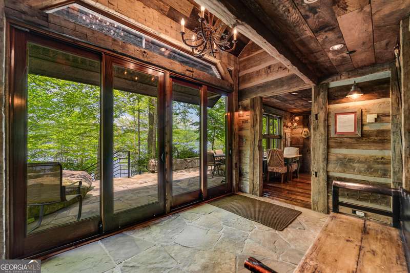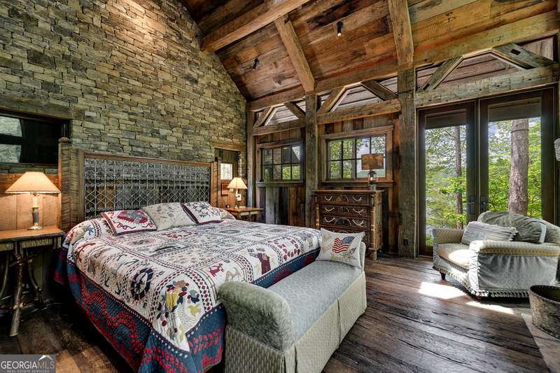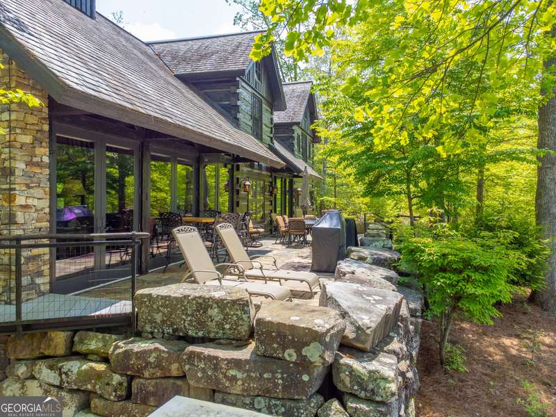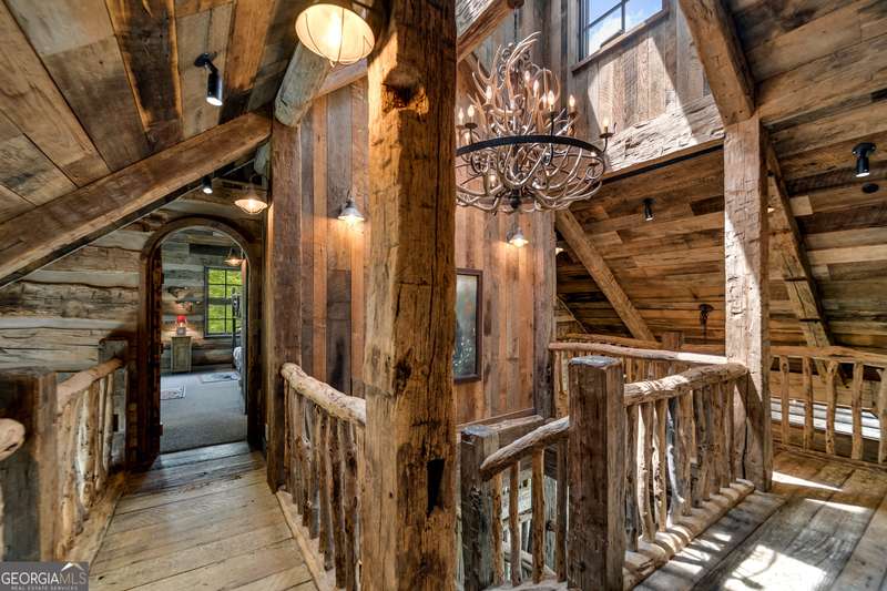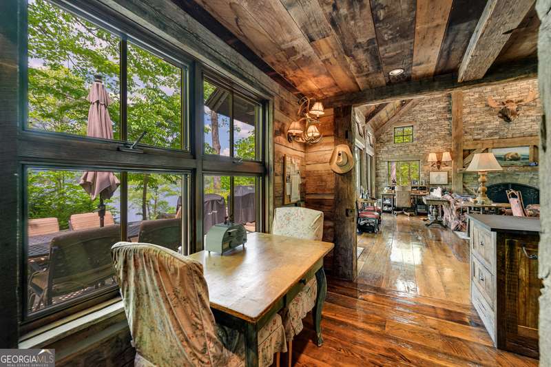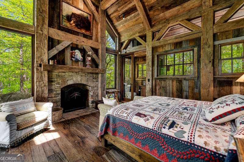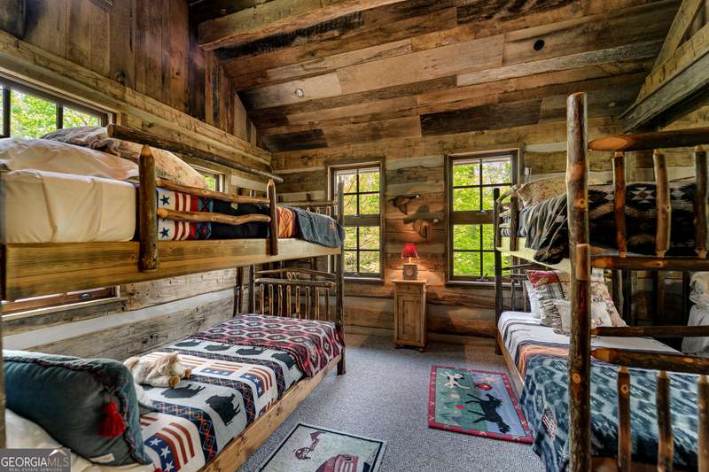 Once-in-a-Lifetime Private Island Estate on Lake Burton Discover the pinnacle of lakeside luxury with this extraordinary 6,186 sqft mountain lodge, perched on its own private island in the heart of Lake Burton's coveted big basin. Offering 360- degree lake and mountain views, total privacy, and Yellowstone-inspired rustic elegance, this one-of-a-kind estate redefines waterfront living. Crafted from reclaimed timbers sourced from Southern cotton mills, the residence exudes old-world craftsmanship and frontier charm. Hand-hewn oak siding with classic chinking, dry stack Tennessee fieldstone, rough-sawn wide plank oak floors, and steel structural supports anchor the home with strength and character. An elegant entry foyer welcomes you from two directions, showcasing east and west views through an open riser staircase with reclaimed treads and flagstone flooring. The soaring great room features lake views from 2 walls, a dramatic cupola, flanking fireplace posts reclaimed from Zachary Taylor Scott's historic home, and a moose antler chandelier complete with a buckshot hole. The chef's kitchen blends style and substance with black soapstone countertops, custom barn wood cabinetry, Viking 6-burner range, dual Bosch dishwashers, refrigerator drawers, custom soapstone sinks and two pantries. The private owner's suite features 3 walls of lake views, a barn wood clad vaulted ceiling and stone fireplace. Each guest bedroom offers unique views and details. The main floor provides 2 guest bedrooms, each with chinked log walls and a private bath. Upstairs, a clever bunk room offers access from 2 separate hallways with a full bath on each end. A large hidden pocket door opens to separate the space into 2 separate bunkrooms when desired. A library with a vaulted ceiling and lake views is currently styled as another guest bedroom upstairs. The terrace level offers a spacious yet cozy media room with a wall of bunk beds against the back wall, a kitchenette with a full fridge/freezer combo, range, sink and dishwasher and laundry room with sink. The gym was designed to mirror the upstairs bunk room, featuring full bathrooms on each end. This space could easily be converted into 2 separate guest bedrooms with the addition of a wall. Outdoors, expansive flagstone patios wrap the home offering views from all directions. Meandering trails of recycled tire wrap the Island, leading to the east wharf and swim dock, putting green, and west side 2-story, 2-stall covered boathouse overlooking one of the most epic sunset views on Lake Burton. Additional Details include: self-contained fire suppression system, copper-clad Kolbe windows, antique terracotta tile, LiteTouch lighting system, extensive security system, 1GB Fiber Optic Internet, slate roof, lightning rods, Generator, central vac. Proof of Funds required before showing. There are security surveillance cameras throughout the island. Do not attempt to access the property without listing agent being present.
