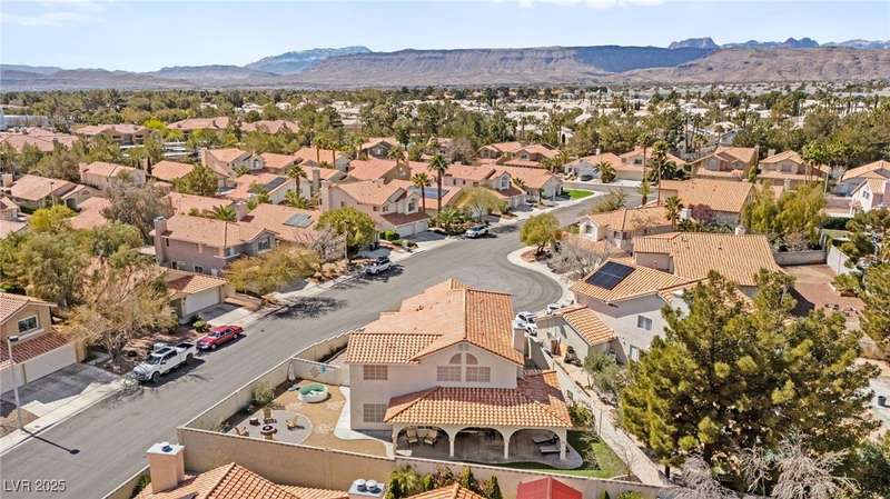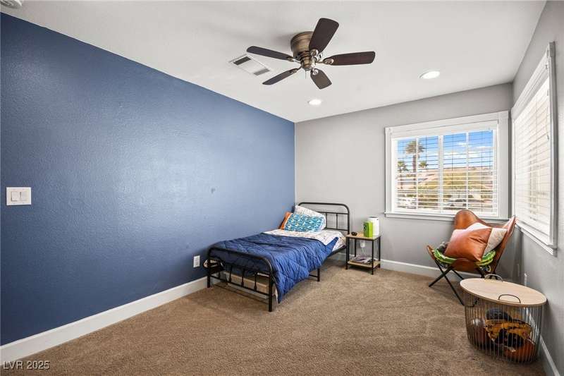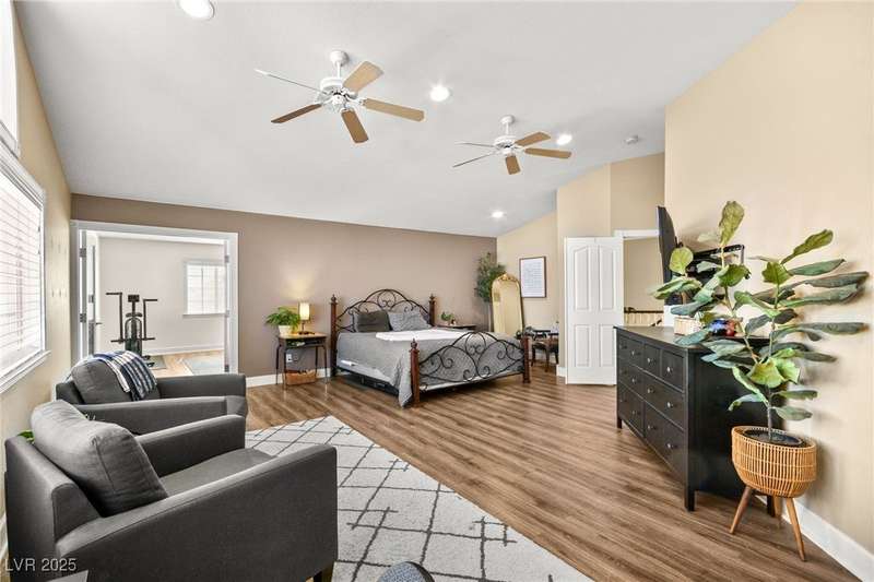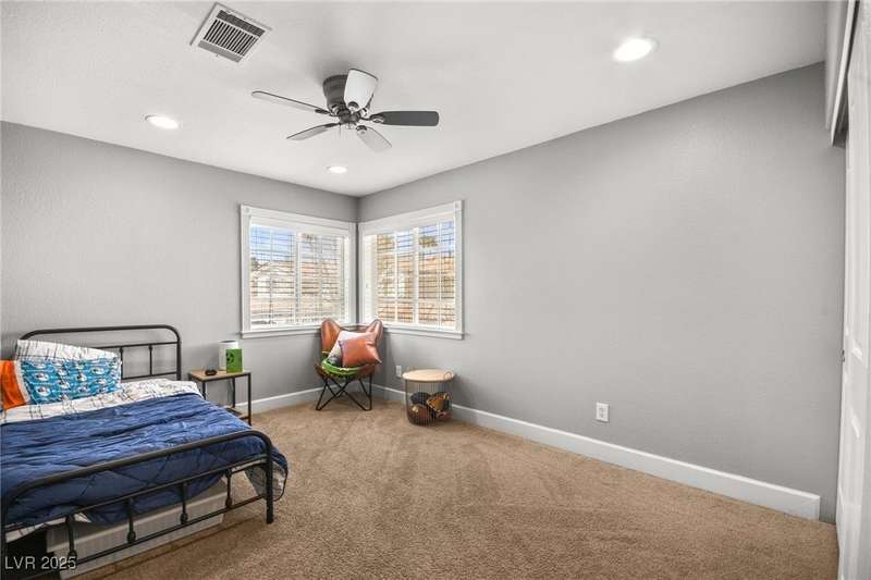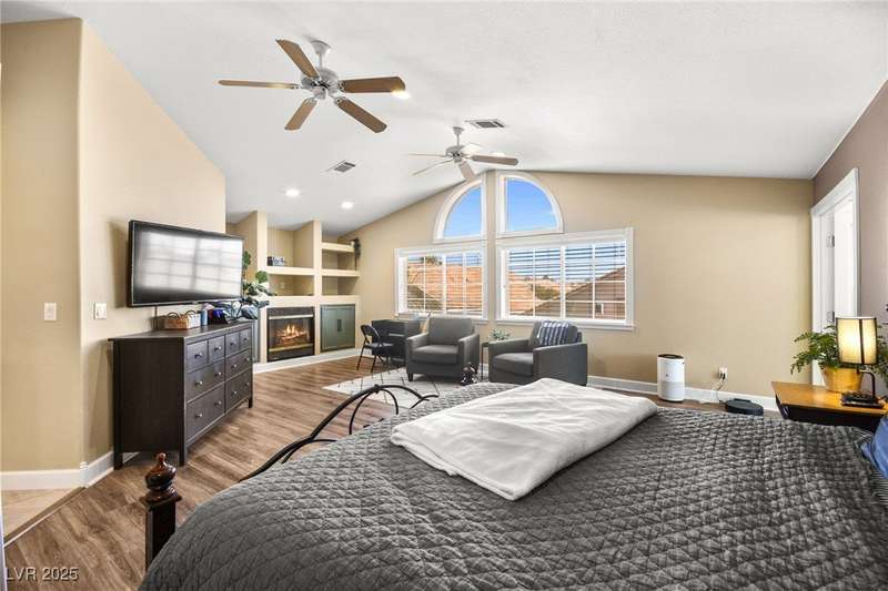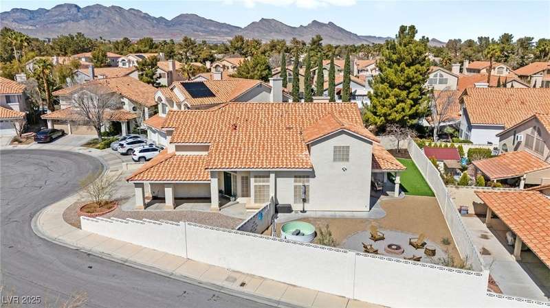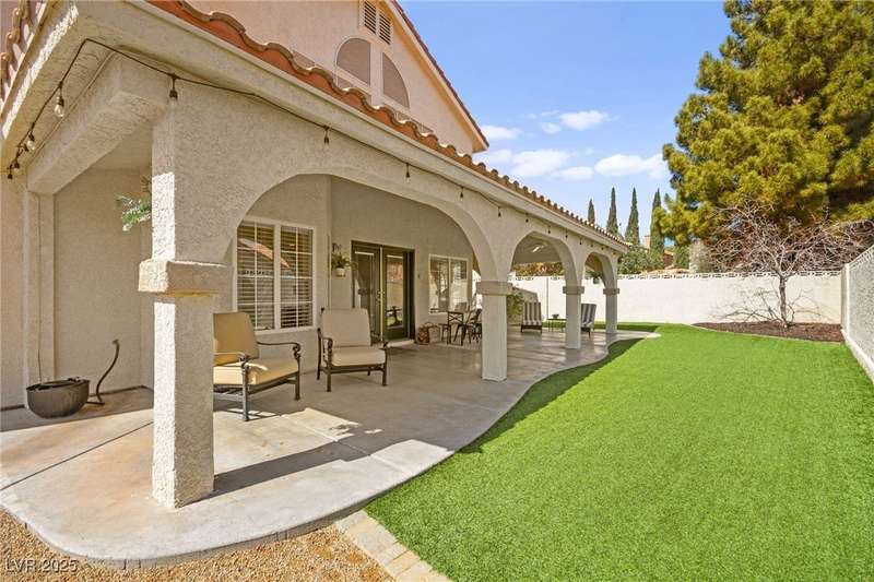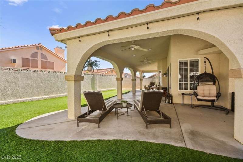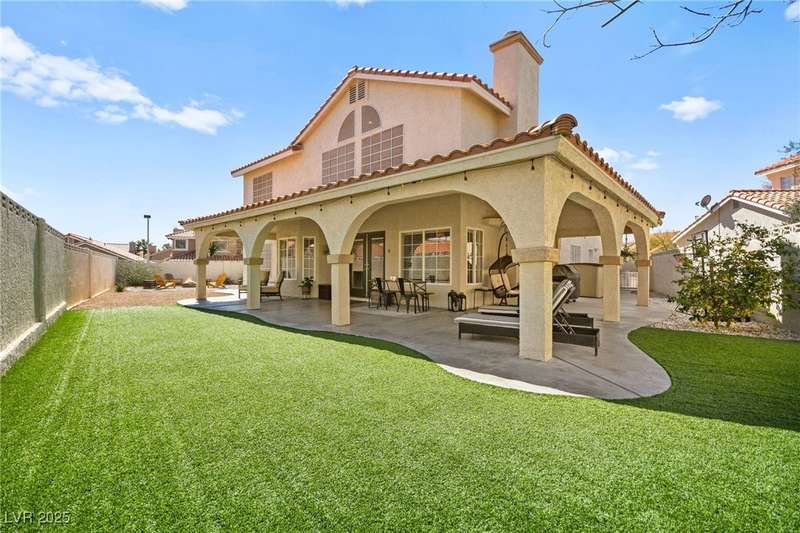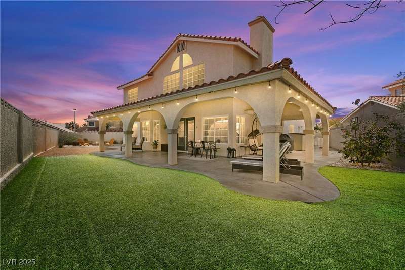 Welcome to an exquisitely turnkey corner lot home in Peccole Ranch. It boasts one of the largest floorplans in the subdivision at over 3000 sq ft of living space and the only home in the neighborhood with recessed exterior lights along with a fully wrapped around patio and massive side yard with firepit. The primary bedroom is immensely spacious including a sitting area with fireplace and large windows bringing in natural light in addition to the attached room for flex space for exercise room, office, nursery, or den. Downstairs entry door opens up to high ceilings leading into the living room and formal dining area. Kitchen connects the family room with breakfast nook for additional lounging area. There is a bedroom downstairs with a full bathroom excellent for guests. Please reach out for a tour of this rare phenomenal home today!