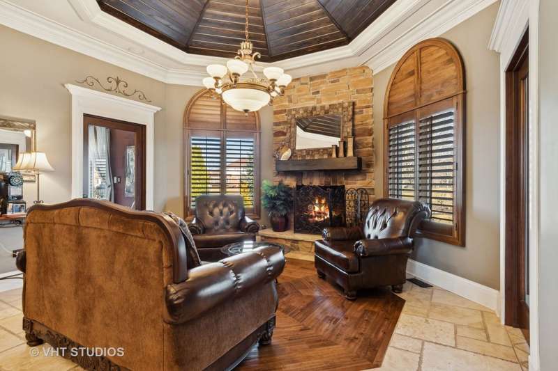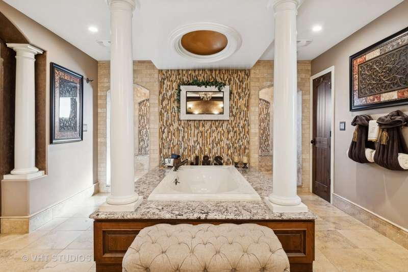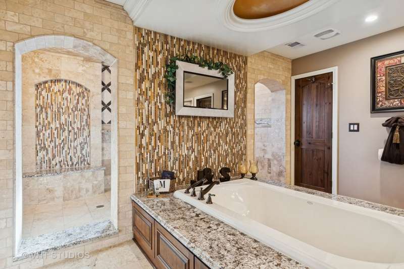 Absolutely beautiful and filled with details you need to see to appreciate. The custom craftmanship is unparalleled. Located at the end of a cul-de-sac the tranquil setting and amazing entrance set the stage for what's inside. LOVELY front doors welcome you into the spacious entry with travertine flooring and 10' ceilings. Each and every room has exceptional detailing from the ceiling treatments down to the flooring. The exceptionally appointed Gourmet kitchen is as lovely as it is functional. Thermador appliances help make meal prep and entertaining effortless. Gorgeous custom cabinetry is enhanced by the massive center island, with prep sink, ample 3 thick granite counters, abundant cabinets, coffee bar, pot filler, and butler area. Adjoining breakfast room as well as a hearth room make this kitchen the absolute heart of the home. Custom wooden ceiling treatments in the hearth room is enhanced by the matching flooring. Step down into the main level family room for even more living and entertaining space. Every room without exception has multiple details to behold. 2 sunrooms located on either side of the hearth room with access to the private yard. The executive office on the main level provides privacy and a comfortable working environment. The immense primary bedroom has an elegance all it's own. Custom ceiling treatments, cove lighting, elegant fireplace, sitting room, outside deck, and coffee bar, enhance this space. Pamper yourself in the 'spa' like bath with whirlpool-complete with tv mirror-double sink vanity and an enormous walk in shower complete with multiple shower heads. Organizing your closet has never been easier with the spacious custom closet system. There are 2 additional bedrooms with a jack and jill bath and a princess suite upstairs as well. Full laundry upstairs has multiple storage cabinets. There is an additional laundry area-with a doggie wash-on the main level. So much additional exceptional living space in the lower level with 9'5 ceilings...exercise room, 5th bedroom, full bath, wet bar, gaming area, tv area, and full theater room complete the interior of this gorgeous home. The theater room includes an HVAC split to keep this room temperature controlled at all times. The 3 car heated garage has 14' ceilings, ceiling fans, custom tile flooring, expansive workbench, and plenty of organized storage. Dog run right outside the garage door. The outdoor entertainment paradise is simply that. Custom kitchen area, paver patio, fire pit, fenced in yard, and lush landscaping create your very own outdoor wonderland. This is your own personal paradise, but close to great restaurants, entertainment, and expressways.
