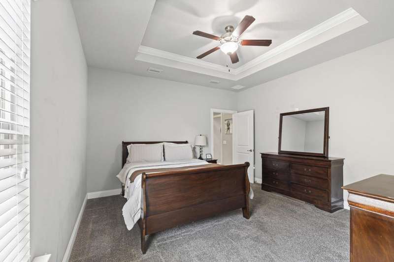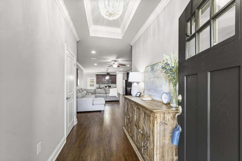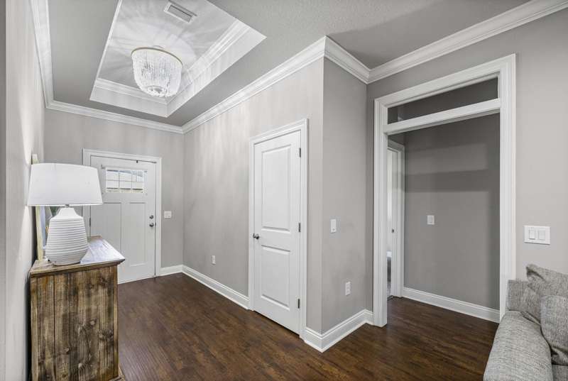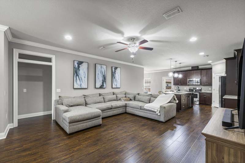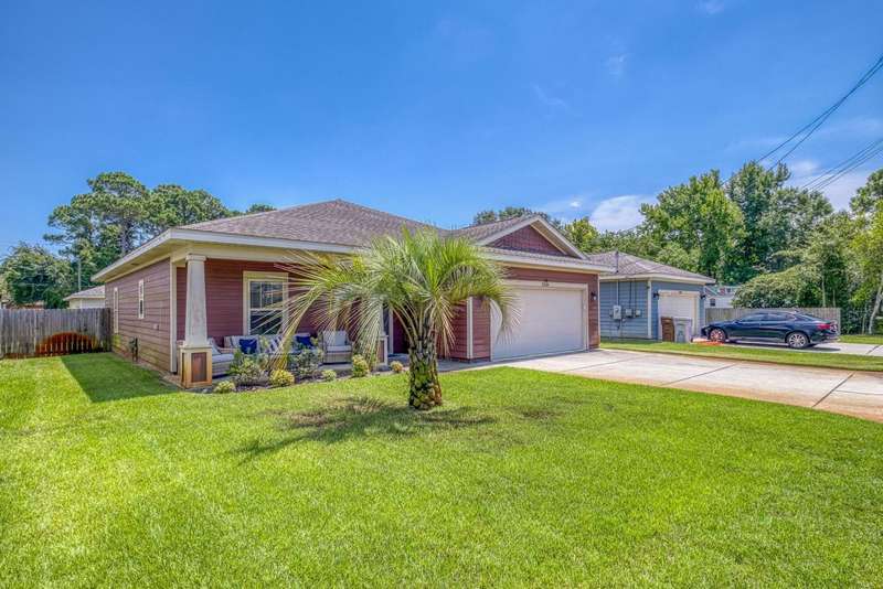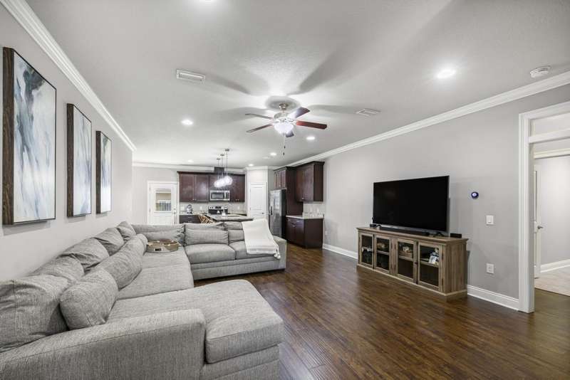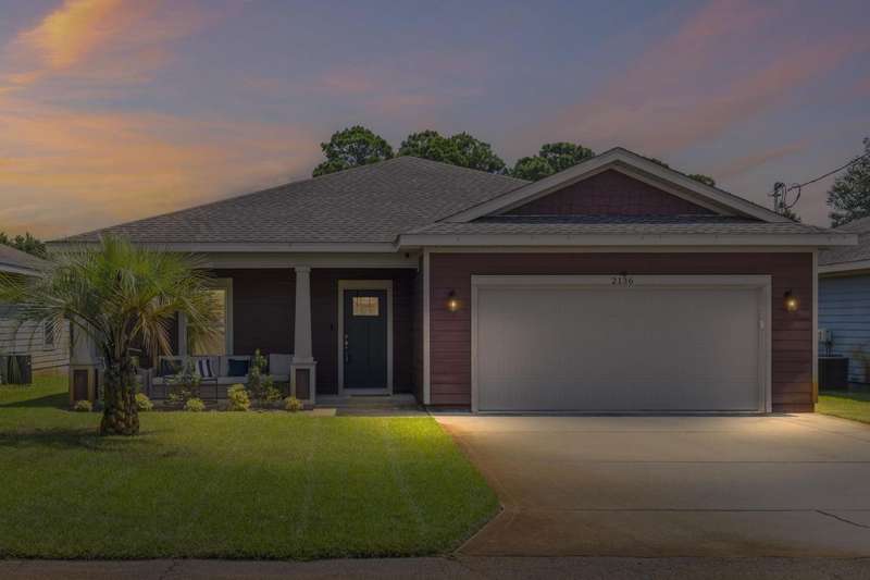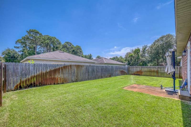 Move-in ready 3 bedroom, 2 bathroom single-family home with 1623 sq ft of living space. Built in 2015, this property offers No HOA and sits on a quiet street in Navarre. Inside you'll find an open floor plan with wood laminate flooring in the main living areas, neutral tile in the wet zones, and carpet in the bedrooms. The primary suite features a tray ceiling, custom walk-in closet with built-ins, and a private bath. Crown molding, wide baseboards, transom windows, and upgraded doors and hardware add detail throughout. The kitchen features granite countertops, stainless steel appliances, breakfast bar seating along with a separate dining room, plenty of cabinet space and a pantry. The exterior is clad in durable Hardie board with an architectural shingle roof. Outdoor features include a covered front porch, fenced backyard, sprinkler system, and two-car garage. Located in East Navarre close to Hurlburt Field, Eglin AFB, shopping, schools, dining, and the white sand beaches of Navarre.
