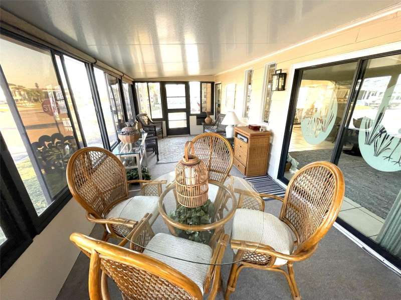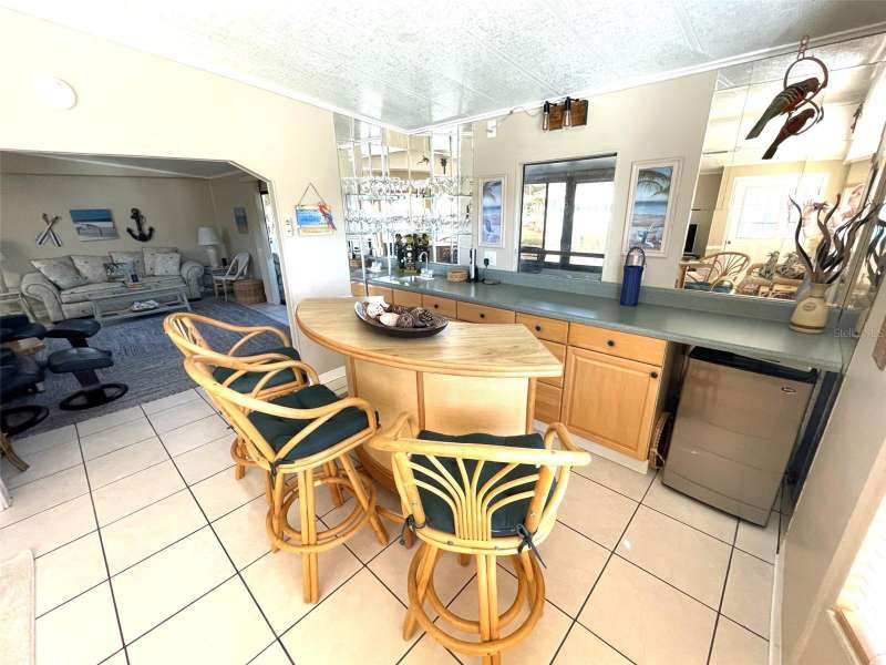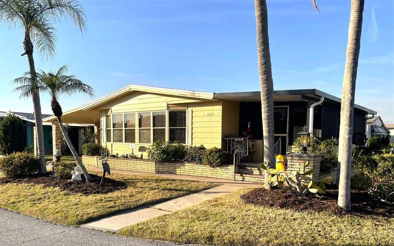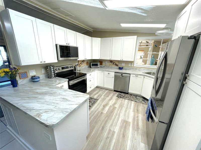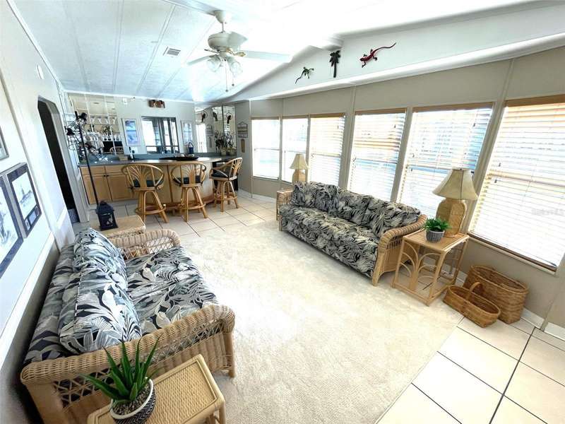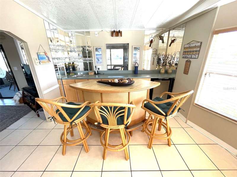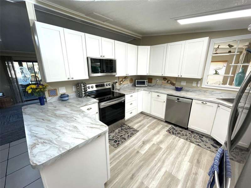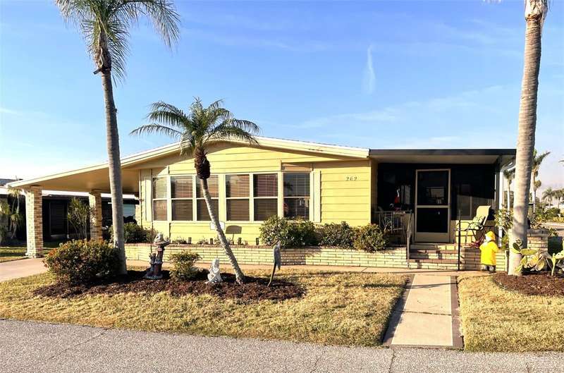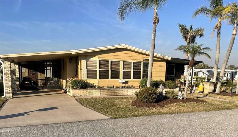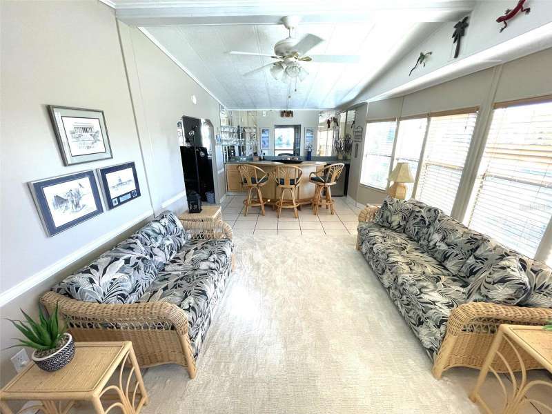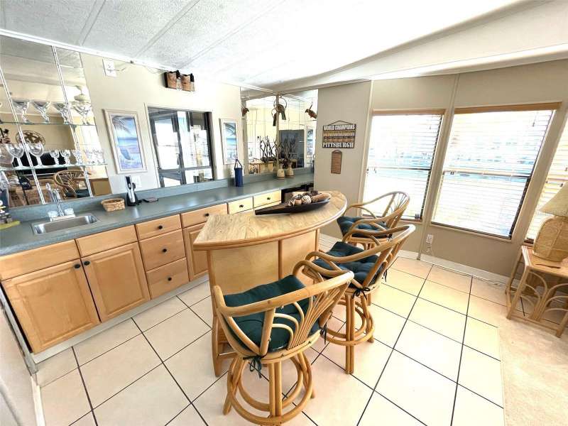 Nestled on a desirable corner lot in the sought-after, resort-style community of Harbor Isles, this unique and spacious 2-bedroom, 2-bathroom manufactured home offers an abundance of living and entertaining space. The thoughtfully designed layout features a bright and inviting family room with an amazing built-in bar—perfect for entertaining guests—as well as a spacious living room that seamlessly connects to an extra-long Florida room with acrylic windows, allowing for year-round enjoyment. The newly remodeled kitchen is a standout, boasting solid wood cabinets, stunning countertops, and brand-new stainless-steel appliances. Tile floors installed over ¾-inch plywood subfloors ensure both durability and style throughout the home. Vaulted ceilings and skylights enhance the open, airy feel while bringing in an abundance of natural light. The primary suite is a private retreat, offering two closets—including a large walk-in—and a spacious ensuite bath. A second bedroom and full bath provide ample space for family or guests. Step outside to the expansive screened-in lanai, ideal for enjoying Florida’s gorgeous winter days. Just off the lanai, a large storage shed houses the laundry area, complete with a built-in utility sink. Additional upgrades include a brand-new roof, a brand-new AC system, and fresh exterior paint (2022), making this home truly move-in ready. Harbor Isles is an exceptional, waterfront, 55+ gated community offering resort-style amenities and an active lifestyle. Residents enjoy a heated pool and spa, fitness center, tennis and pickleball courts, shuffleboard, bocce ball, and a spacious clubhouse with a vibrant social calendar. The community also features a private marina with boat slips, a kayak launch, and fishing areas, perfect for enjoying Florida’s coastal lifestyle. Beautifully maintained walking and biking paths wind through the lushly landscaped grounds, providing a picturesque setting for morning strolls or evening relaxation. Conveniently located near shopping, dining, world-class beaches, and cultural attractions, Harbor Isles offers the best of Florida living in a welcoming, friendly environment.