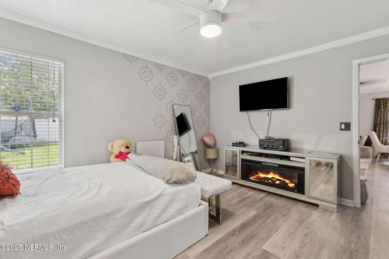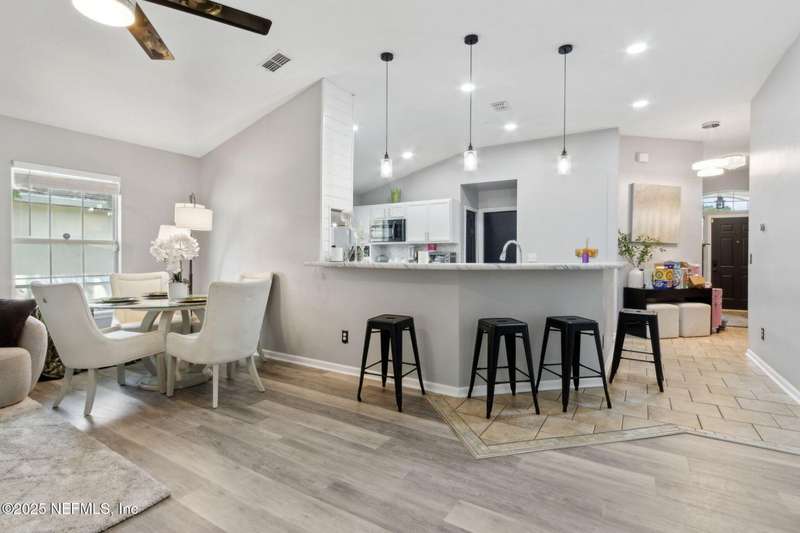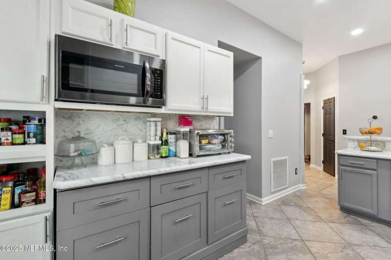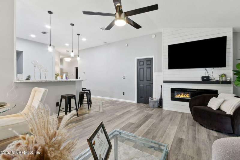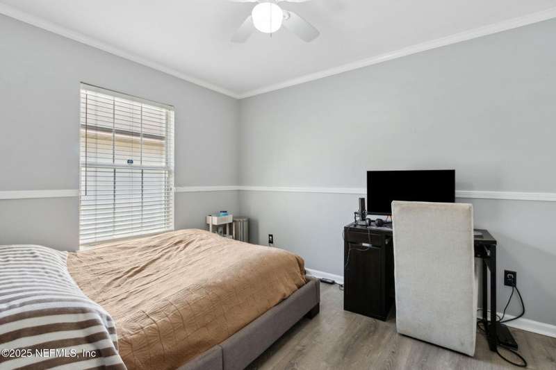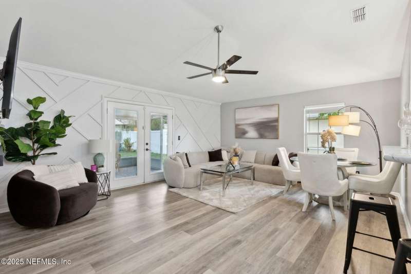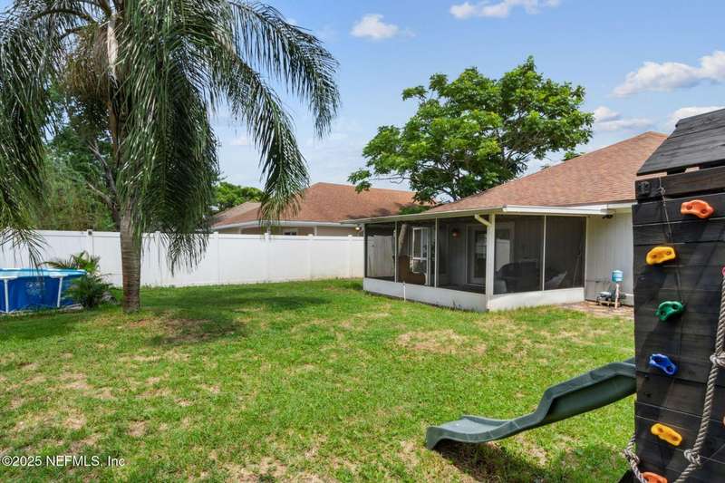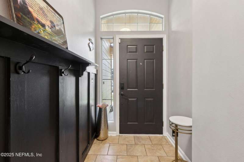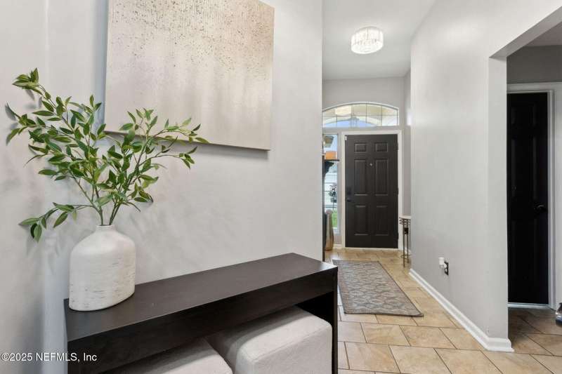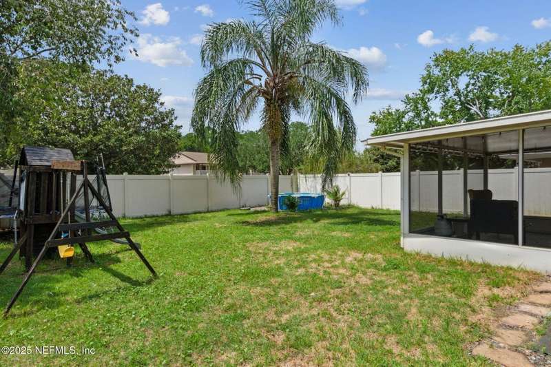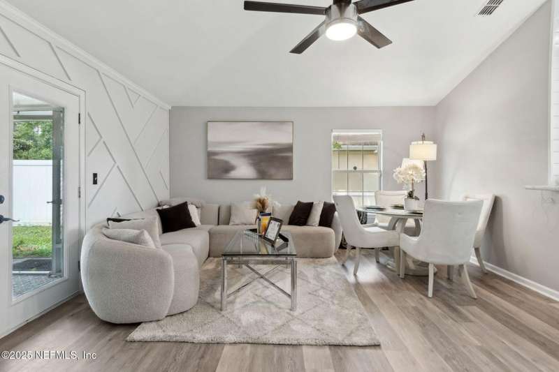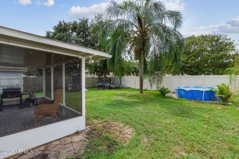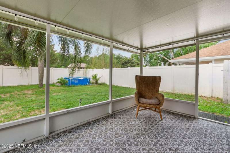 Move-in ready 3-bedroom, 2-bathroom home with a 2-car garage in the desirable Sutton Lakes community. This home features a bright, open layout with abundant natural light, high ceilings, a modern kitchen with stainless steel appliances, and sleek, carpet-free flooring throughout. The fenced backyard includes a screened-in lanai for relaxing outdoor living. Centrally located just minutes to I-295, close to Town Center, downtown, restaurants, shopping, and approximately 15 minutes from the beach.