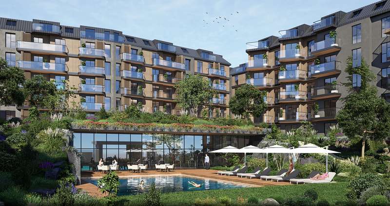 The apartments have an en-suite bathroom, shower cabin, terrace, private garden, open and separate-plan kitchen, built-in kitchen set, balcony, pantry, laundry room, dressing room, steel door, central satellite system, and PVC window systems.