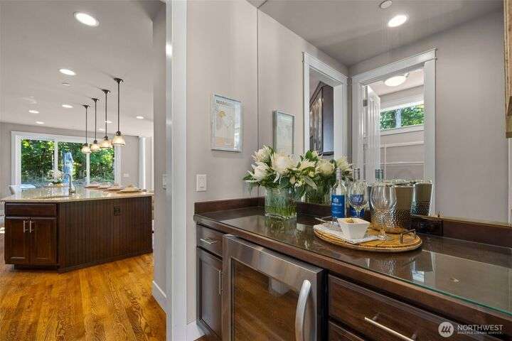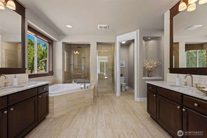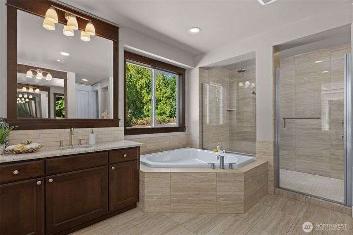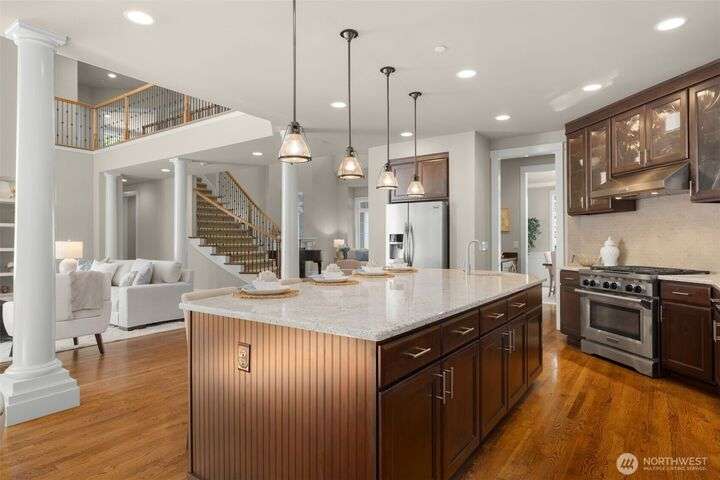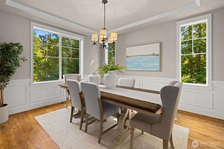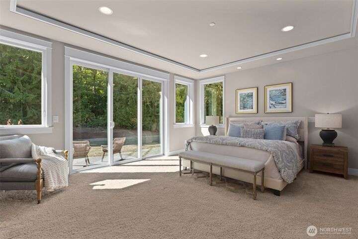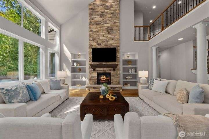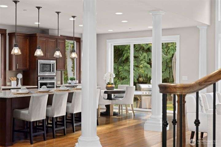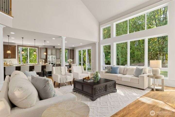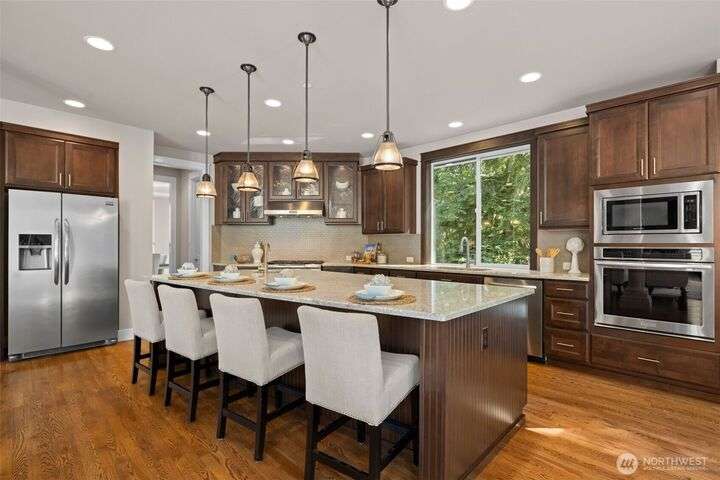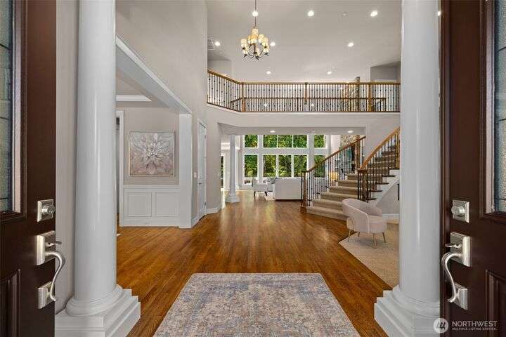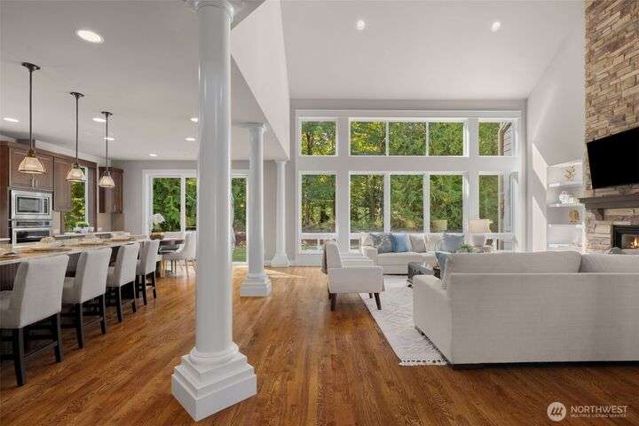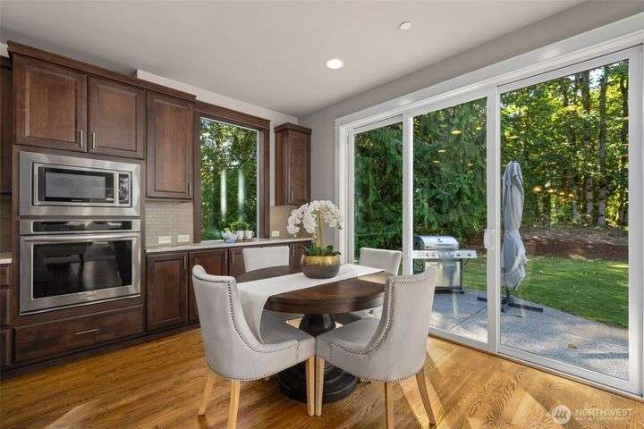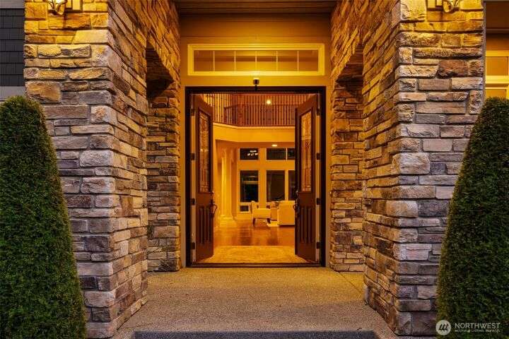 Amid the gated estate neighborhood of Aldarra Ridge, this 2014 Murray Franklyn home rests on nearly 3 acres, embraced by 200+ acres of protected woodlands. Sun-dappled lawns stretch wide, a sanctuary of calm, graced by visiting deer moving gently through the stillness. The enduring Northwest craftsman design offers honey-hued hardwoods, lofty ceilings and crisp millwork. Two-story windows flood the great room with light, where wood and stone radiate warmth. The main-floor primary suite is a serene retreat with garden patio, dual closets, and spa bath. A spacious bonus room, office and oversized 4-car garage provide space for work and play. A life of quiet beauty and rare serenity, just moments from Aldarra Golf Club, Redmond, and Sammamish.