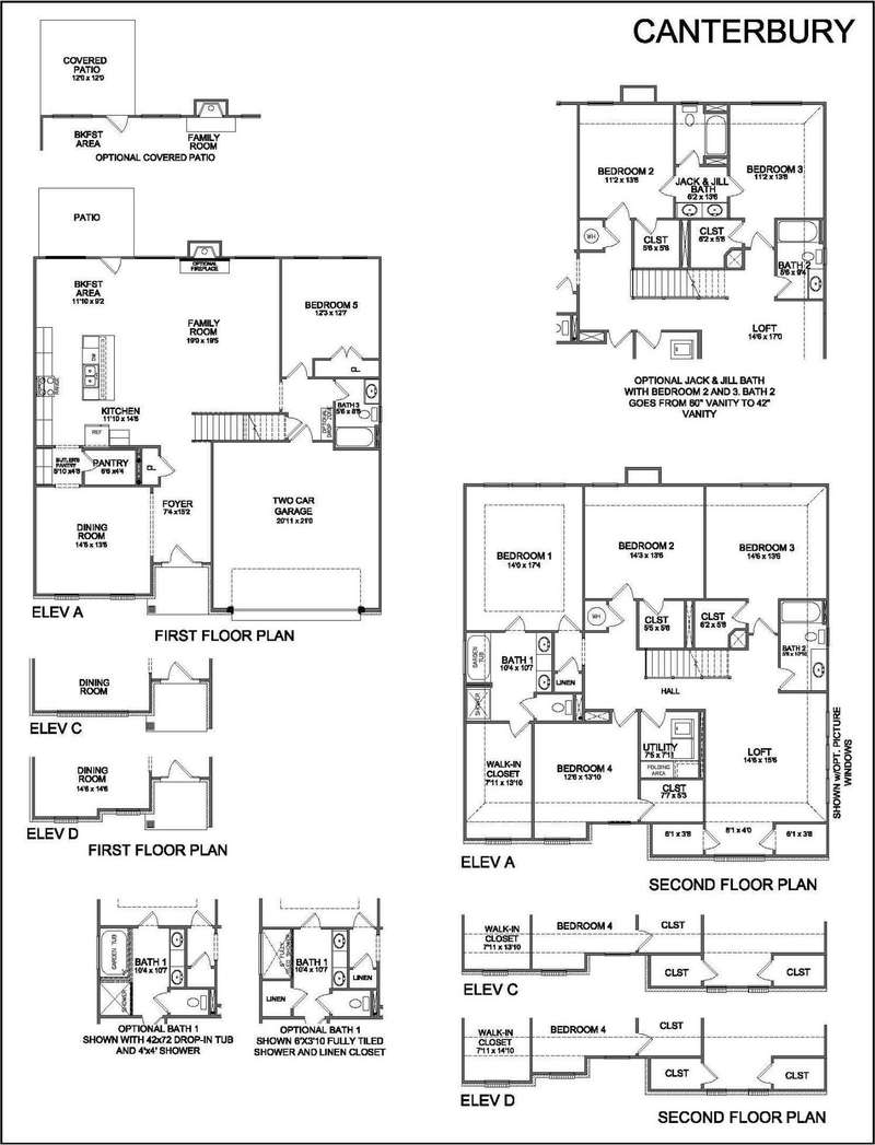 The Canterbury floor plan is a home with room to grow, with five bedrooms, including a first floor bedroom with a full bath, and a primary suite plus four bedrooms and a spacious loft area on the second floor. The main level offers a covered front entry, which leads into the dining room and open family room. The kitchen is open to the living spaces and features an island, butler's pantry, walk-in pantry, and separate breakfast area. An optional drop-zone can be placed off the garage entry. Upstairs, there are three spacious bedrooms surrounding the open loft area with additional storage closets. Bedrooms 2 and 3 also offer a Jack & Jill bath option, making a total of 4 full baths in the home. The upstairs primary bedroom suite is a spacious retreat, with tray ceiling, dual vanity, commode closet, walk-in closet, and multiple tub and shower combinations.