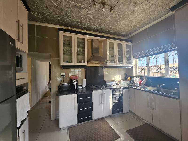 Looking for a Large Family home. Then this Double Storey Is for you. This Family home Is very Spacious, Bright and is a corner stand property. Consisting of 5 bedrooms, 2 bathrooms and a guest toilet . The down stairs has a lounge, dining room, fully fitted kitchen and 2 bedrooms with built in cupboards, one family bathroom and a separate toilet. Upstairs has a huge main bedroom with en suite, two bedrooms with a shower and toilet. There is a outbuilding with two separate bedrooms and a kitchen, Shower and Toilet. It has automated gates and parking for 8 vehicles. Contact Agent For Viewing Arrangements.