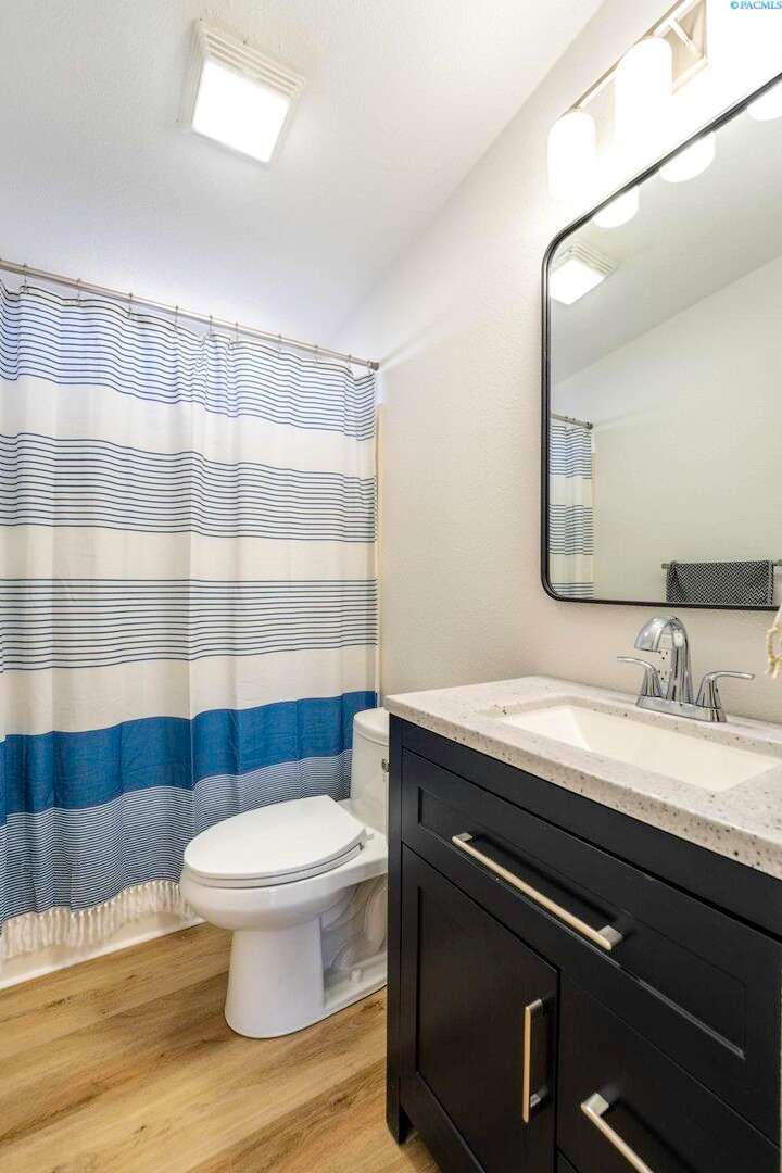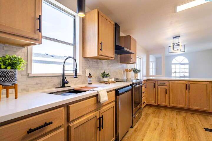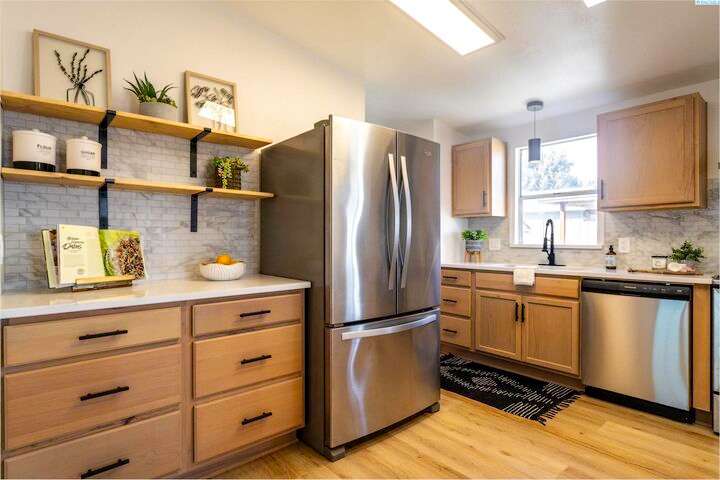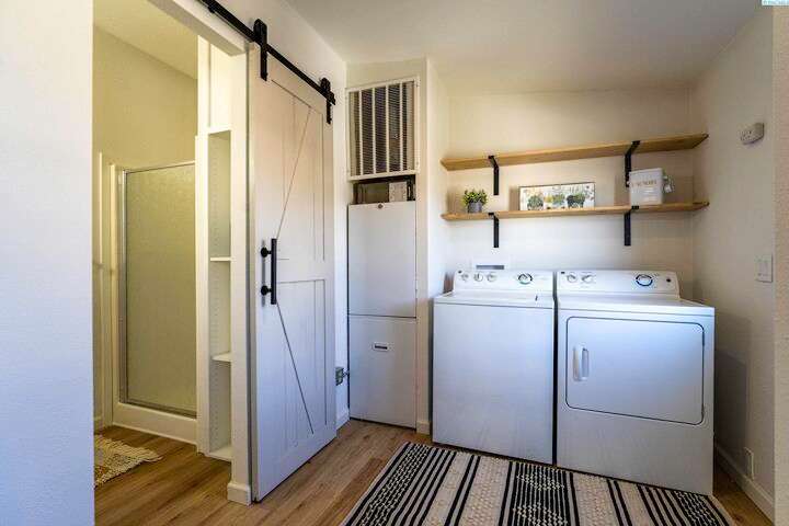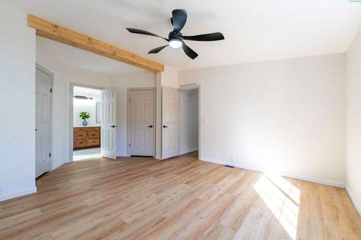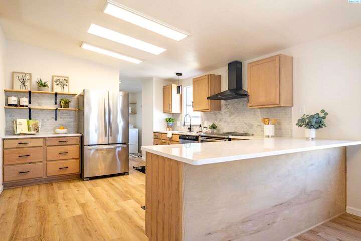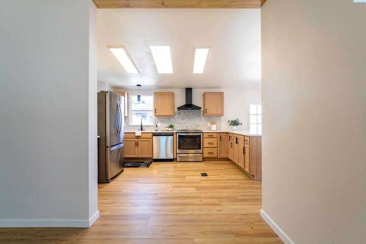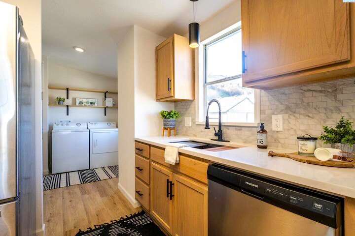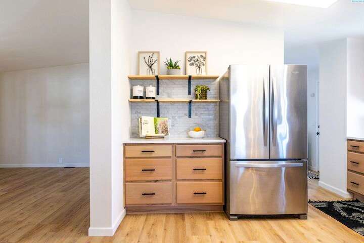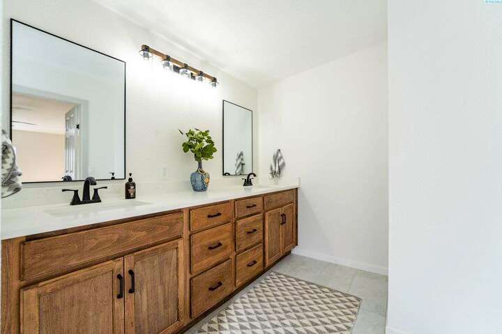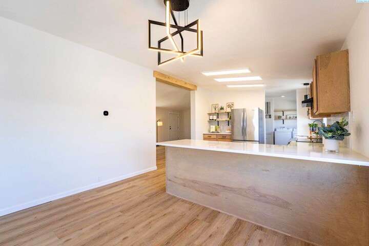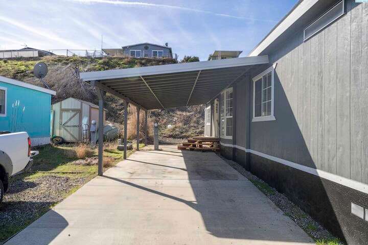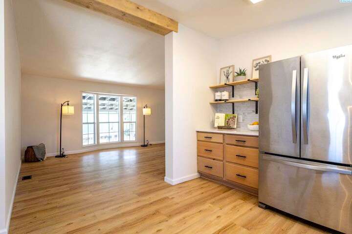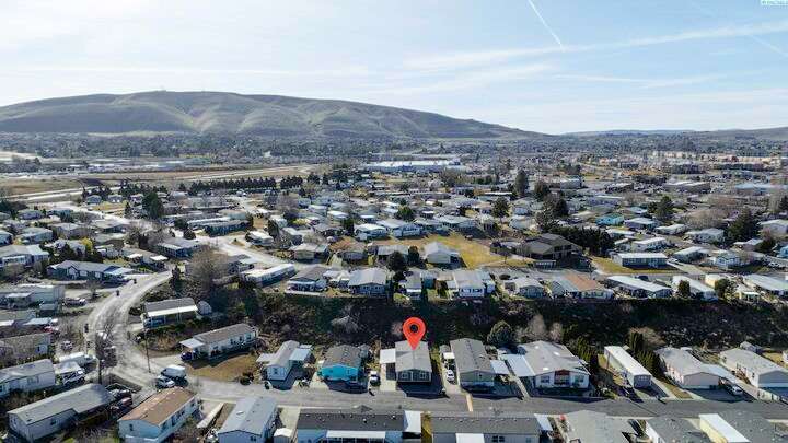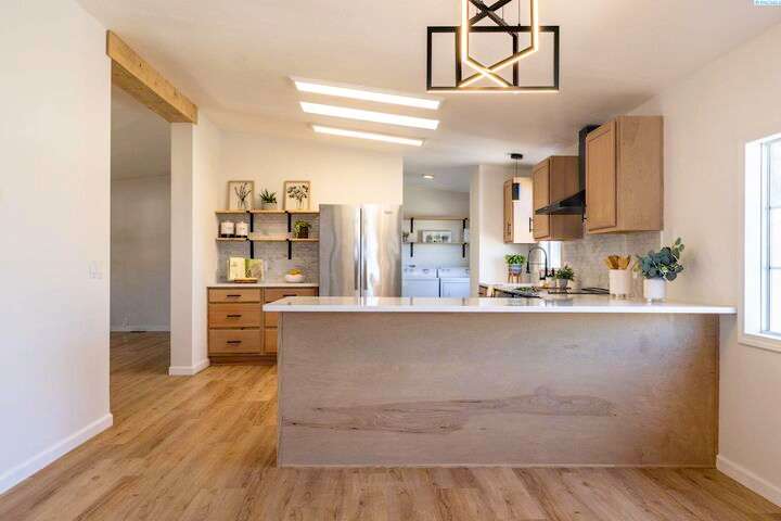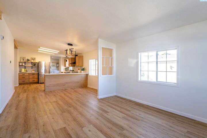 MLS# 286873 Welcome to this nearly new manufactured home, located in The Hills MHP in South Richland, with shopping and freeways just around the corner. This fully updated home features an open floor plan with vaulted ceilings, two living areas, three bedrooms, and three bathrooms. The spacious kitchen boasts vaulted ceilings, quartz counter tops, spacious breakfast bar and brand-new stainless steel appliances. The luxurious primary suite includes his-and-hers walk-in closets and a large en-suite bathroom with a walk-in shower and a double vanity with quartz countertops. The split floor plan offers two additional bedrooms and a full bath at the front of the home. Outside, you'll find a covered carport, a small grass area off the back porch, and low-maintenance landscaping. Recent updates include: LVP flooring throughout the main living areas and primary bedroom, new carpet in the bedrooms, wood beam accents, fully renovated bathrooms and kitchen, fresh interior and exterior paint, and a new HVAC system.