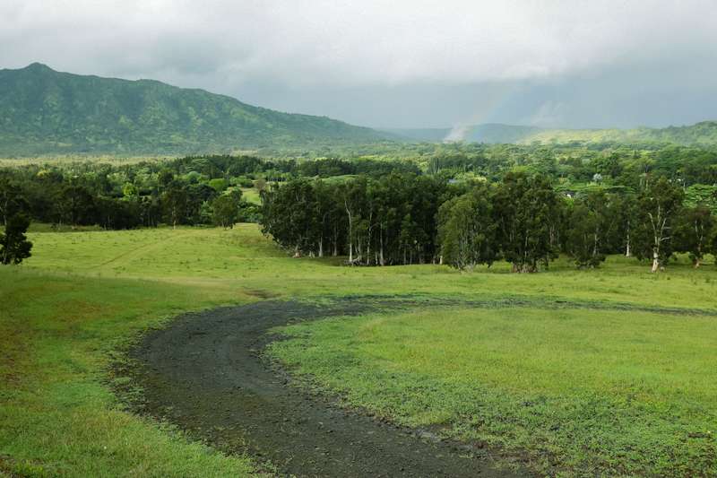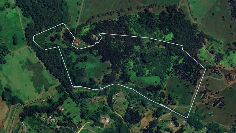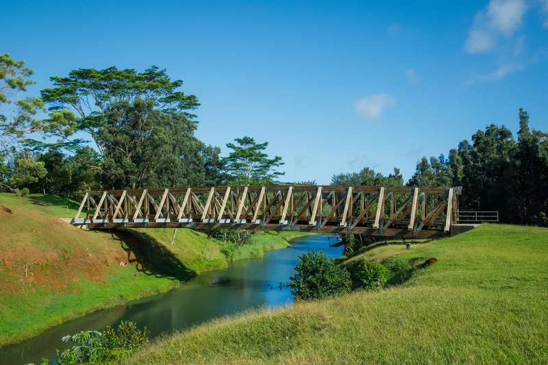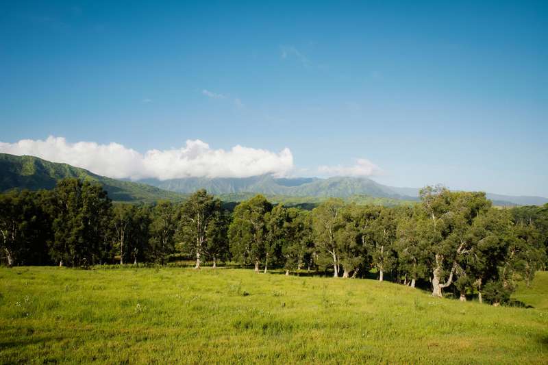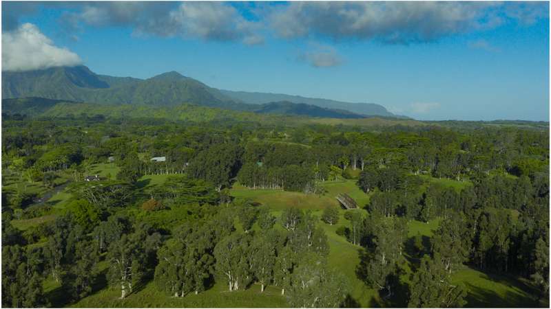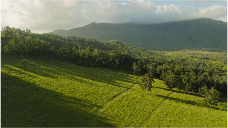 At the base of Mount Namahana, Halaulani spans more than sixty-three acres of rolling pastures, forest edge, and stream valley on Kaua‘i’s North Shore. Accessed by a private truss bridge, the property unfolds across open meadows, ridgelines, and valleys bordered by thousands of feet of deep-flowing, swimmable stream.