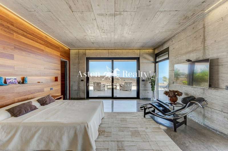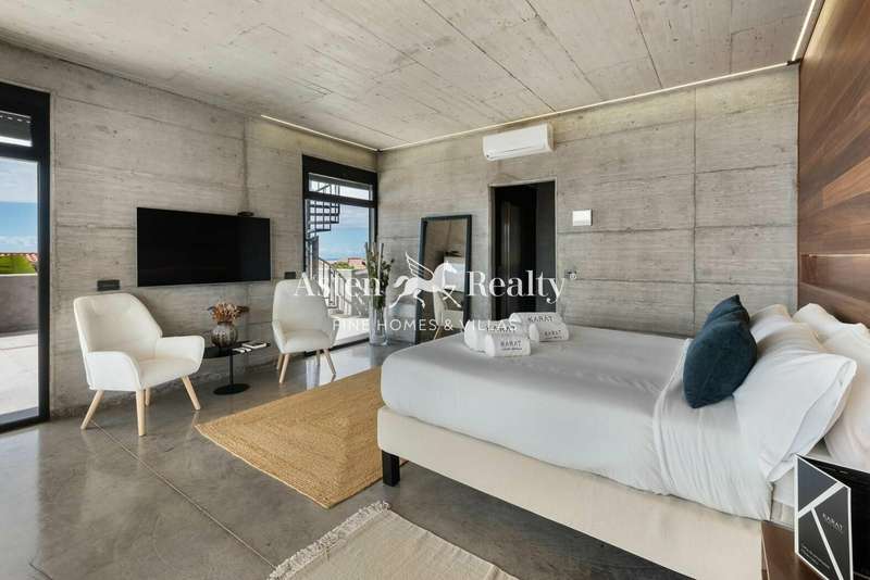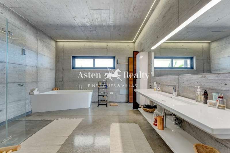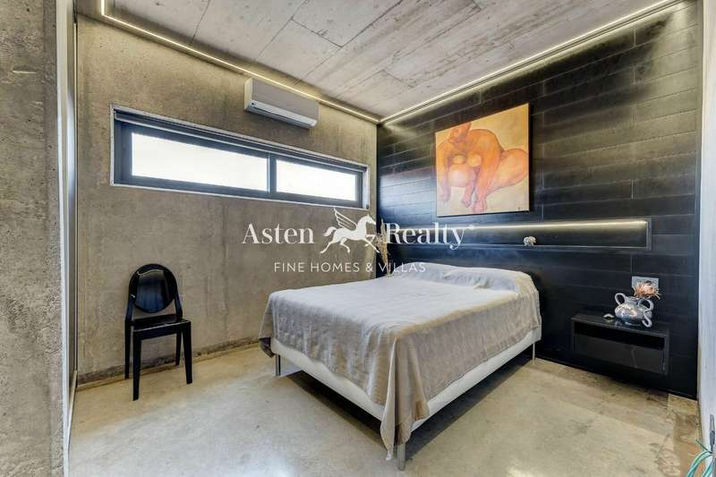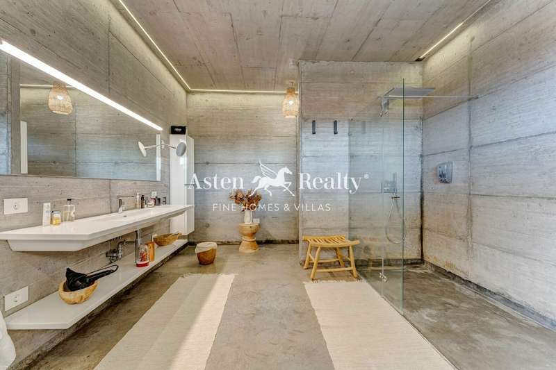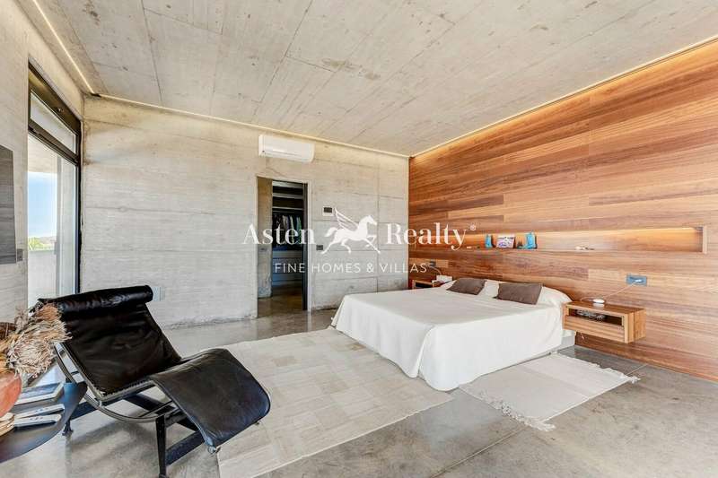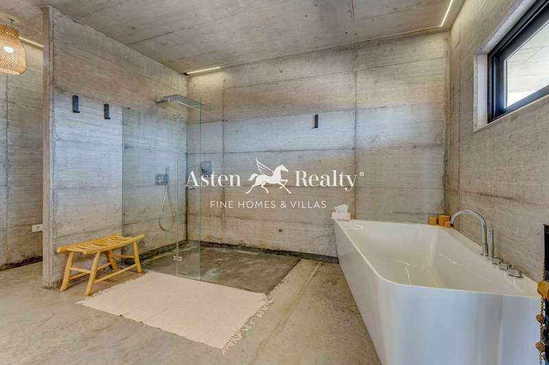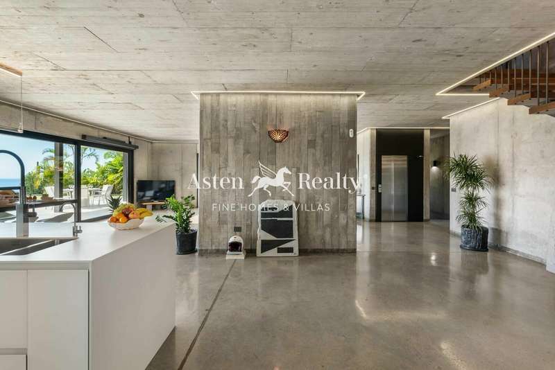 Minimalist brutalist-style villa. The villa was designed on three levels, has a lift, open, bright spaces and is equipped with the latest technology. In the spacious outdoor area there is a large heated infinity pool with stunning sea views, a toilet, a cosy covered area and an exclusive pool house. The villa has a spacious living room with a high-quality open-plan kitchen and a modern home cinema. Each bedroom has its own en-suite bathroom and there is an additional toilet.