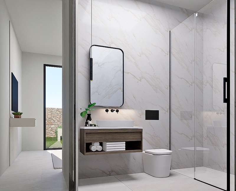 Inside these modern villas on the ground floor, you have a spacious double bedroom with a fitted wardrobe, a bathroom with a walk-in shower, a sizable open-plan kitchen and dining area, and a large living area. Upstairs on the first floor, you have two large double bedrooms both with fitted wardrobes and en-suite bathrooms. On the roof of the villa, you have a 62 m² private rooftop solarium. And finally, in the basement, you have the optional fourth bedroom, bathroom, laundry room, and second living area.