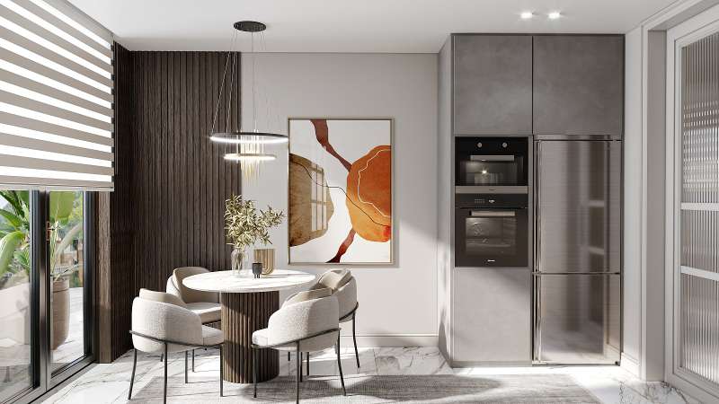 The apartments have an en-suite bathroom, shower cabin, terrace, private garden, open and separate-plan kitchen, built-in kitchen set, balcony, pantry, laundry room, dressing room, steel door, central satellite system, and PVC window systems.