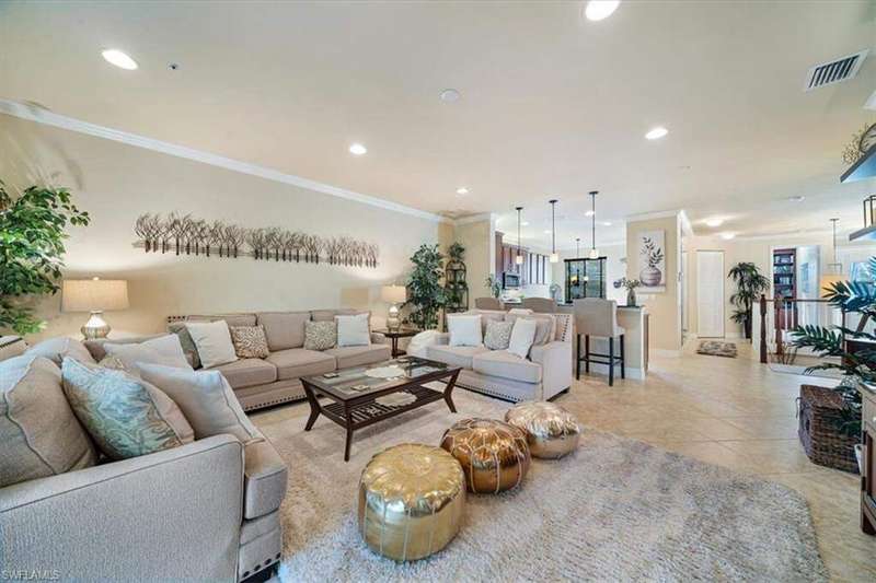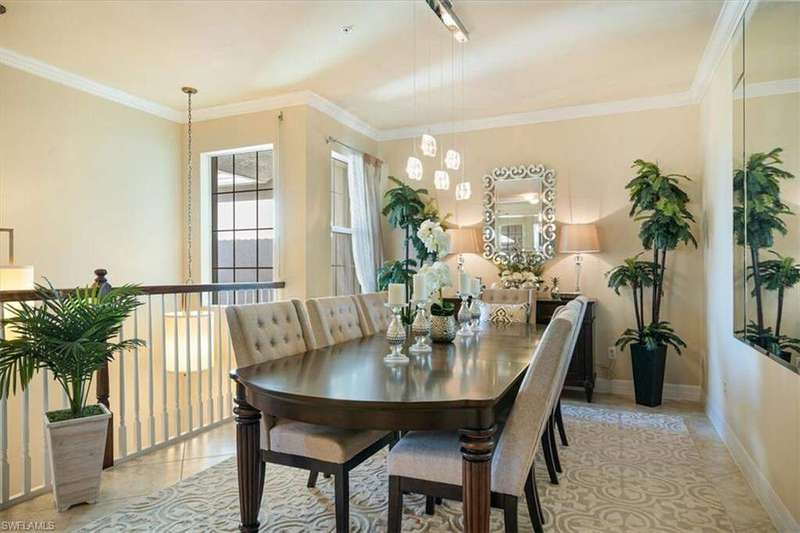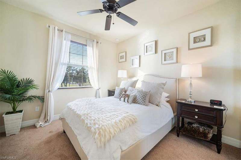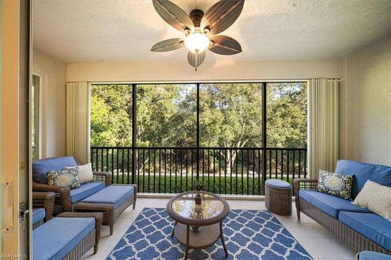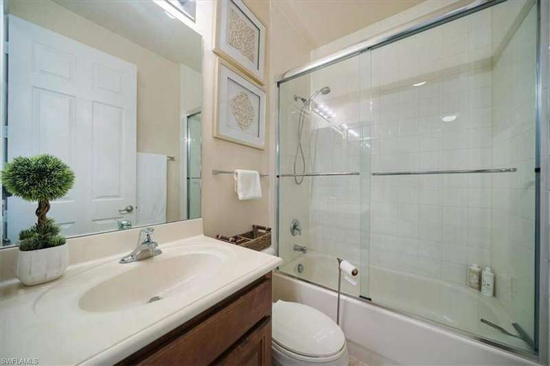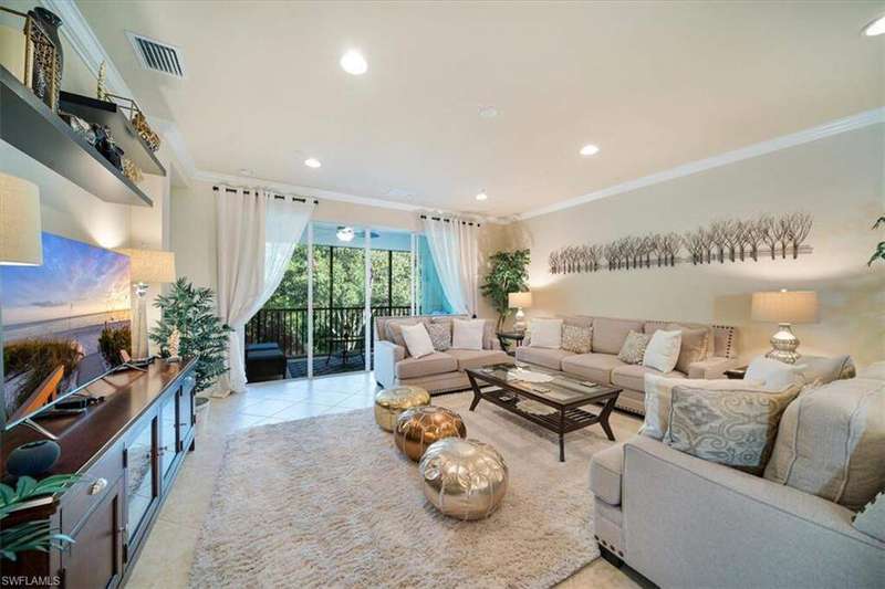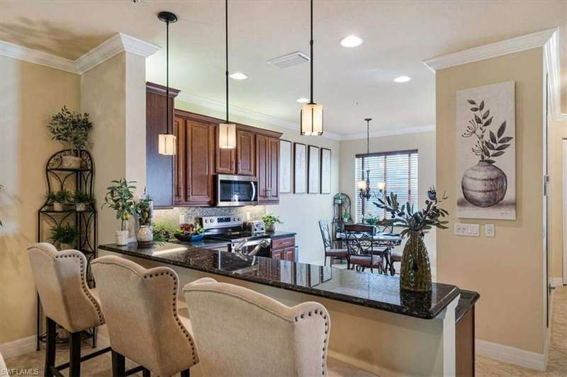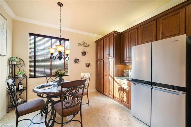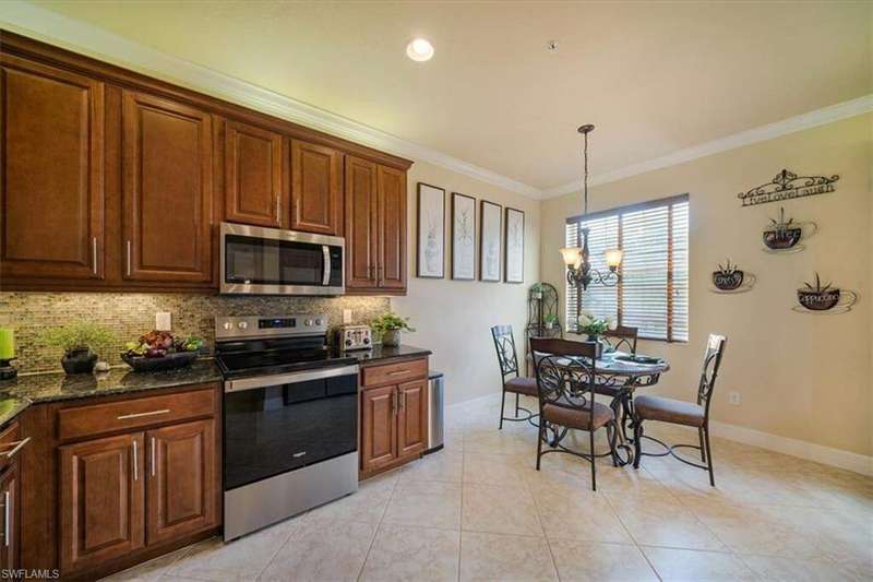 Welcome to this meticulously maintained 2nd-floor condo in the sought-after gated community of Marbella Lakes. Freshly painted and beautifully furnished with high-end decor (furniture package negotiable), this residence offers a spacious kitchen with warm wood-toned cabinets, a large pantry, stainless steel appliances, and a tiled backsplash. Enjoy versatile dining options with a breakfast bar, eat-in kitchen nook, and formal dining space. Upgrades include crown molding, updated lighting, and custom draperies and blinds. The neutral tile flooring is laid on a diagonal throughout. A guest suite doubles as a den with custom built-ins for a desk and storage. Relax on the private screened lanai with tiled floors. Community amenities feature a resort-style pool, splash pad, fitness center, clubhouse, three clay tennis courts, and four new pickleball courts. Conveniently located near shopping, dining, downtown Naples, and the Gulf of Mexico's sunny beaches, just west of I-75-an ideal location for enjoying the Naples lifestyle.