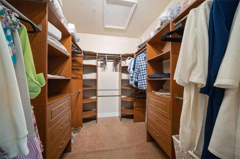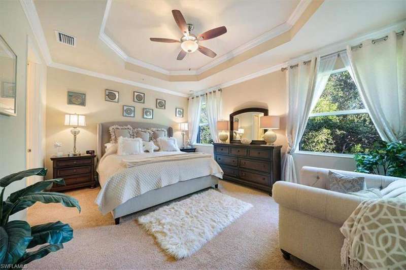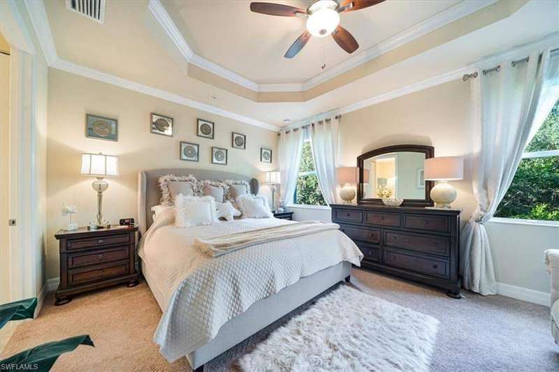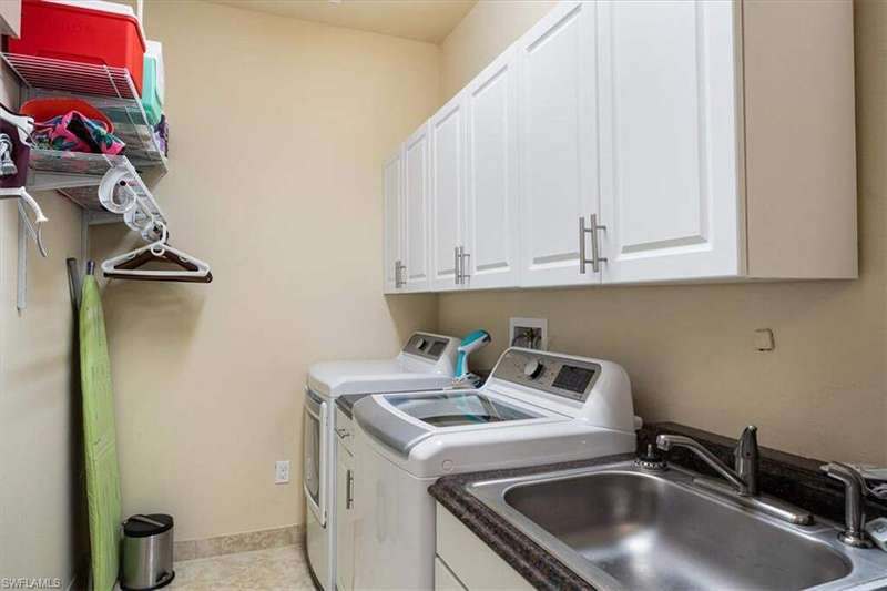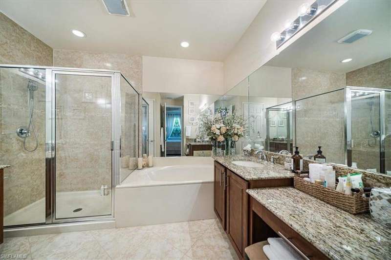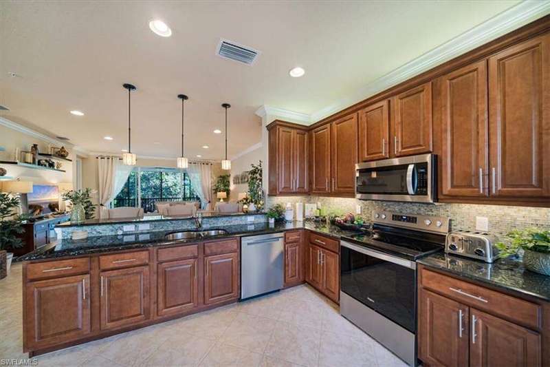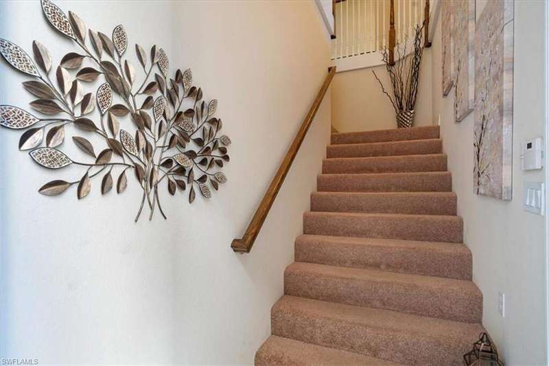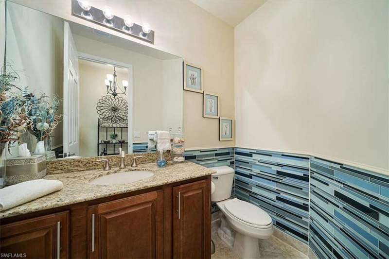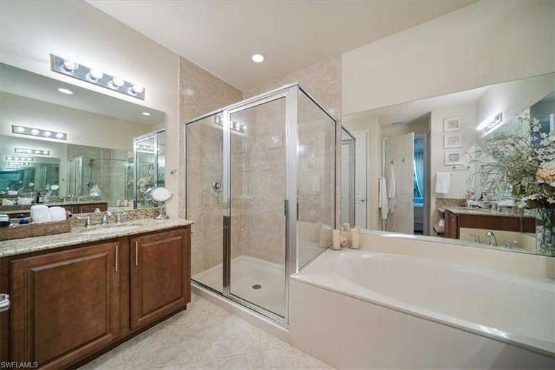 Welcome to this meticulously maintained 2nd-floor condo in the sought-after gated community of Marbella Lakes. Freshly painted and beautifully furnished with high-end decor (furniture package negotiable), this residence offers a spacious kitchen with warm wood-toned cabinets, a large pantry, stainless steel appliances, and a tiled backsplash. Enjoy versatile dining options with a breakfast bar, eat-in kitchen nook, and formal dining space. Upgrades include crown molding, updated lighting, and custom draperies and blinds. The neutral tile flooring is laid on a diagonal throughout. A guest suite doubles as a den with custom built-ins for a desk and storage. Relax on the private screened lanai with tiled floors. Community amenities feature a resort-style pool, splash pad, fitness center, clubhouse, three clay tennis courts, and four new pickleball courts. Conveniently located near shopping, dining, downtown Naples, and the Gulf of Mexico's sunny beaches, just west of I-75-an ideal location for enjoying the Naples lifestyle.