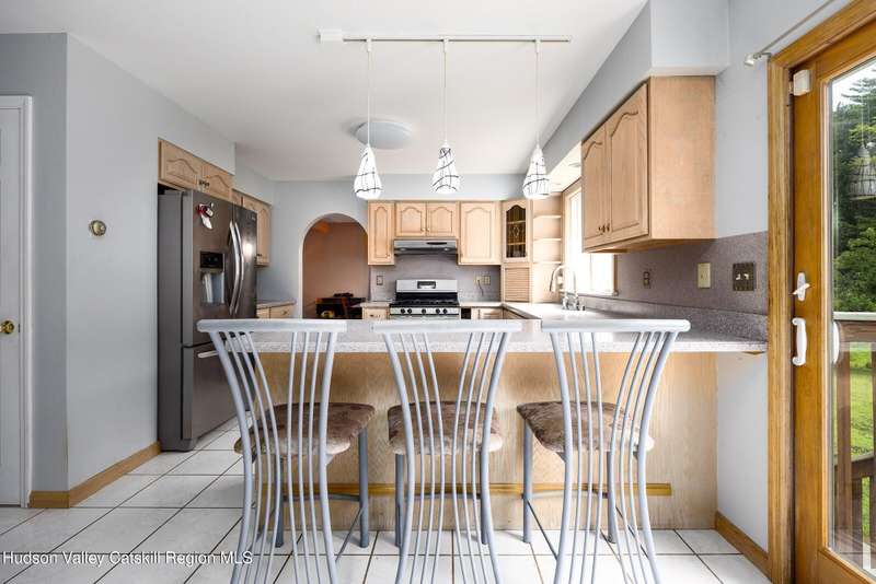 Set on 2.3 private acres in the heart of West Hurley, this spacious and light filled home offers a flexible layout with multiple living areas, and plenty of space to grow, both inside and out. Step inside to a generous entryway that opens into a living room / dining room area, perfect for entertaining. The well appointed kitchen features abundant cabinet space and sliding glass doors leading to a generous back deck ideal for out door dining and gatherings. A large den complete with cozy fireplace and sliding glass doors is the perfect place to gather, relax by the fire, or take in the view. Two additional rooms on the main level offer more flexibility easily serving as extra bedrooms, office space or a place for extra guests. Upstairs the primary suite is complete with walk in closet and large ensuite bathroom. Two additional large bedrooms and a full bath, complete the second level. For added convenience an oversized attached two car garage serves as the perfect spot for extra storage, workshop or studio space. Updated mechanicals and meticulous home maintenance provide peace of mind. Outside you can enjoy the peacefulness of a quiet country road, large front and back yard and custom stone fire pit all surrounded by lush greenery, fruit trees, and thoughtful landscaping. With plenty of open space this property may also offer potential for future expansion - whether you're dreaming of a guest house, artist studio, or multi generational living. Just minutes to village of Woodstock, Kingston, NYS Thruway and 90 minutes from the GWB, this West Hurley home offers the perfect balance of comfort and convenience.