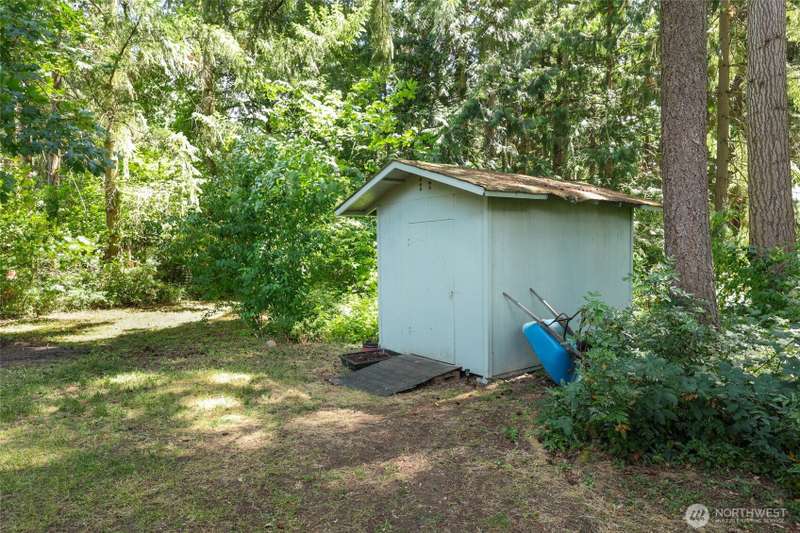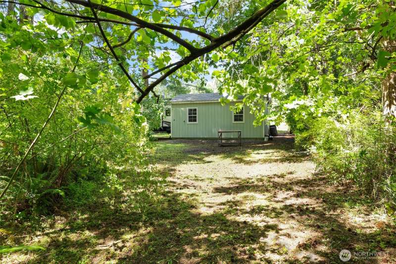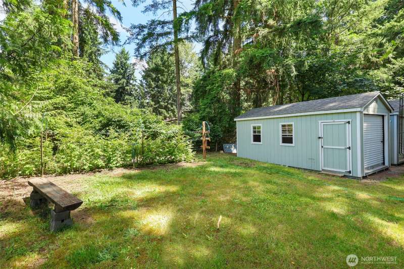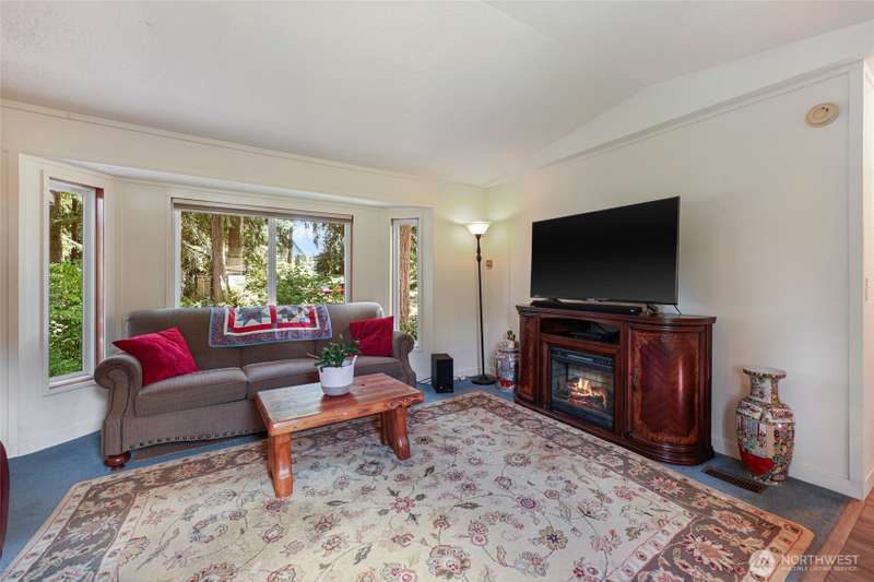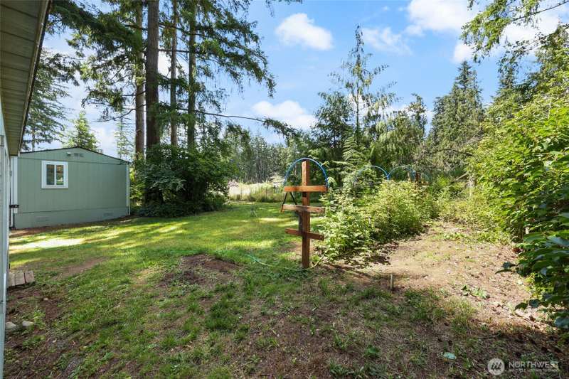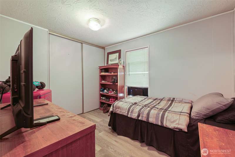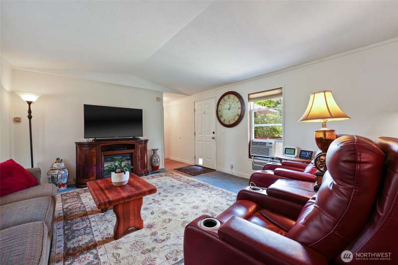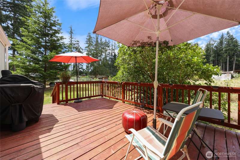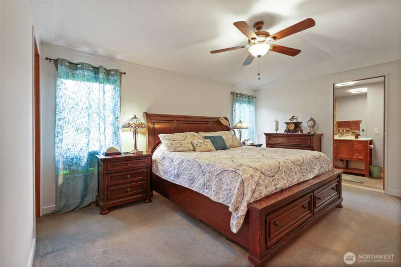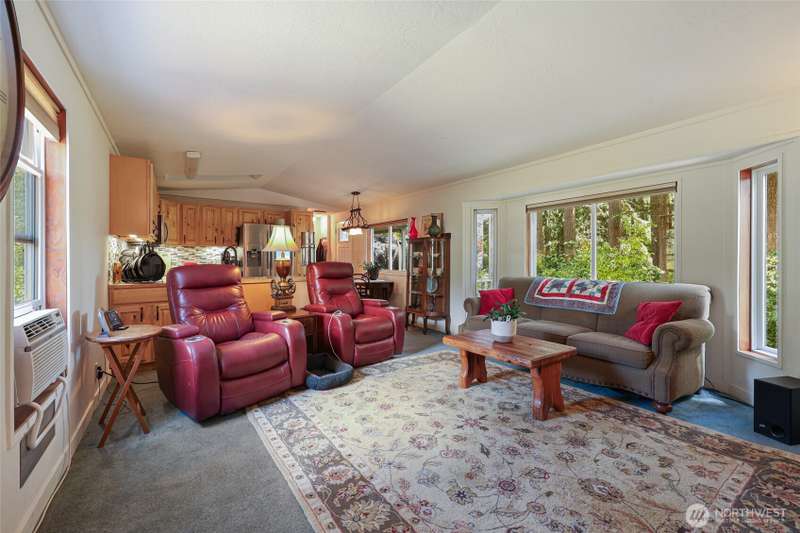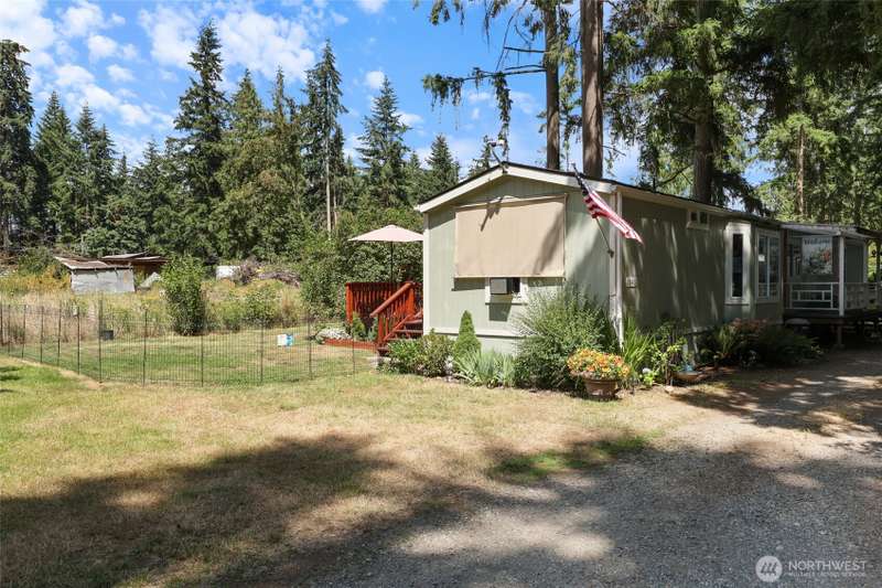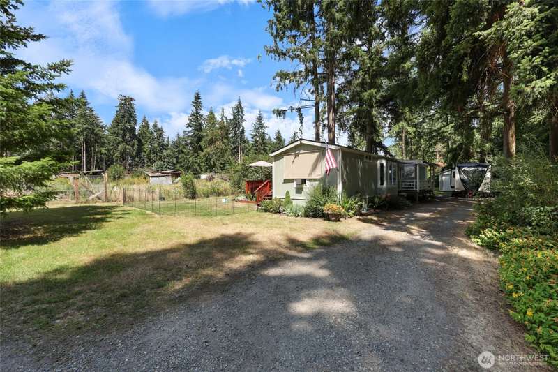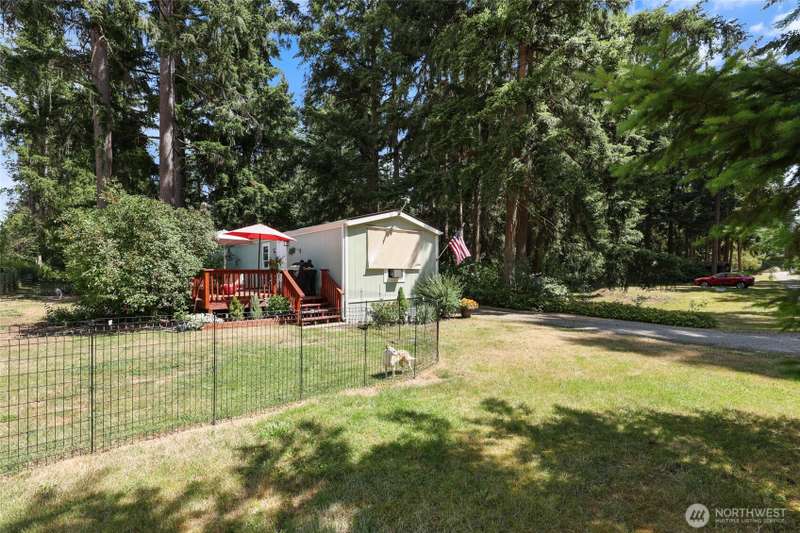 Great new price! 2 bedroom, 2 bath home in a private setting at Binghamwood Manor Mobile Home Park. Home boasts decks front and back, 2 garage units for vehicles or storage, newer appliances that stay, 2020 roof, beautiful, updated kitchen cabinets, updates in bathrooms, spacious primary bedroom and private bath. The yard is landscaped, partially fenced and peaceful. It even has an established raspberry patch! Have it all at an affordable price. $850 Park covers water, sewer and garbage.