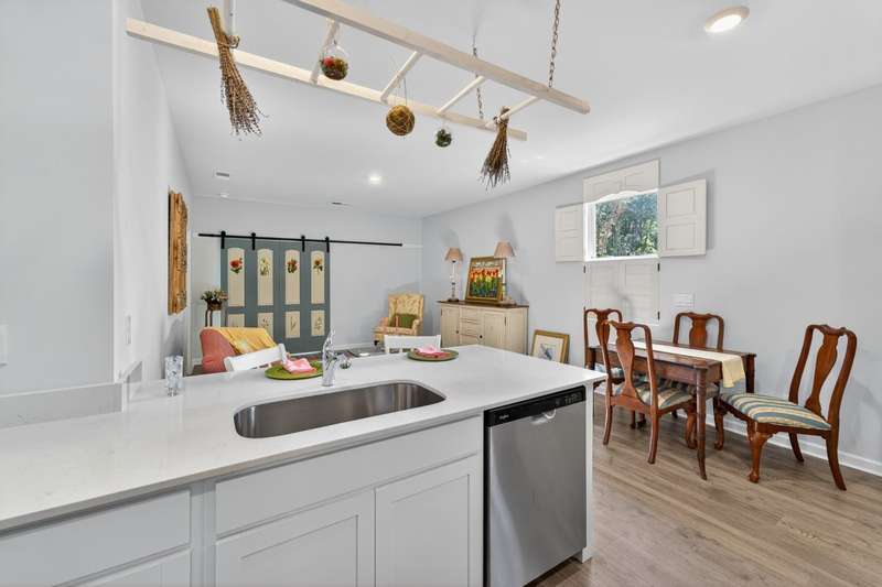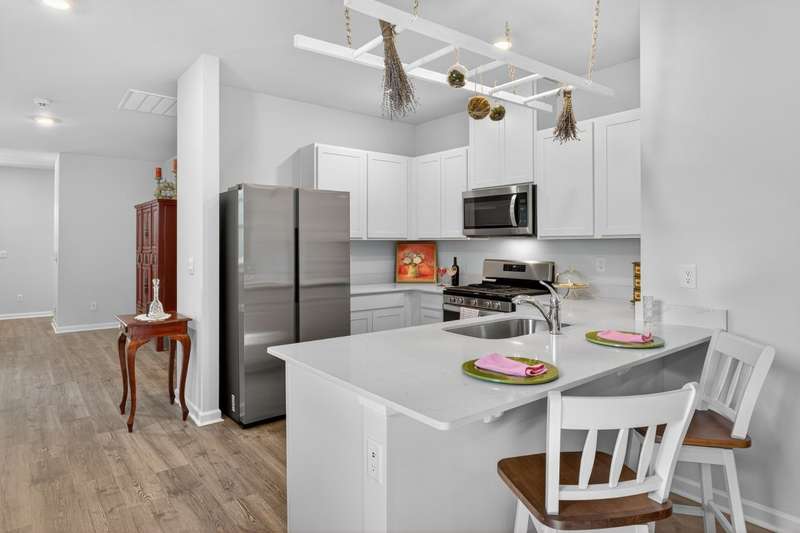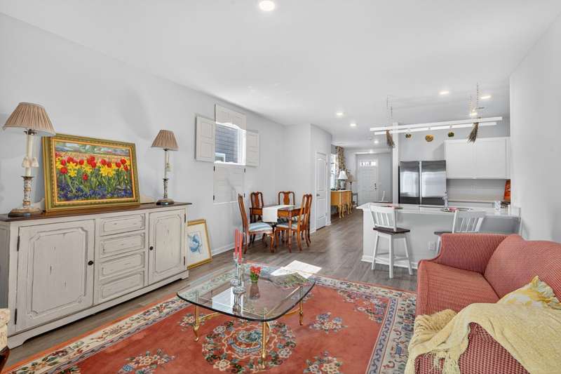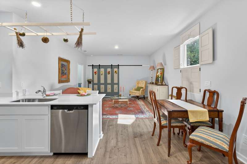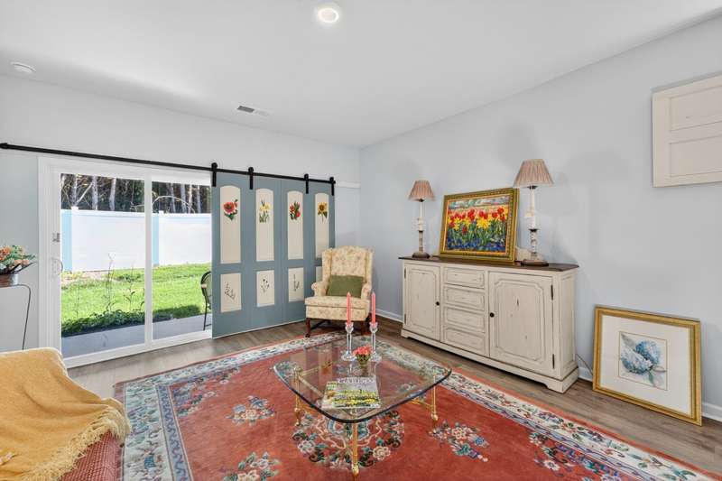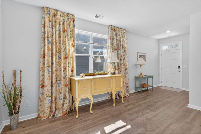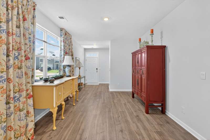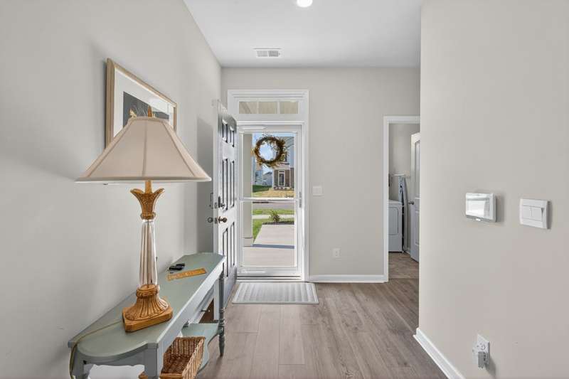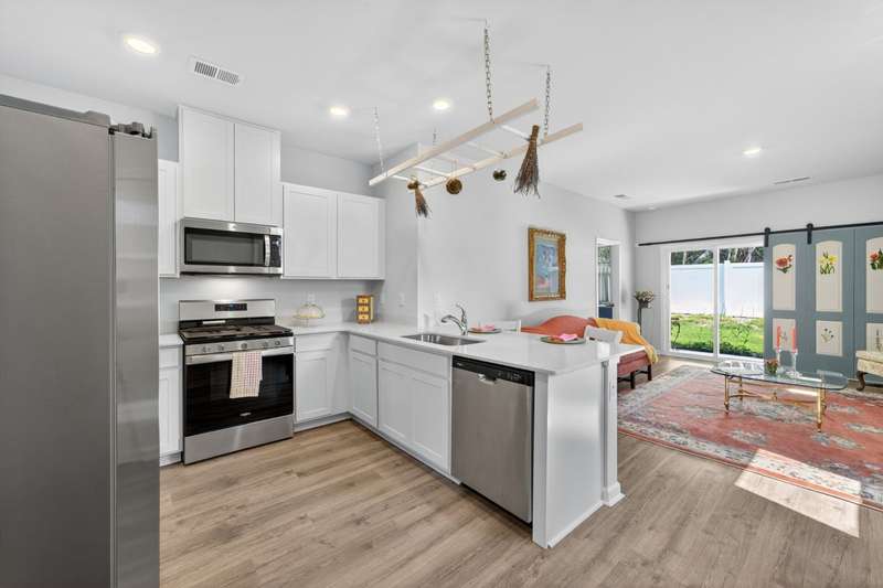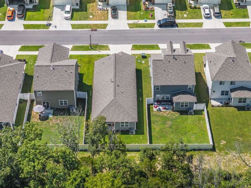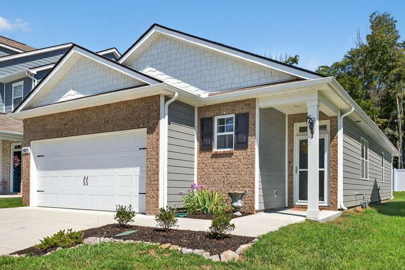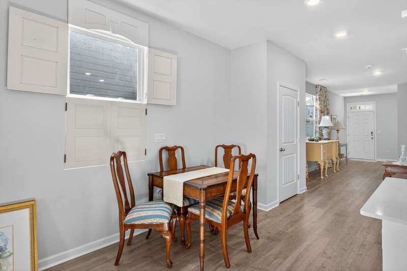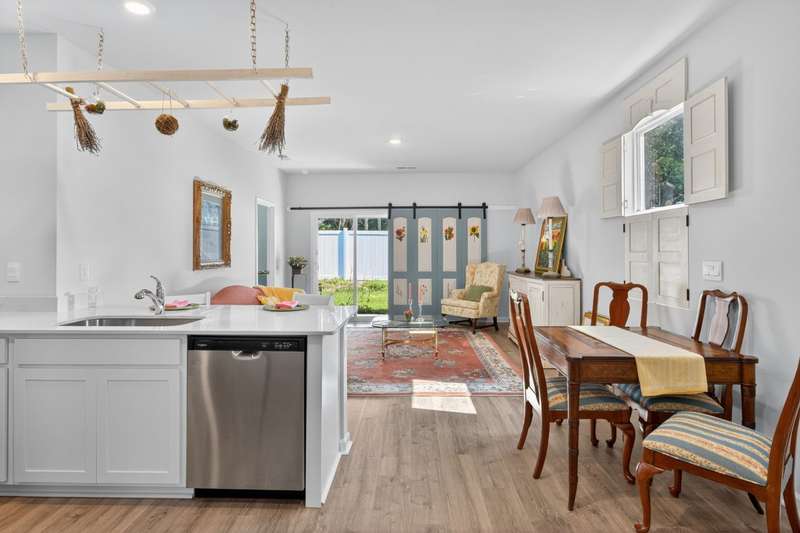 Tucked against a peaceful treeline, this like-new, single-level cottage feels instantly welcoming. Step inside to find a bright, open layout with quartz countertops, stainless steel appliances, and easy-care LVP flooring. Soft recessed lighting and 9' ceilings create an inviting feel, while a decorative sliding door leads you to the covered back patio-just right for morning coffee or evening conversations. A dedicated laundry room adds convenience, and the vinyl-fenced backyard offers privacy and a perfect space to unwind. From its charming shaker shingle accents to its thoughtful finishes, this home is ready for you to start your next chapter.