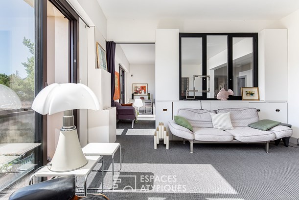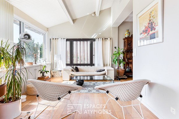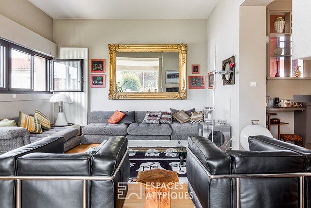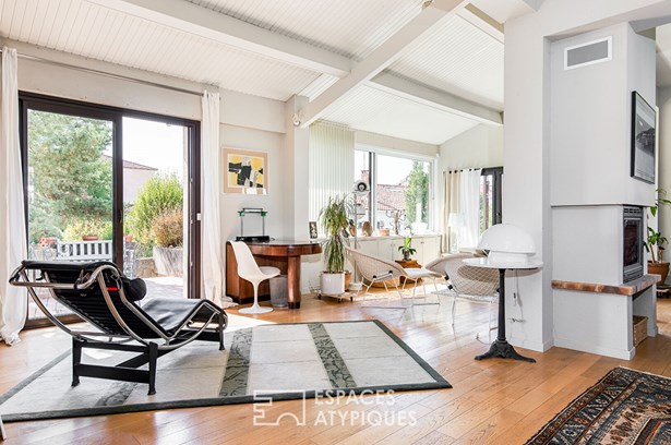 A l'etage, le salon principal, decloisonne, s'articule autour de la cheminee centrale. Il offre un espace lumineux et tourne vers l'exterieur grace a ses larges ouvertures et son acces a une terrasse intimiste.