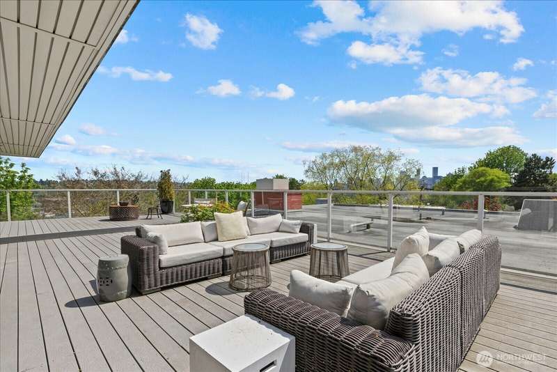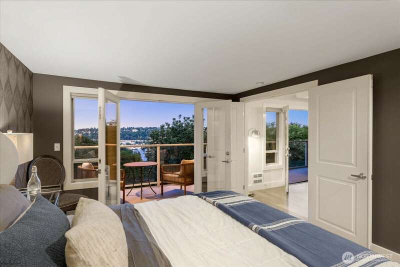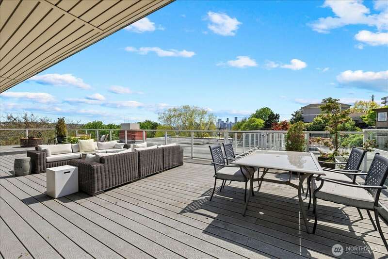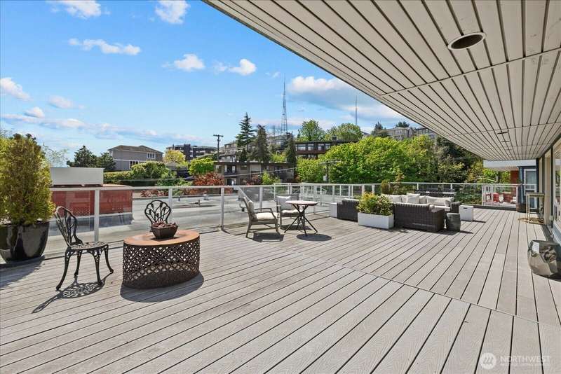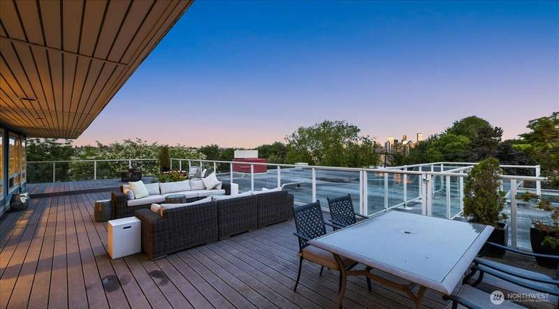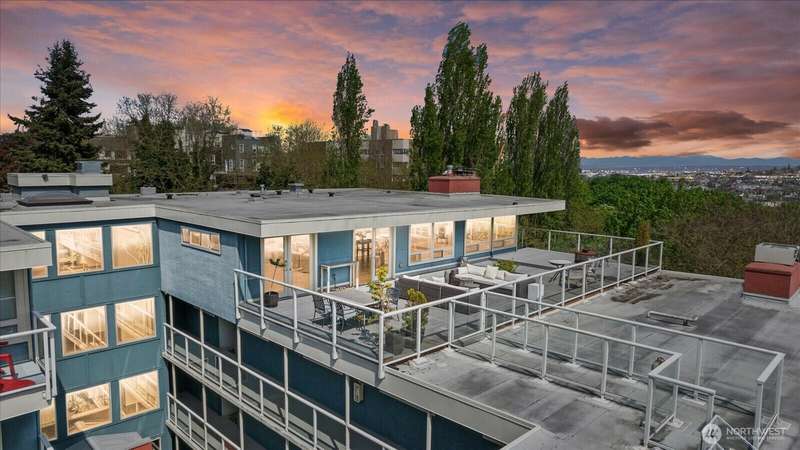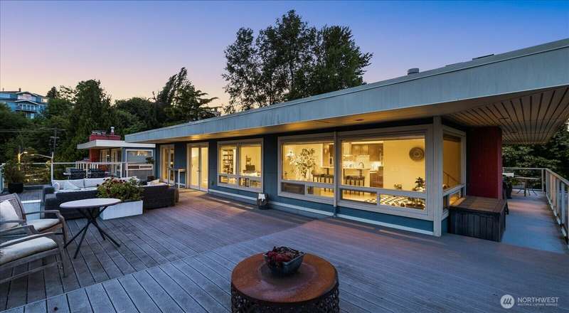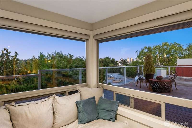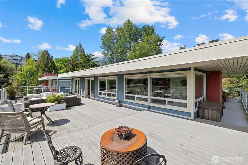 PENTHOUSE PERFECTION- Top-floor stunning SE- Lush tree landscape w/ partial Lake Union+ City & Mountain views with rare 1200 sqft private deck wrap around deck. Brilliant layout, near 1800sft home with additional apartment for guests on lower level. Enjoy this classic mid century modern design. Open concept floor plan, unmatched flow seamlessly connecting spacious living, dining, and kitchen areas with floor-to-ceiling glass for abundant natural light- ideal indoor-outdoor flow an entertainers dream. Includes 2 secure parking spaces + a separate lower-level guest suite with bathroom—great for guests, office, Art studiol. Exceptional location near Lake Union in a quiet, boutique building. A top floor penthouse with unmatched flexibility!