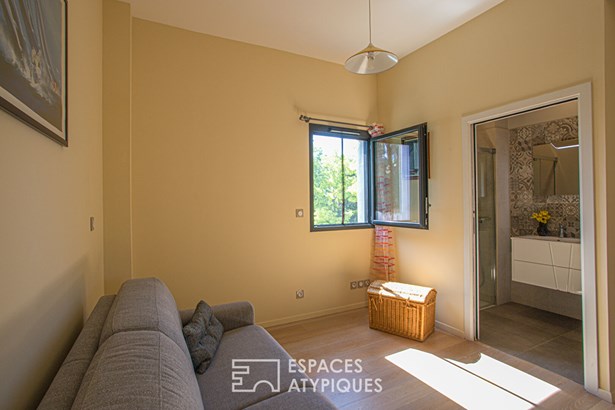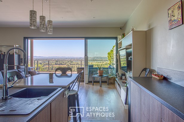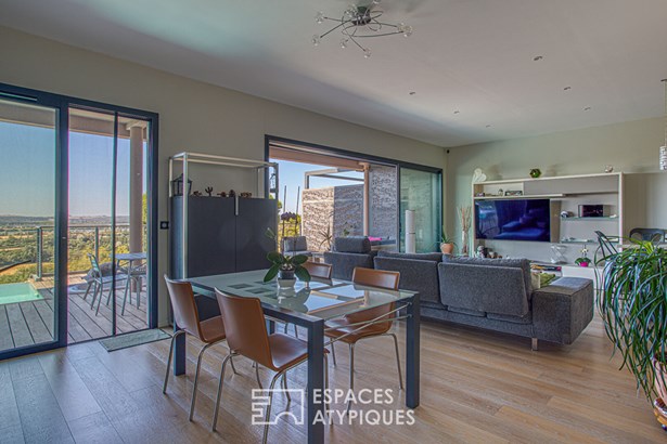 The entrance sets the tone with a perspective where your gaze escapes, towards the vast and luminous living room, beyond the large bay windows that fade into the open air to reveal a terrace, towards a distant green and blue horizon that stretches as far as the Alpilles.