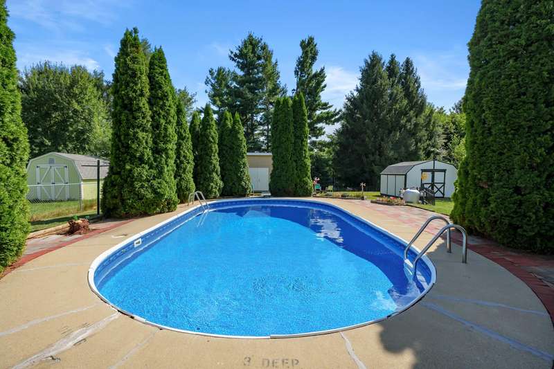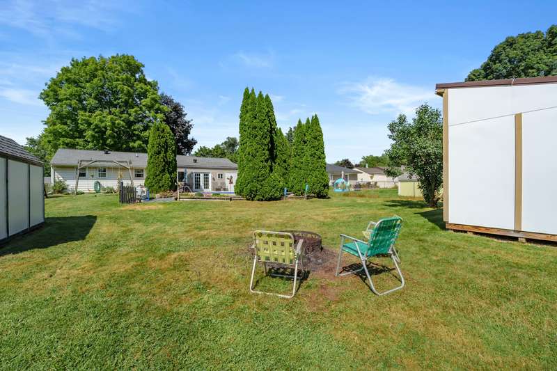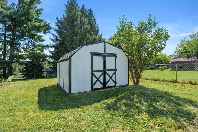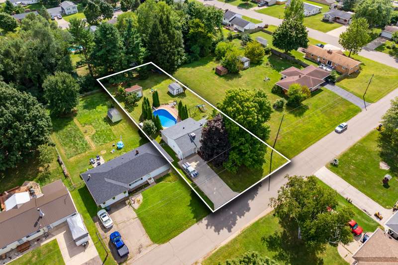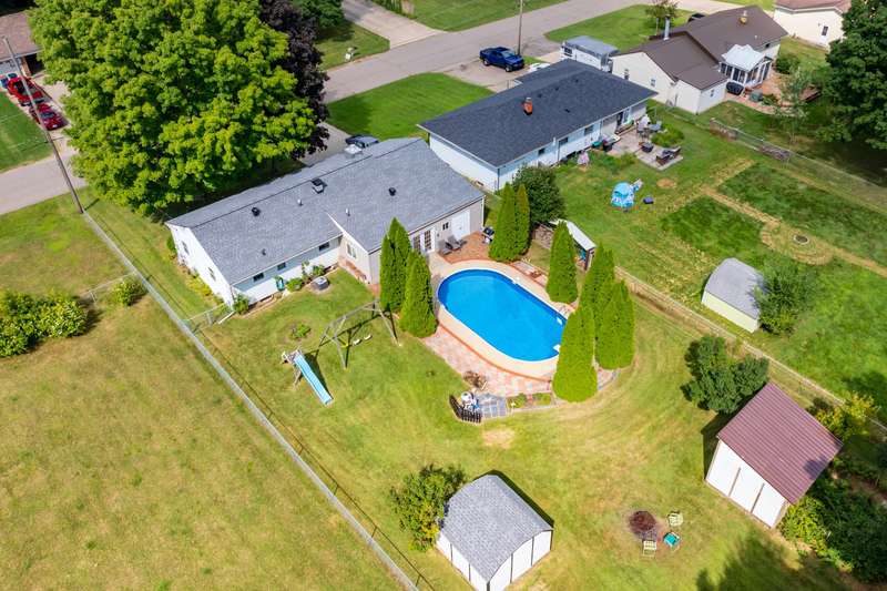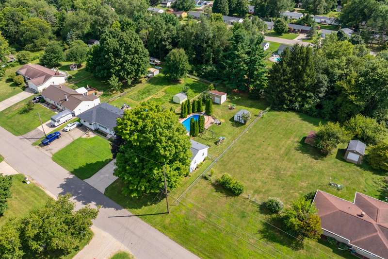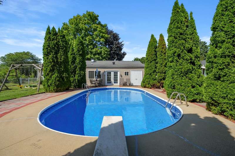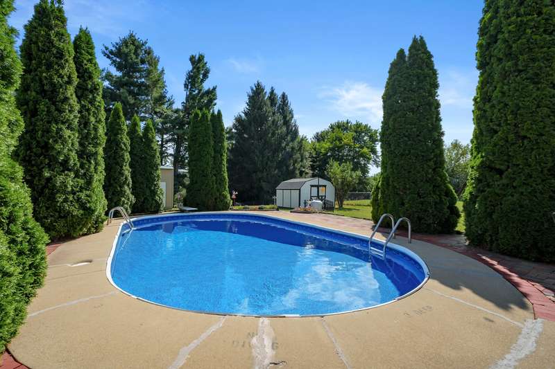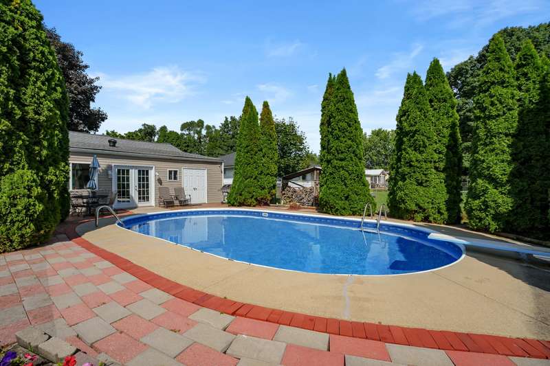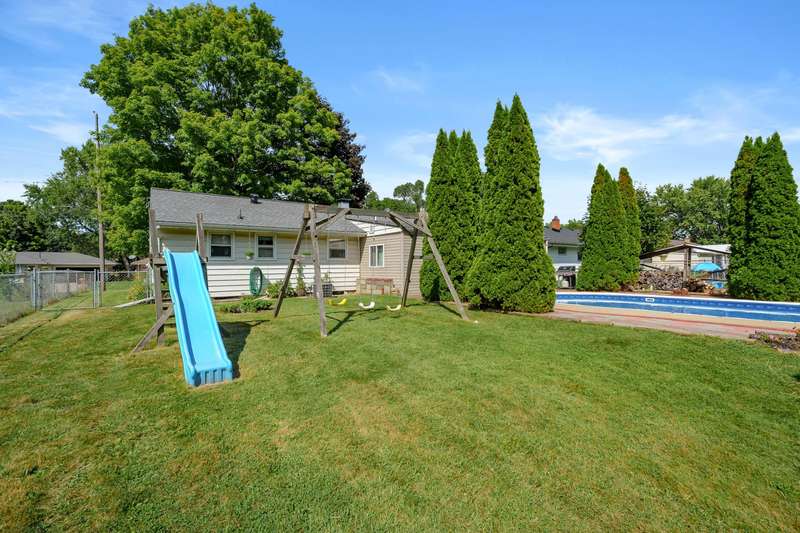 Incredible opportunity to own this well-maintained three-bedroom, two-bath home featuring a backyard oasis with an inground pool! Recent updates include a new roof (2024), pool liner (2023), and new living room carpet (2025). Enjoy peace of mind with a fenced backyard, two storage sheds, a Kinetico water softener, and a Reverse Osmosis system. The living room showcases plaster walls and a cozy wood-burning fireplace. The kitchen is equipped with stainless steel appliances and an abundance of cabinetry. Just off the kitchen is a spacious flex room-perfect as a formal dining room, additional living space, or home office. The lower level expands your living options with a large family room, a second finished room with a closet (no egress). Plenty of built-in shelving in the storage area. The attached garage includes extra storage and 220V electrical service. A separate workshop features cabinets, additional storage, and double doors leading to the backyardideal for projects or hobbies. Step outside to enjoy your private retreat: an inground pool, patio area, large yard with mature landscaping, berry bushes, and a playsetperfect for entertaining or relaxing. Conveniently located near schools, parks, shopping, and walking trails!