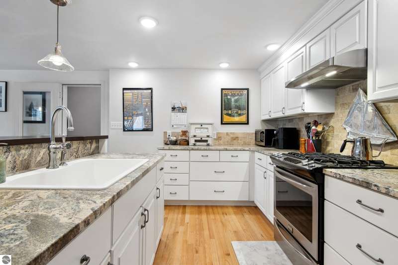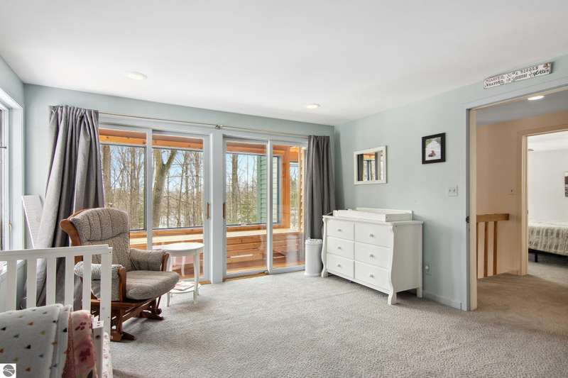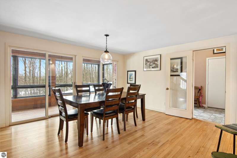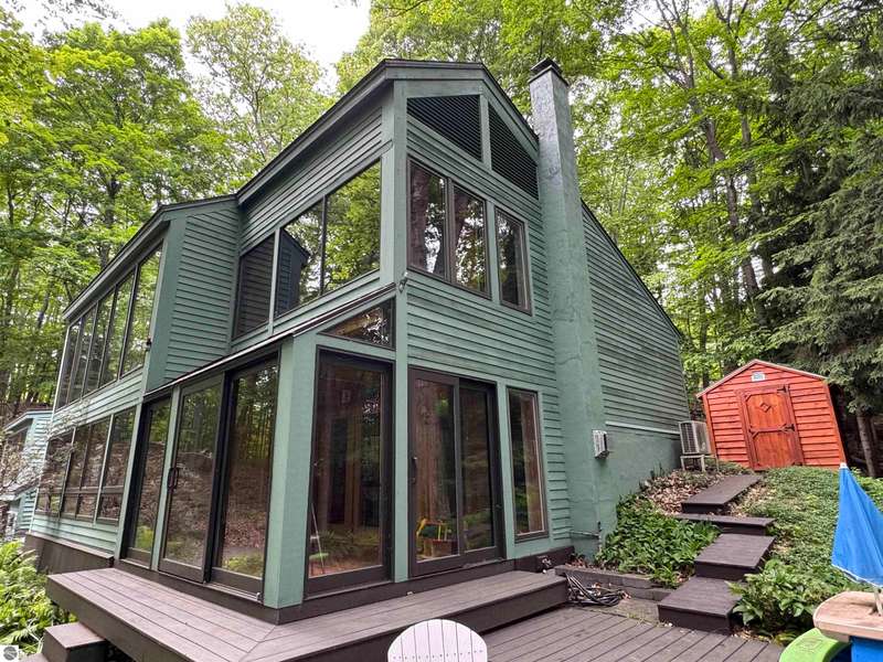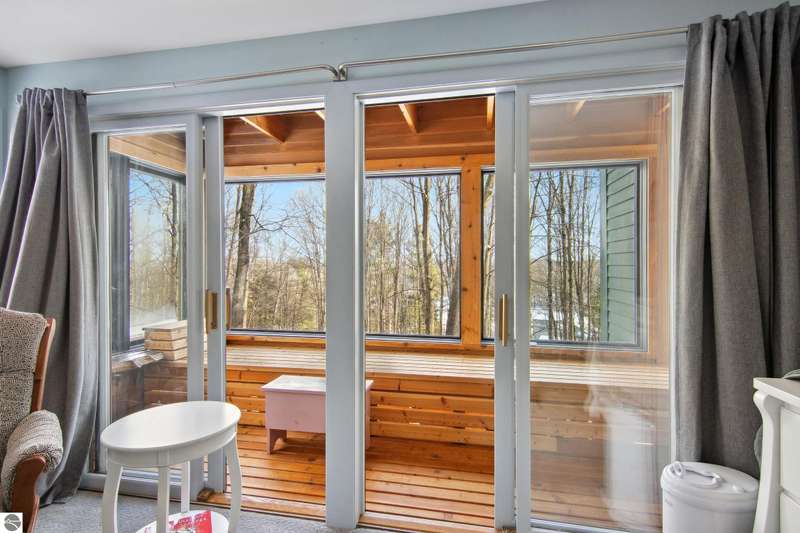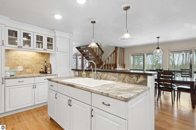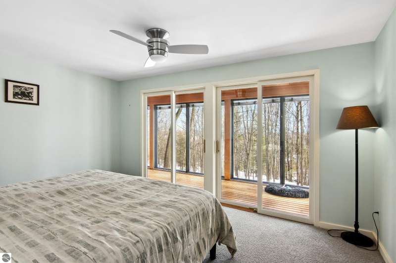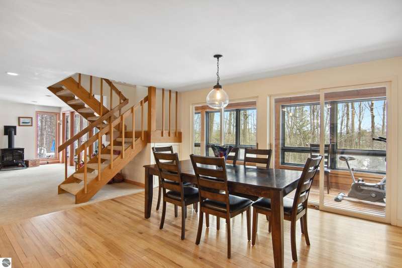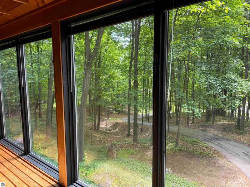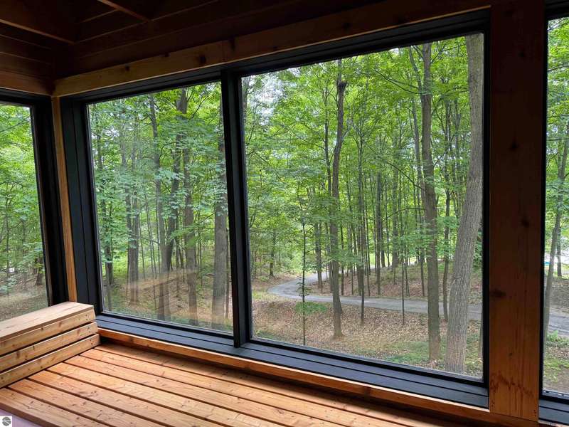 Idyllic setting in Beautiful Suttons Bay! Energy efficient passive solar home, surrounded by beautiful hardwoods and within walking distance of the village and beach! This Three-bedroom, two-bath home abuts 11 acres for a very peaceful setting. Enjoy relaxing in the expansive sunroom on two levels; the floor plan is open on the main level, allowing all rooms to see outside. The kitchen is beautifully appointed, with quartz counters, stainless appliances, and an abundance of cabinets for storage. The upper bedrooms have a huge hidden closet that connects at either end for even more storage. With a prime location just minutes from the beach this is a great place to call home.