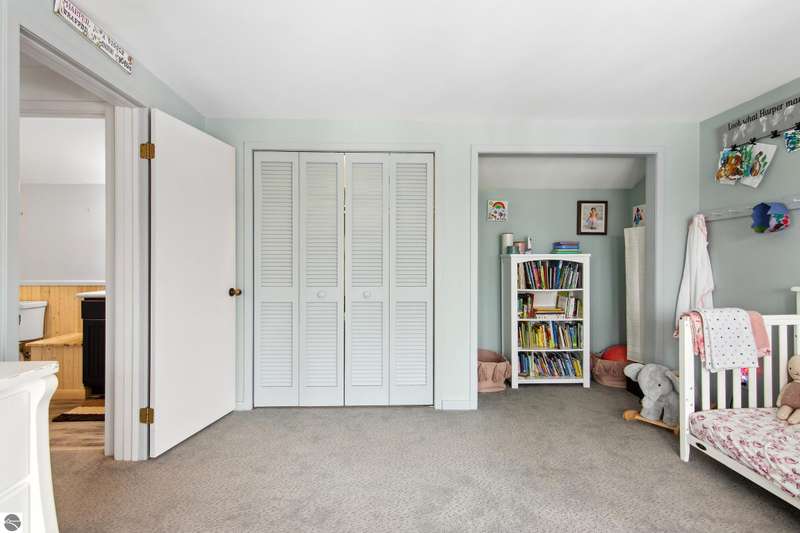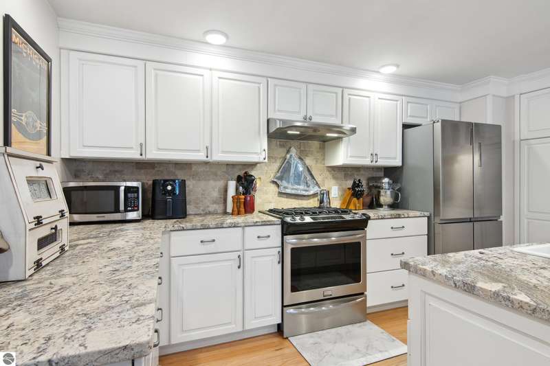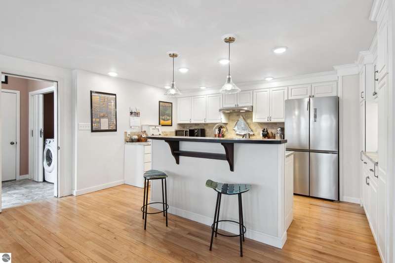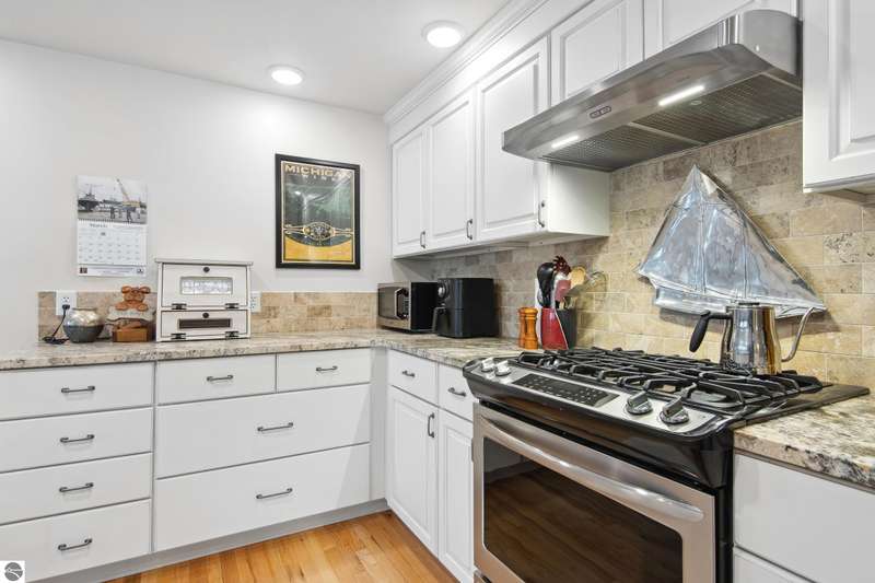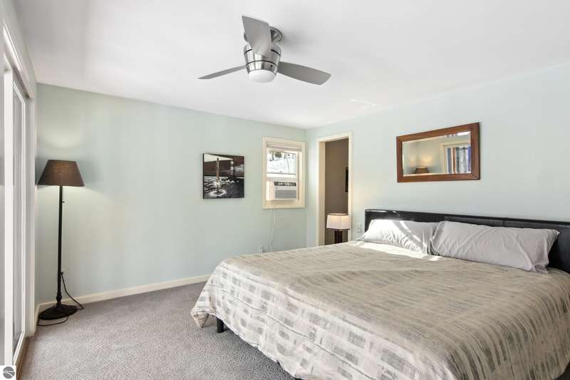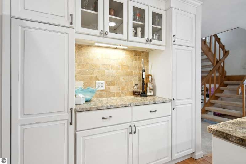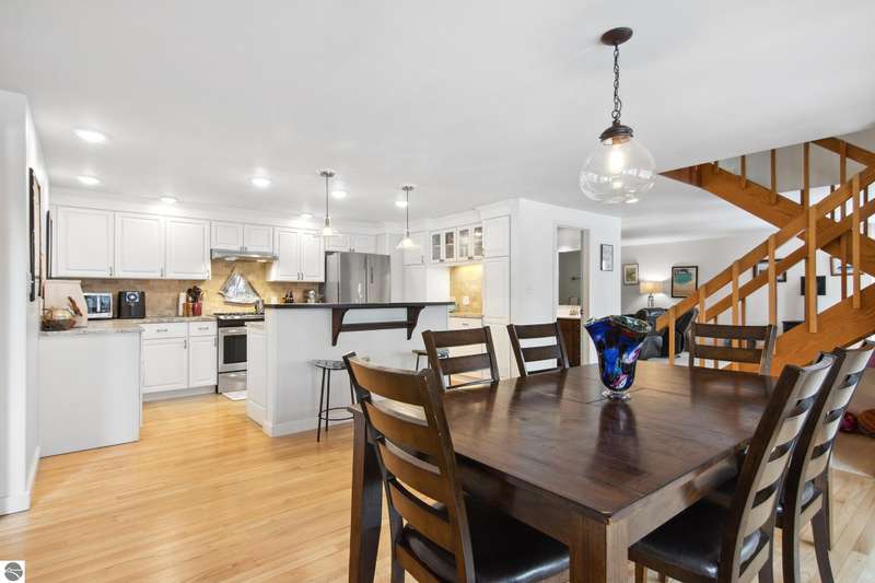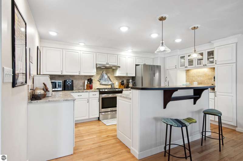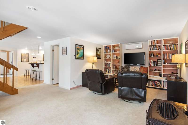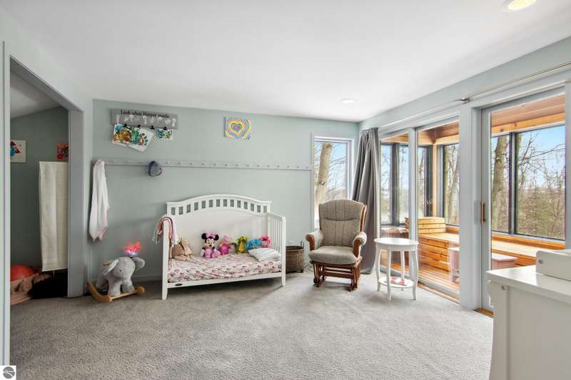 Idyllic setting in Beautiful Suttons Bay! Energy efficient passive solar home, surrounded by beautiful hardwoods and within walking distance of the village and beach! This Three-bedroom, two-bath home abuts 11 acres for a very peaceful setting. Enjoy relaxing in the expansive sunroom on two levels; the floor plan is open on the main level, allowing all rooms to see outside. The kitchen is beautifully appointed, with quartz counters, stainless appliances, and an abundance of cabinets for storage. The upper bedrooms have a huge hidden closet that connects at either end for even more storage. With a prime location just minutes from the beach this is a great place to call home.