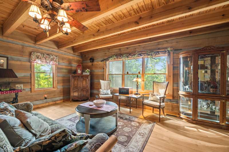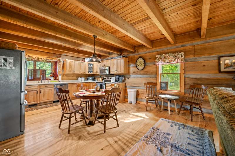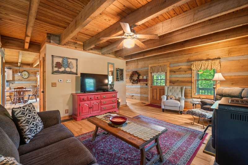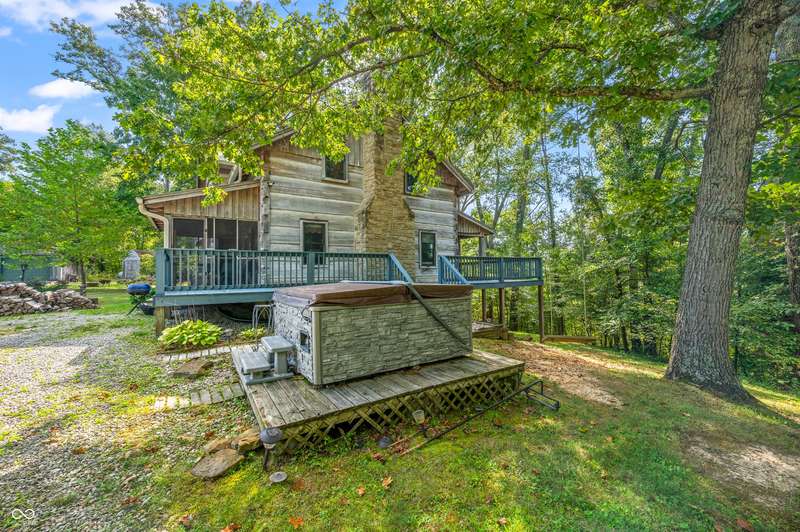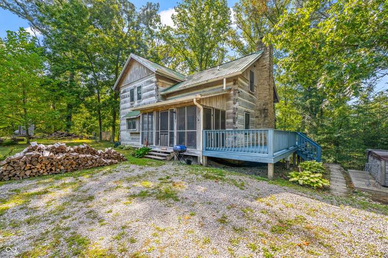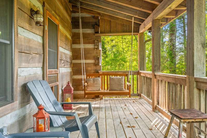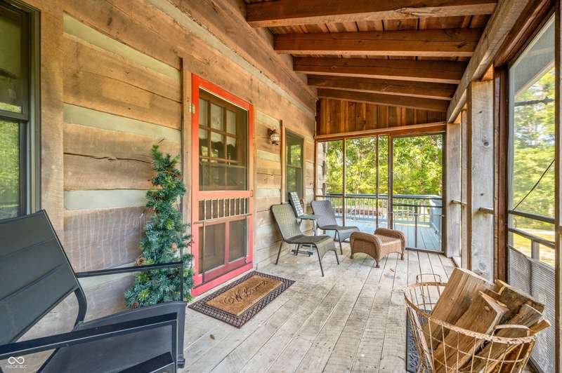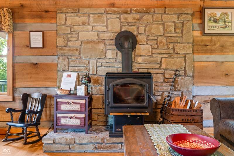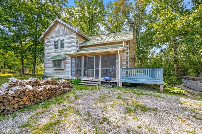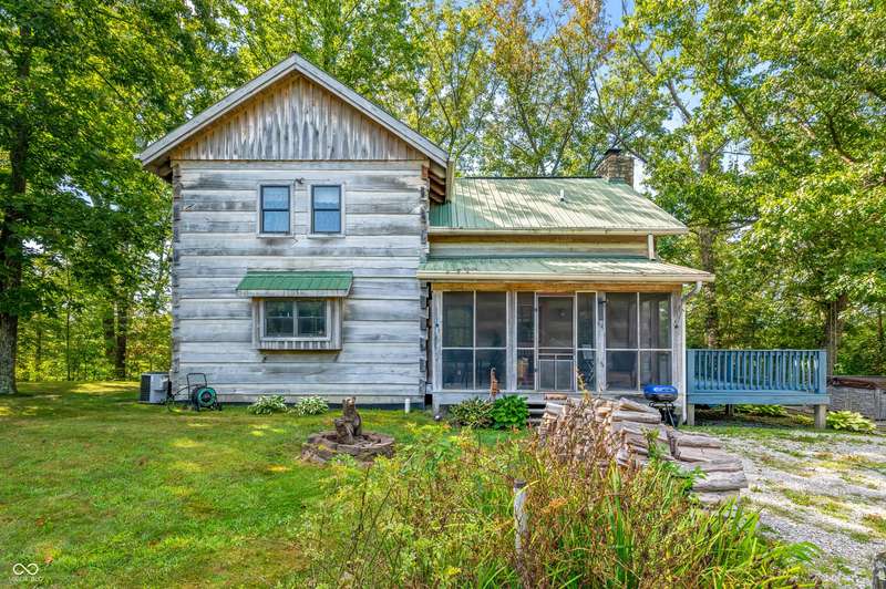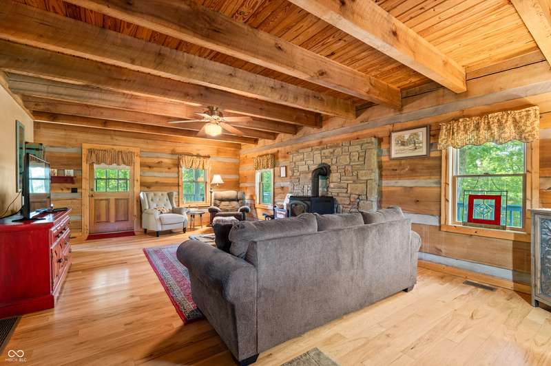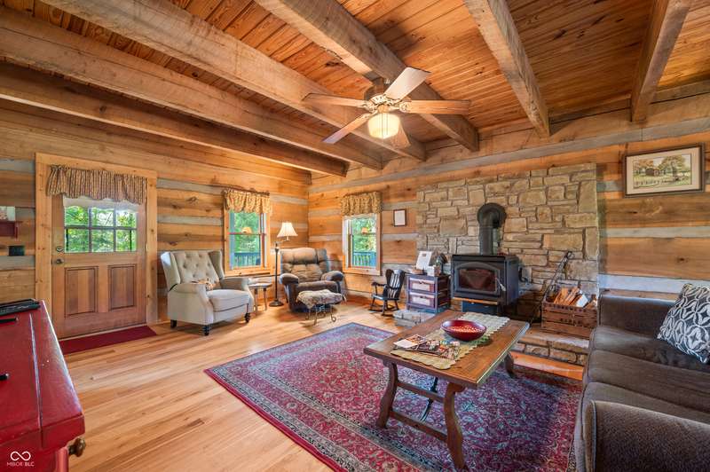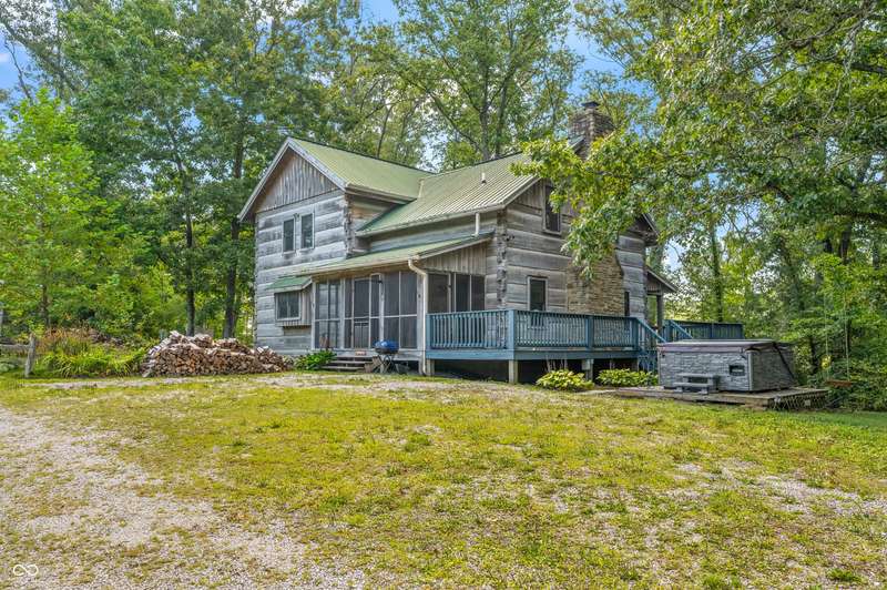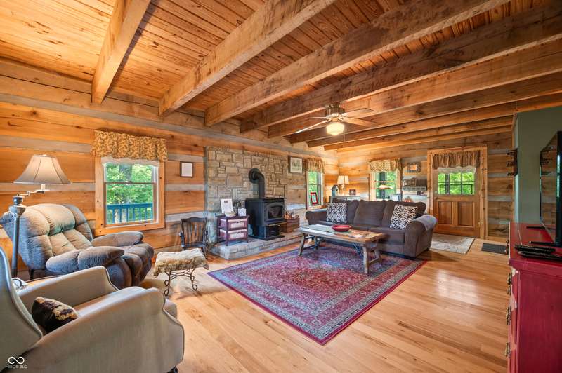 Stonehead Ridge Log Cabin is a 4-guest tourist home located in the rolling hills of southern Brown County. Very private and buffered by woods. Open pasture type yard allows for outdoor pursuits, games and hobbies. Two bedrooms and two and a half baths. The wood-burning stove and Brown county stone hearth provide a calming focal point in the cozy living room. The spacious primary bedroom suite with a cathedral wood ceiling includes a full bath with shower and soaker tub along with a flex space for use as a walk in closet, nursery or office. The second bedroom has an en suite full bathroom with a tub and shower. Well appointed kitchen with beautiful cabinets, solid countertops, stainless steel appliances and pantry. Relax on the swing on the screened porch. The expansive deck with a hot tub offers spots for taking in the beauty of the natural surroundings. This cabin was constructed from native 16" poplar, dovetail-notched logs and has a metal roof. An unfinished, full walk-out basement provides plenty of opportunity for additional living space. There is a four car garage and two bay carport for sheltering your vehicles and toys from the elements. There are two sheds for additional storage needs. Stroll through the woods or hike the trails located across the road at the Stone Head Nature Preserve. Very convenient to the historic town of Story, Brown County State Park Horseman's Camp and the village of Nashville. Live here full time or as an investment property. The choice is yours!
