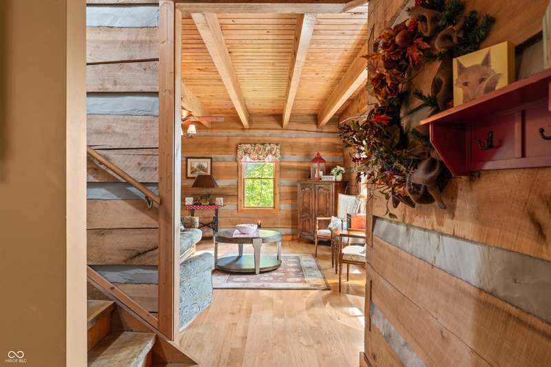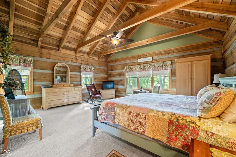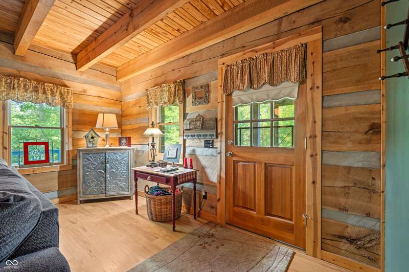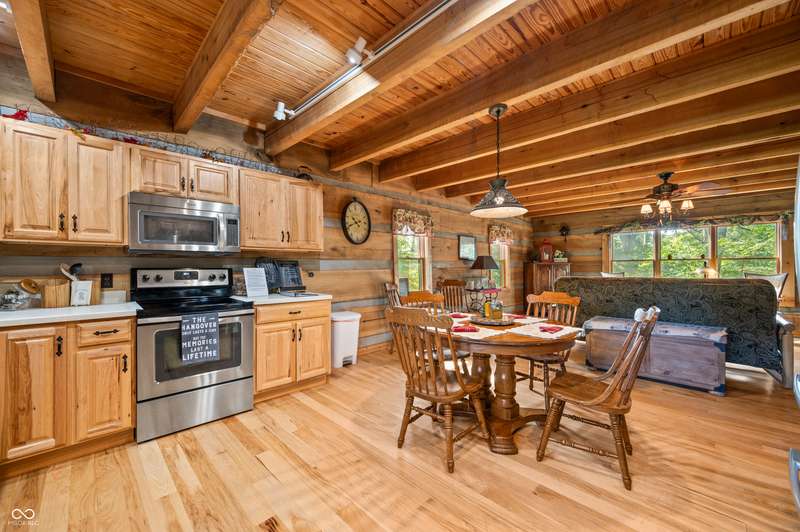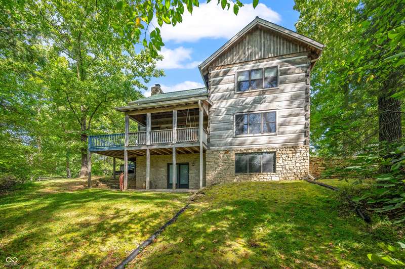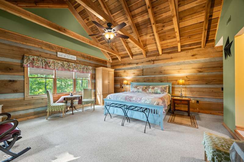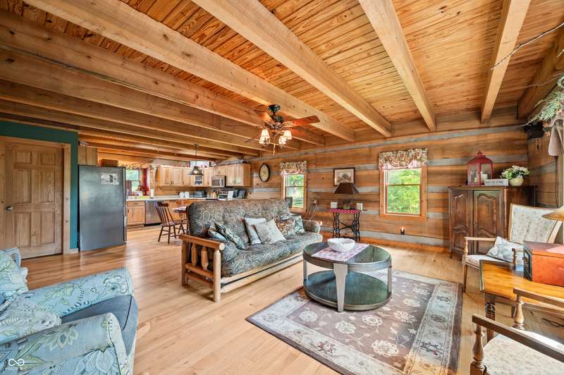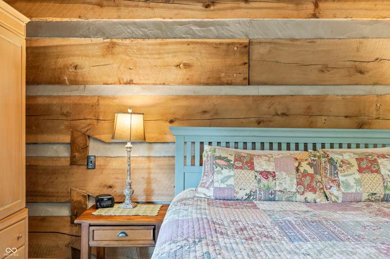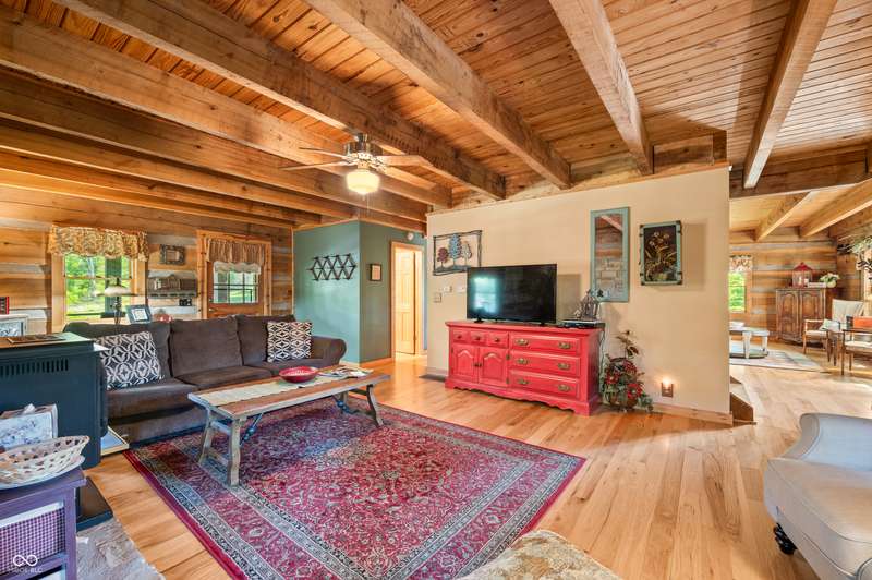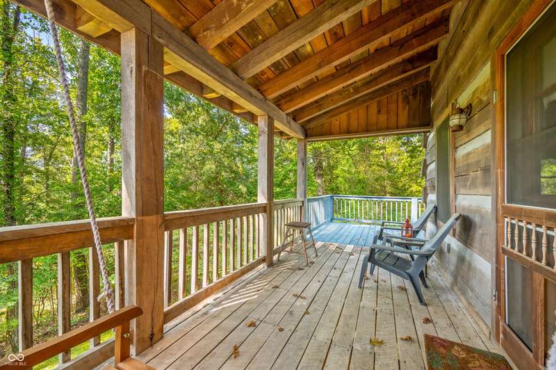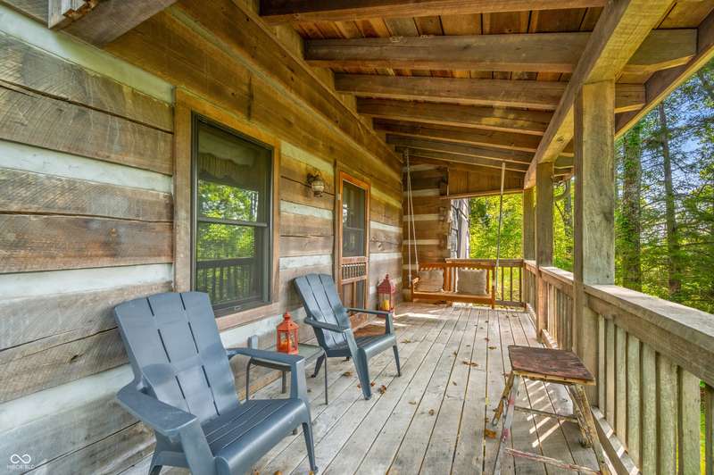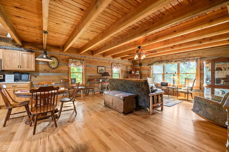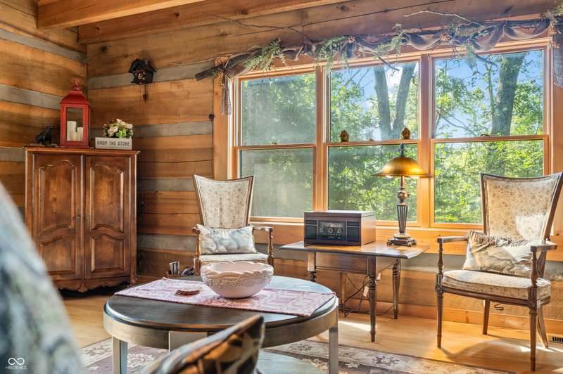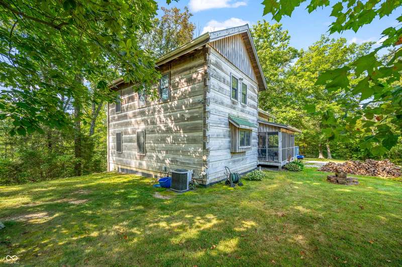 Stonehead Ridge Log Cabin is a 4-guest tourist home located in the rolling hills of southern Brown County. Very private and buffered by woods. Open pasture type yard allows for outdoor pursuits, games and hobbies. Two bedrooms and two and a half baths. The wood-burning stove and Brown county stone hearth provide a calming focal point in the cozy living room. The spacious primary bedroom suite with a cathedral wood ceiling includes a full bath with shower and soaker tub along with a flex space for use as a walk in closet, nursery or office. The second bedroom has an en suite full bathroom with a tub and shower. Well appointed kitchen with beautiful cabinets, solid countertops, stainless steel appliances and pantry. Relax on the swing on the screened porch. The expansive deck with a hot tub offers spots for taking in the beauty of the natural surroundings. This cabin was constructed from native 16" poplar, dovetail-notched logs and has a metal roof. An unfinished, full walk-out basement provides plenty of opportunity for additional living space. There is a four car garage and two bay carport for sheltering your vehicles and toys from the elements. There are two sheds for additional storage needs. Stroll through the woods or hike the trails located across the road at the Stone Head Nature Preserve. Very convenient to the historic town of Story, Brown County State Park Horseman's Camp and the village of Nashville. Live here full time or as an investment property. The choice is yours!