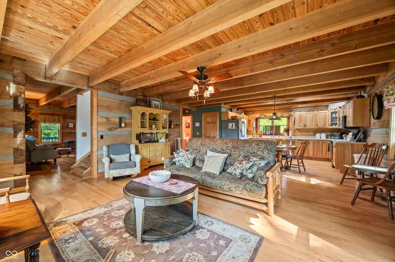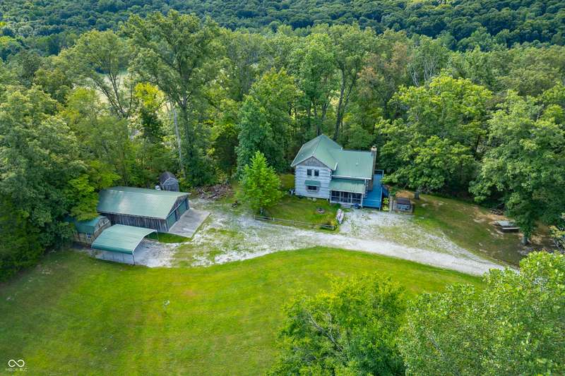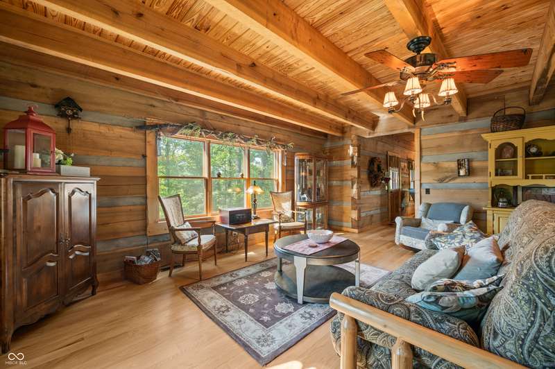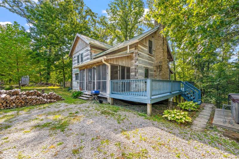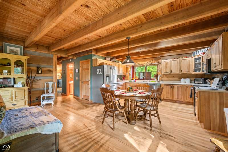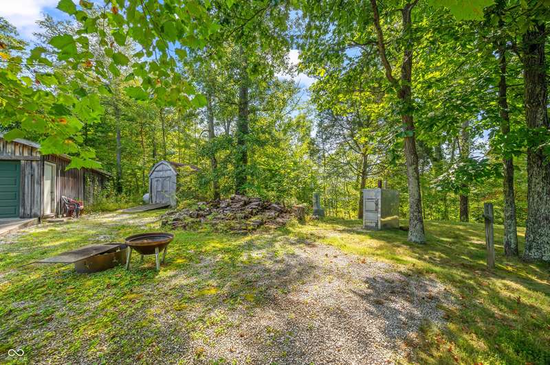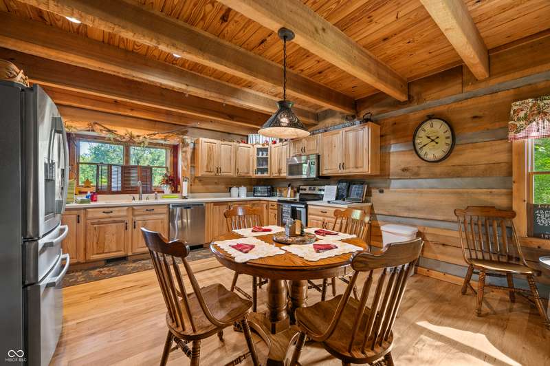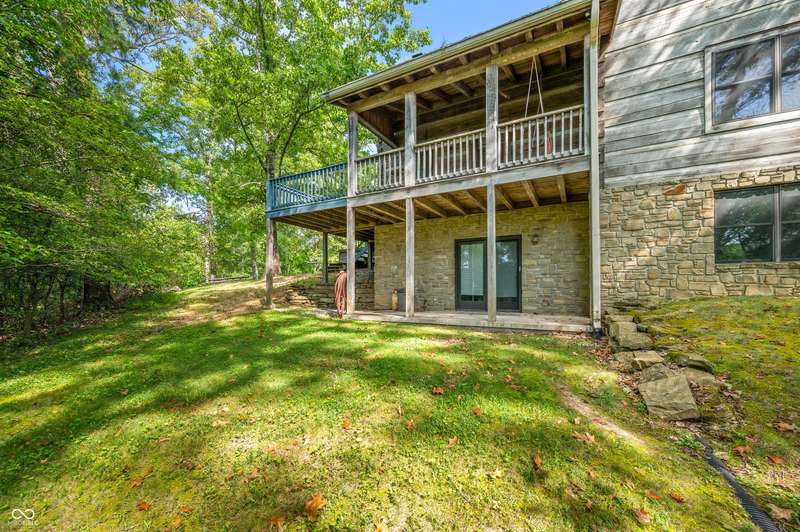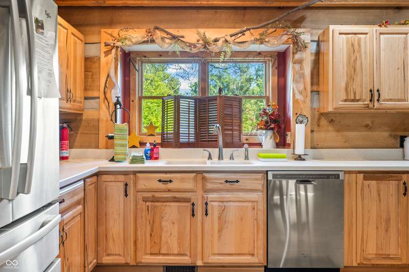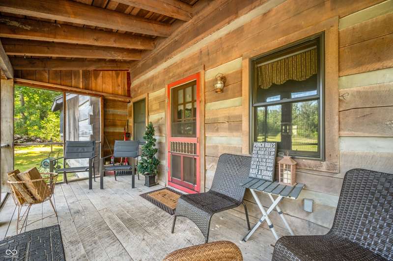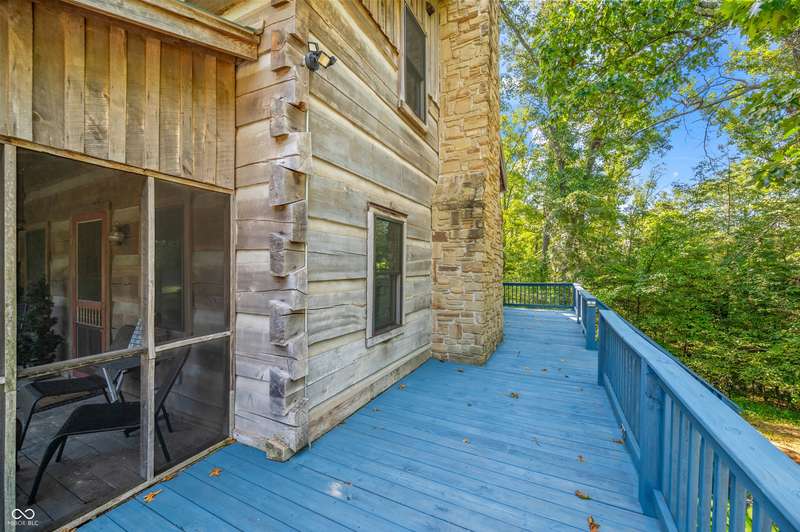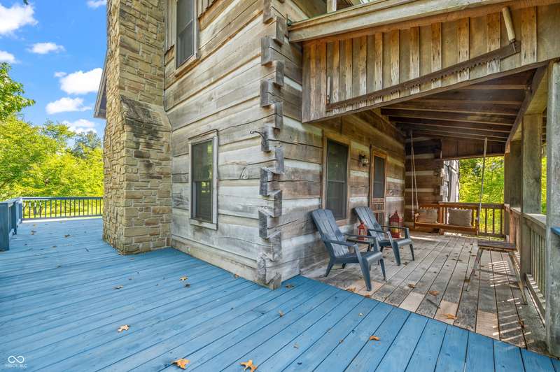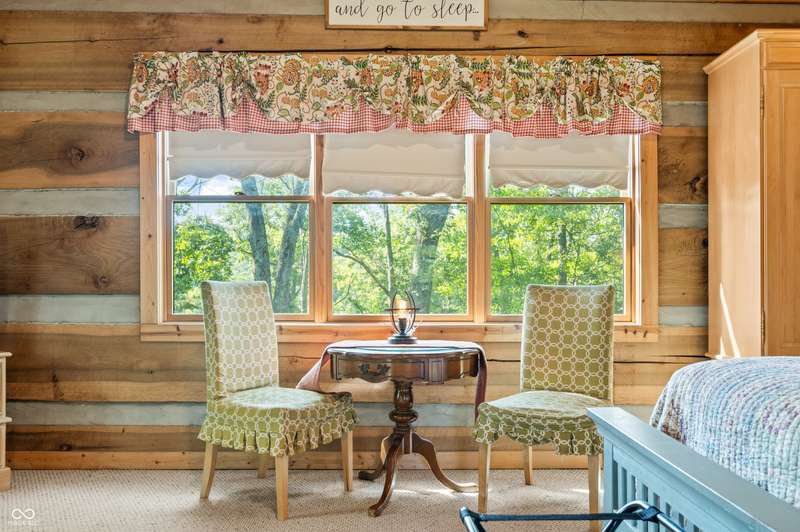 Stonehead Ridge Log Cabin is a 4-guest tourist home located in the rolling hills of southern Brown County. Very private and buffered by woods. Open pasture type yard allows for outdoor pursuits, games and hobbies. Two bedrooms and two and a half baths. The wood-burning stove and Brown county stone hearth provide a calming focal point in the cozy living room. The spacious primary bedroom suite with a cathedral wood ceiling includes a full bath with shower and soaker tub along with a flex space for use as a walk in closet, nursery or office. The second bedroom has an en suite full bathroom with a tub and shower. Well appointed kitchen with beautiful cabinets, solid countertops, stainless steel appliances and pantry. Relax on the swing on the screened porch. The expansive deck with a hot tub offers spots for taking in the beauty of the natural surroundings. This cabin was constructed from native 16" poplar, dovetail-notched logs and has a metal roof. An unfinished, full walk-out basement provides plenty of opportunity for additional living space. There is a four car garage and two bay carport for sheltering your vehicles and toys from the elements. There are two sheds for additional storage needs. Stroll through the woods or hike the trails located across the road at the Stone Head Nature Preserve. Very convenient to the historic town of Story, Brown County State Park Horseman's Camp and the village of Nashville. Live here full time or as an investment property. The choice is yours!