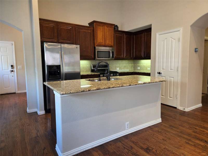 Lovely 4 bedroom home with split floorplan perfect for multi generational families. Large primary bedroom and bathroom split from two bedrooms downstairs with their own full bath, and 4th bedroom with full bath upstairs. Second living room with built in desk in loft space upstairs as well. High ceilings, tons of natural light, fantastic covered patios in front and back, hardwood floors, new premium carpet in bedrooms and upstairs, and a large kitchen island. Refrigerator, washer, and dryer are all included. City of McKinney with Frisco ISD schools.