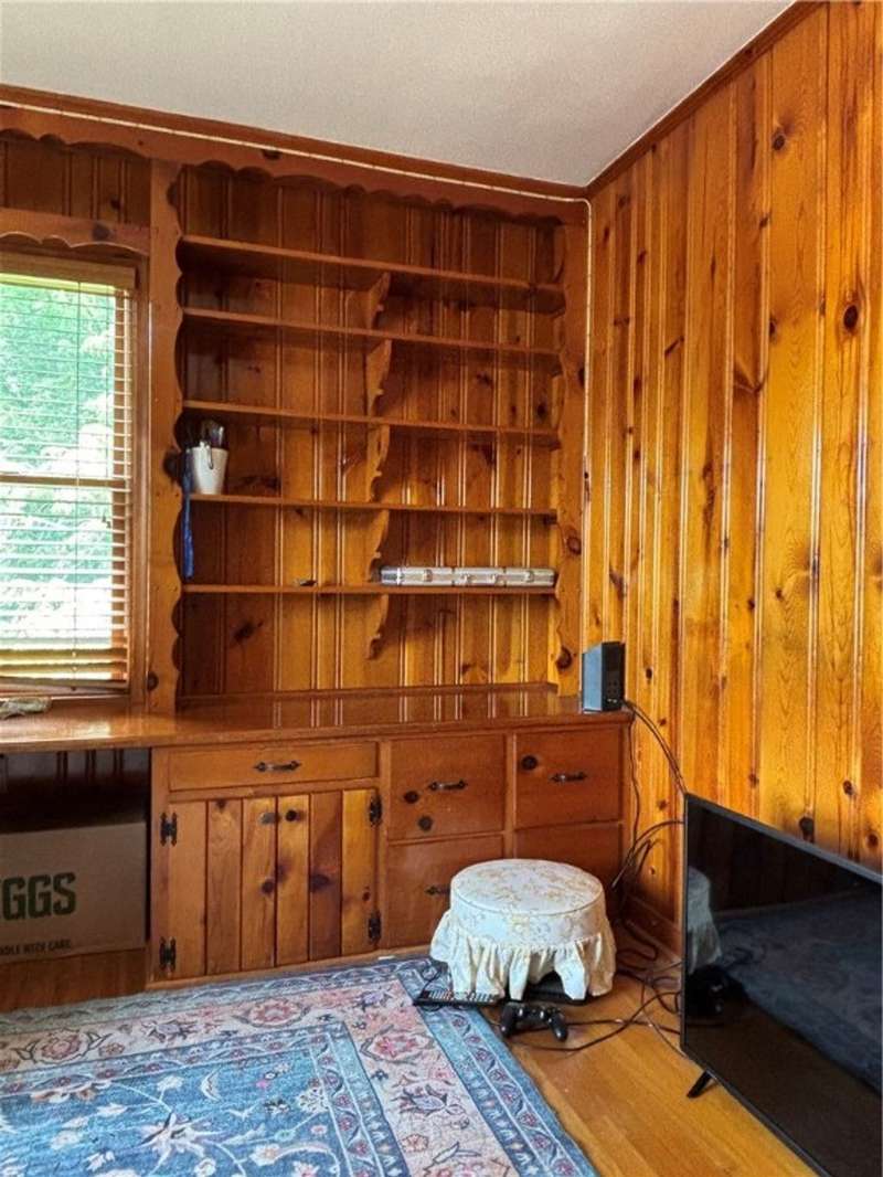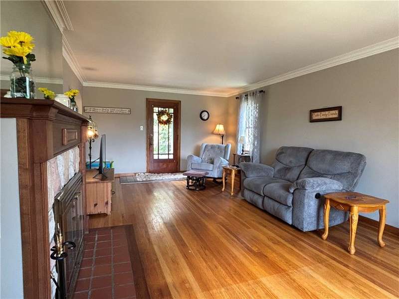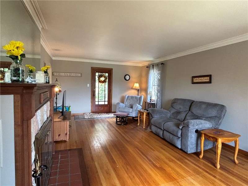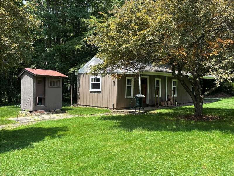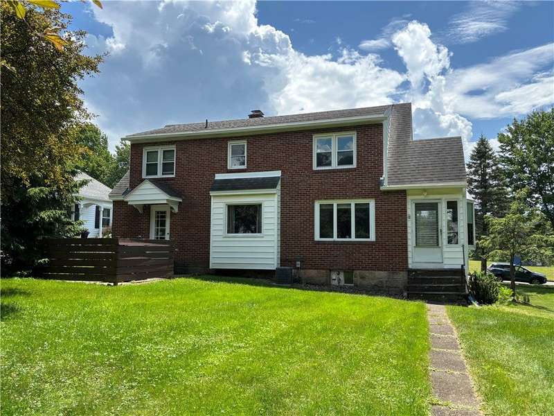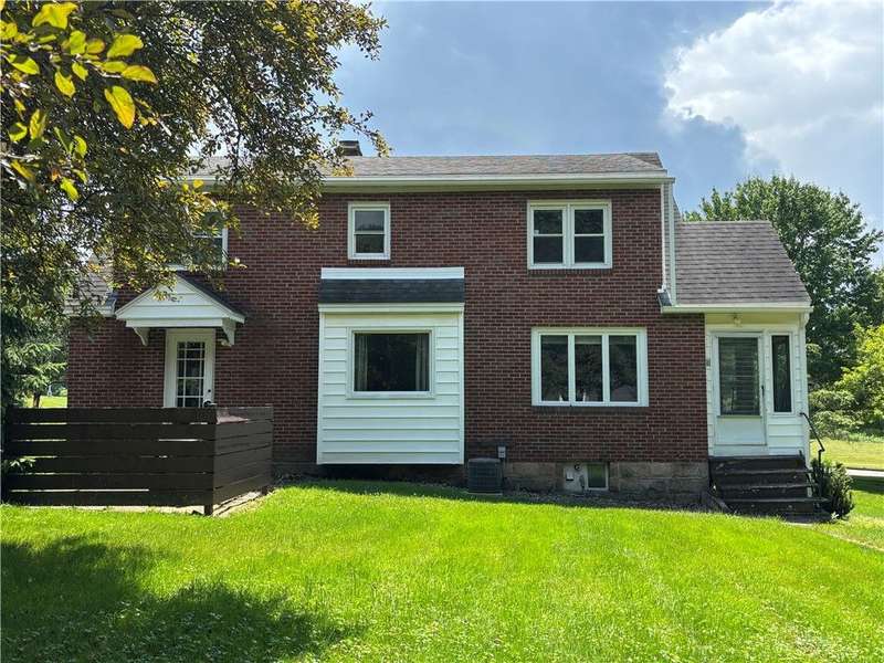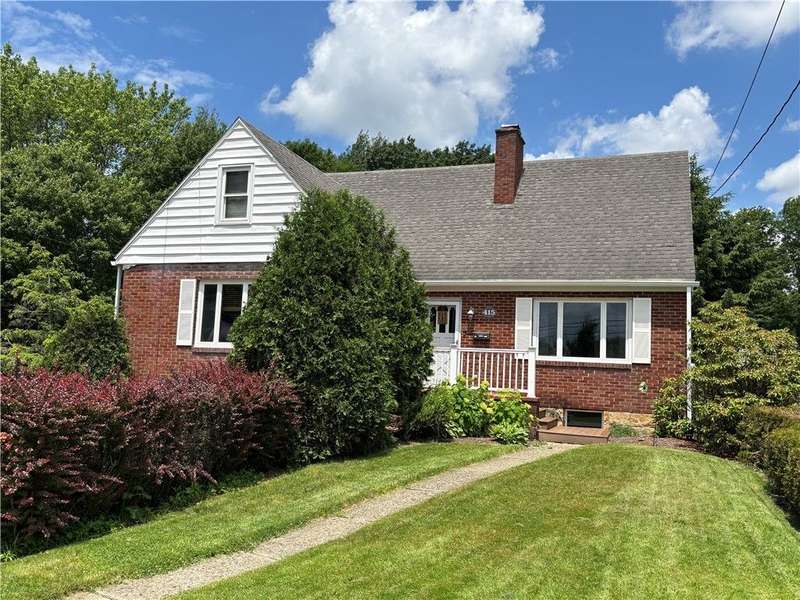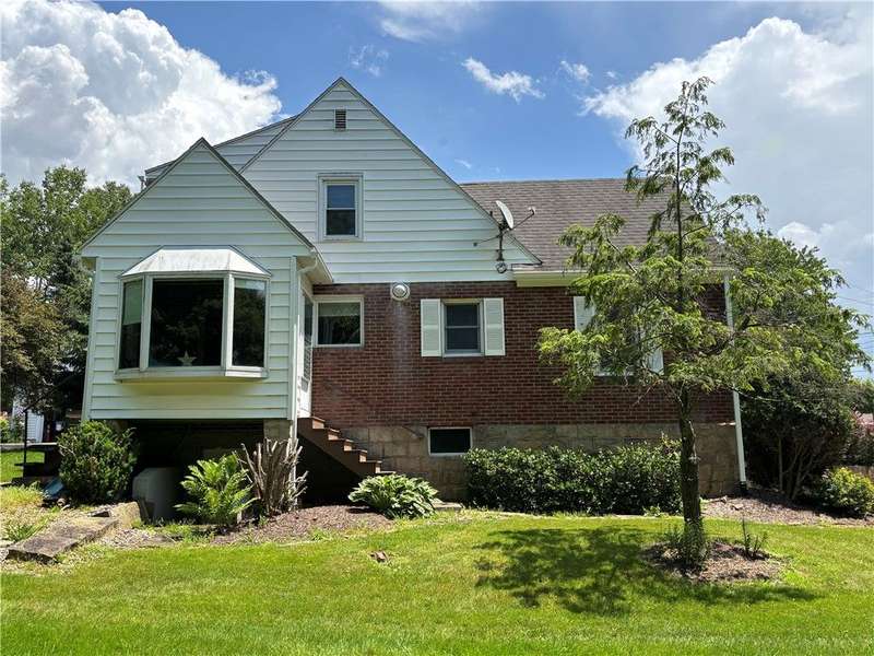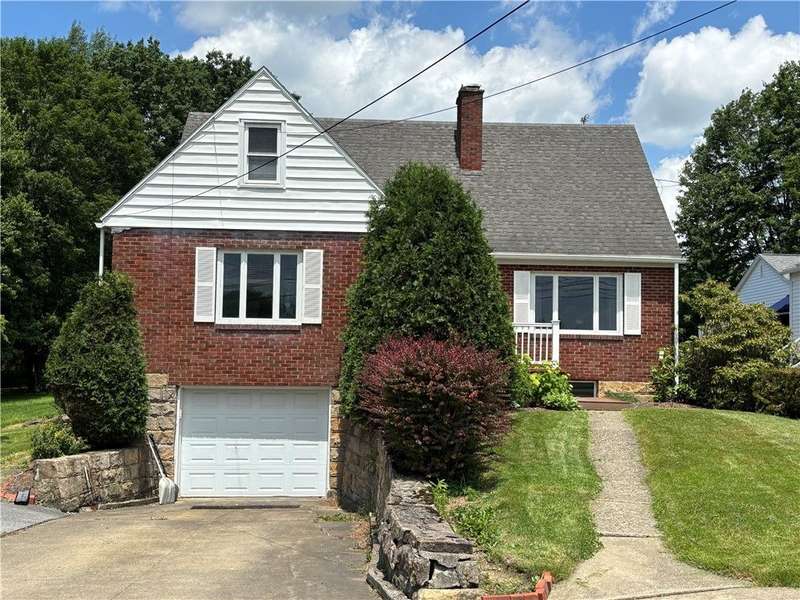 Classic Brick Cape Cod with integral garage, workshop and oversized yard in a prime location across from the elementary and middle school. This 3-bedroom, 2-bath home offers a perfect blend of functionality and room to grow. The cozy living room features a wood-burning fireplace framed in stone with a wood mantel allowing added warmth in crisp winter days. Gleaming hardwood floors run throughout the home adding timeless charm. The kitchen is both practical and bright, with a breakfast bar and plenty of space for a dining table plus a huge picture window overlooking the backyard and wooded area. Kitchen appliances are included plus the seller is offering a credit toward the replacement of the built-in wall oven/microwave. The versatile den or study includes a built-in desk and full wall of shelving?ideal for a home office, guest room, or even a fourth bedroom with a convenient half-bath just off the room.Upstairs you'll find three bedrooms, a full bathroom, and a bonus storage room?great for seasonal items or creative projects. The full basement boasts a second wood-burning fireplace and an integral garage with the washer, dryer, and dehumidifier included in the sale. The oversized yard feels like your own private park, bordered by a wooded area and a charming creek with a small footbridge. There's also a 14' x 40' workshop?perfect for hobbies, storage, or entertaining ?plus a 5' x 7' shed.