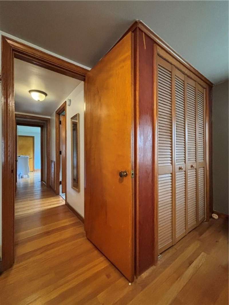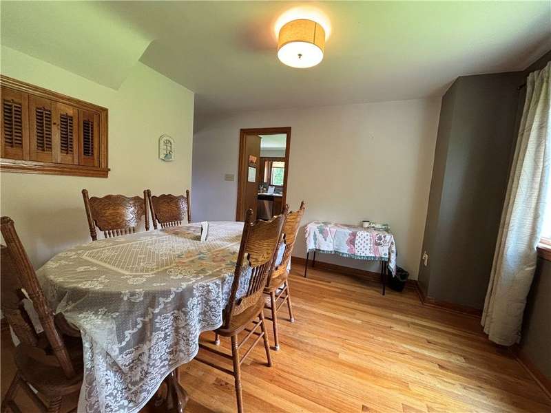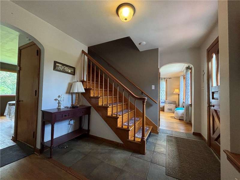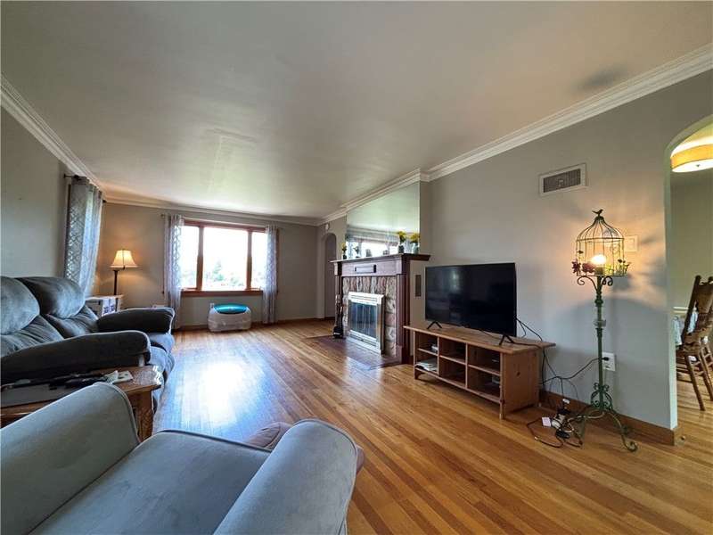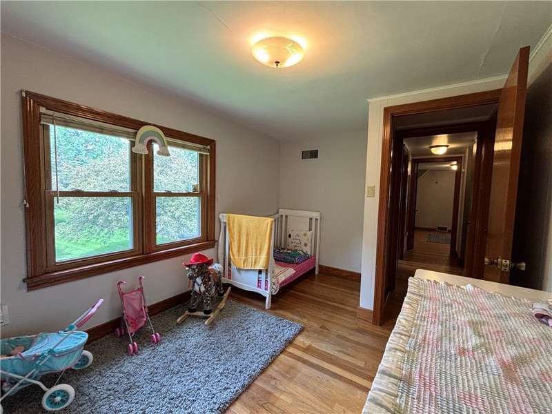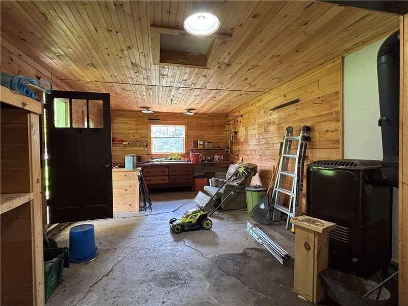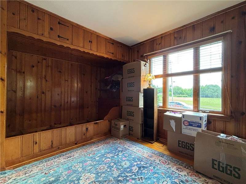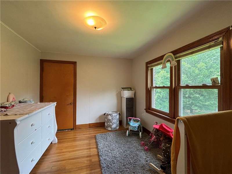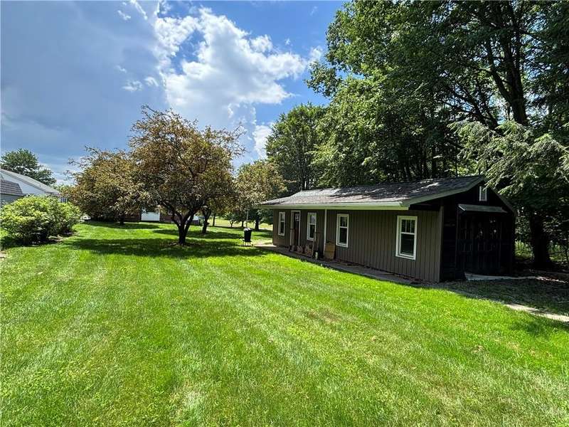 Classic Brick Cape Cod with integral garage, workshop and oversized yard in a prime location across from the elementary and middle school. This 3-bedroom, 2-bath home offers a perfect blend of functionality and room to grow. The cozy living room features a wood-burning fireplace framed in stone with a wood mantel allowing added warmth in crisp winter days. Gleaming hardwood floors run throughout the home adding timeless charm. The kitchen is both practical and bright, with a breakfast bar and plenty of space for a dining table plus a huge picture window overlooking the backyard and wooded area. Kitchen appliances are included plus the seller is offering a credit toward the replacement of the built-in wall oven/microwave. The versatile den or study includes a built-in desk and full wall of shelving?ideal for a home office, guest room, or even a fourth bedroom with a convenient half-bath just off the room.Upstairs you'll find three bedrooms, a full bathroom, and a bonus storage room?great for seasonal items or creative projects. The full basement boasts a second wood-burning fireplace and an integral garage with the washer, dryer, and dehumidifier included in the sale. The oversized yard feels like your own private park, bordered by a wooded area and a charming creek with a small footbridge. There's also a 14' x 40' workshop?perfect for hobbies, storage, or entertaining ?plus a 5' x 7' shed.