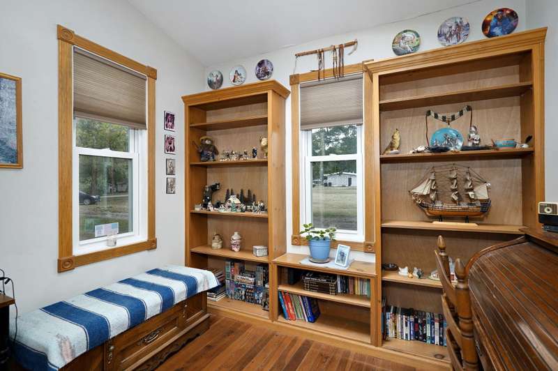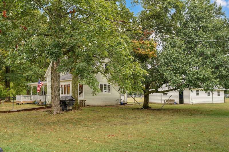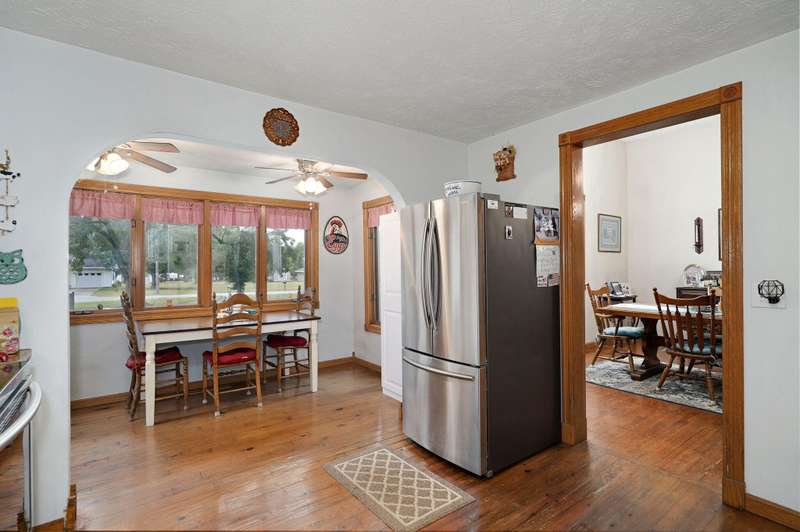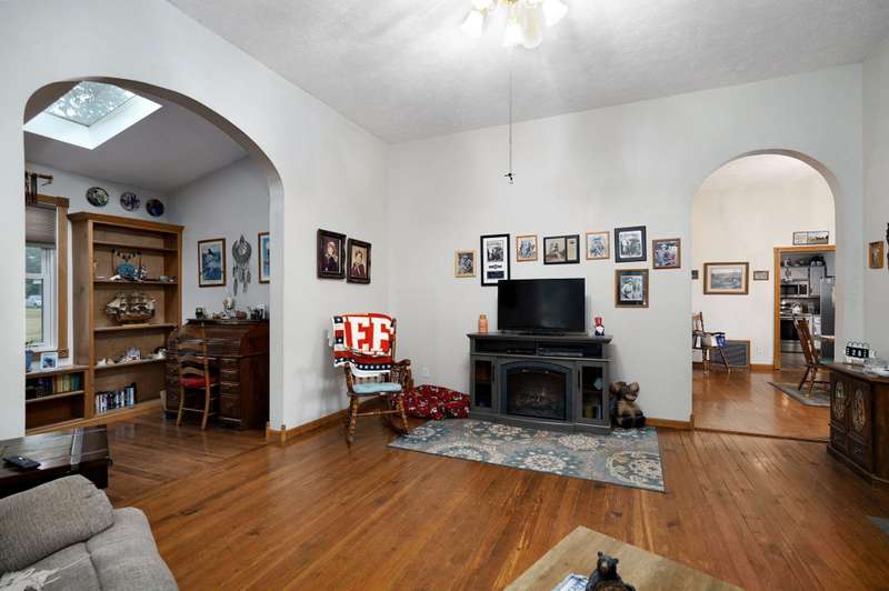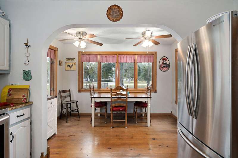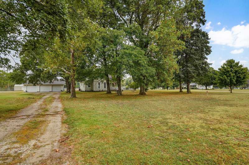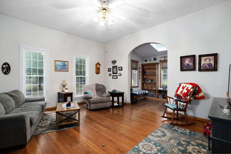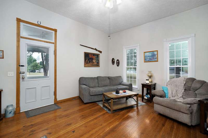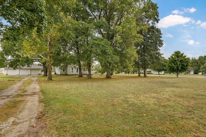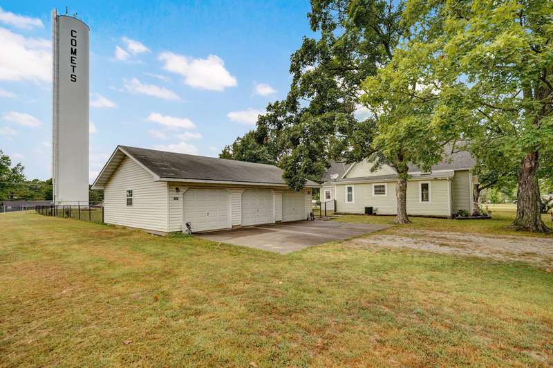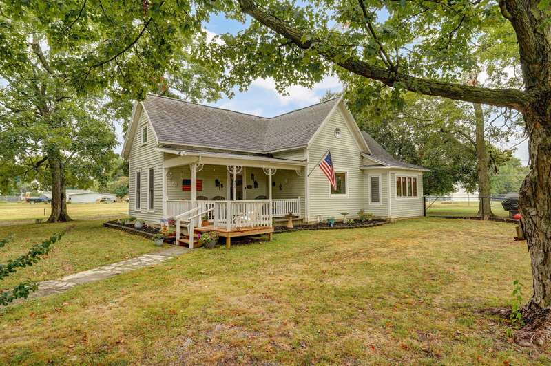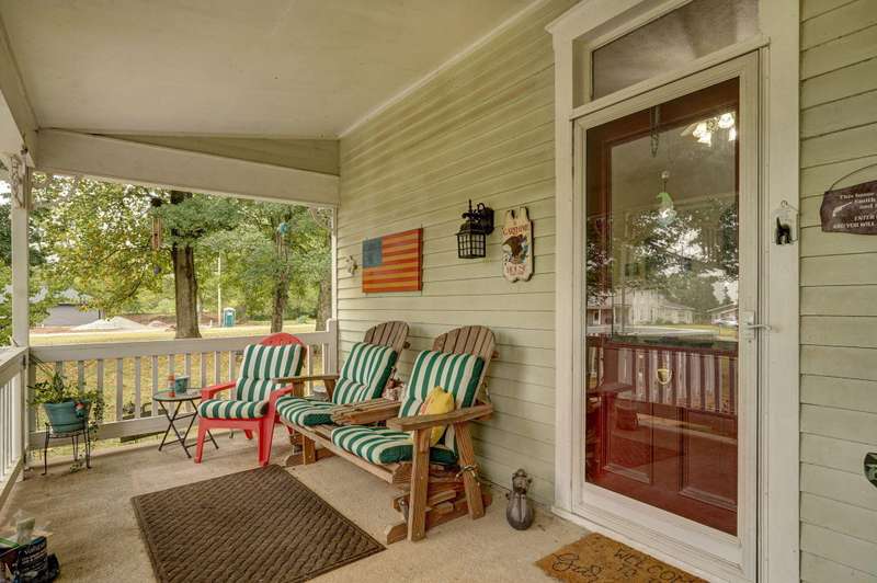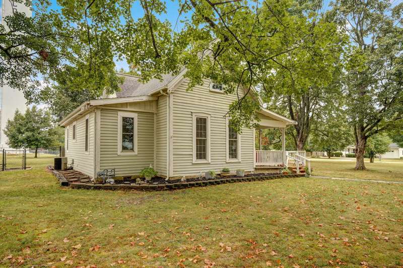 Beautiful home with an Amazing covered front porch overlooking almost 2 acres. Drink your morning coffee and watch the White squirrels. Beautiful wood floors. Granite countertops in the kitchen and bathroom / double sinks. Newer windows. Fresh paint. High ceilings gives it a great open feel. One bedroom upstairs. A fantastic breakfast nook with lots of windows. Also a Bonus room/office/reading nook with a skylight. Could also be a small bedroom or nursery. Basement has HVAC system and hot water heater also a sump pump. Makes for a great place for storage and shelter for storms. Fantastic detached three car garage with concrete floors and electric. Very nice cozy home. LARGE LOT.