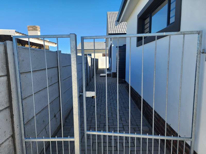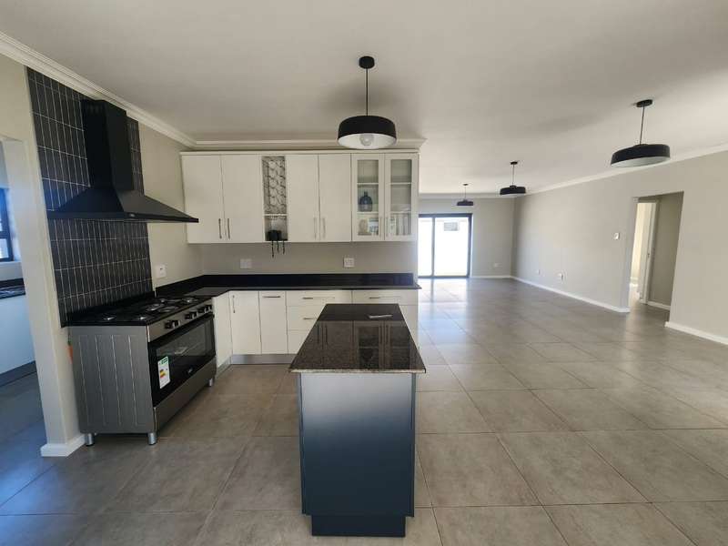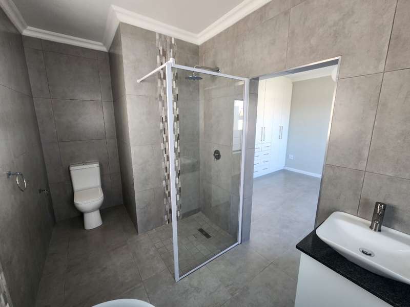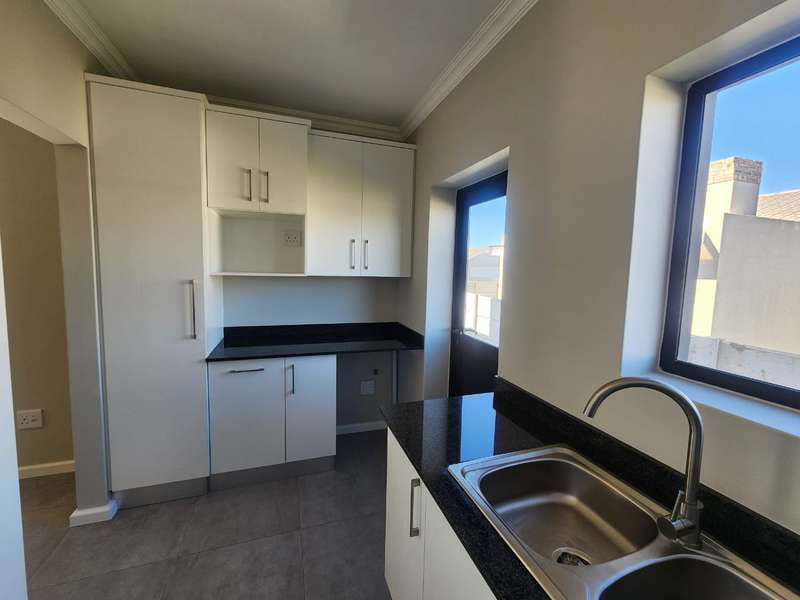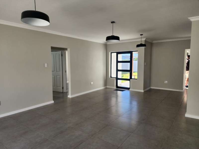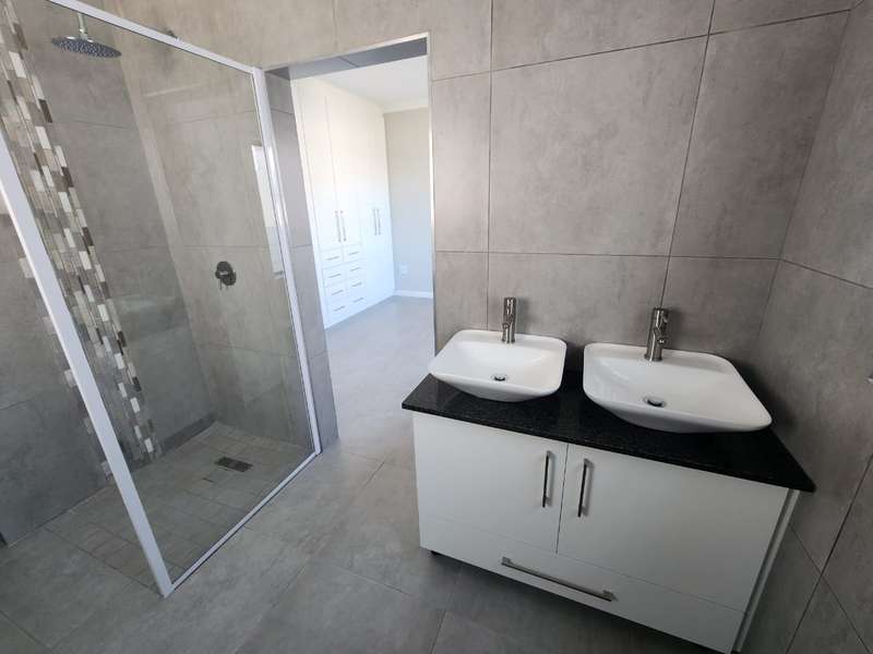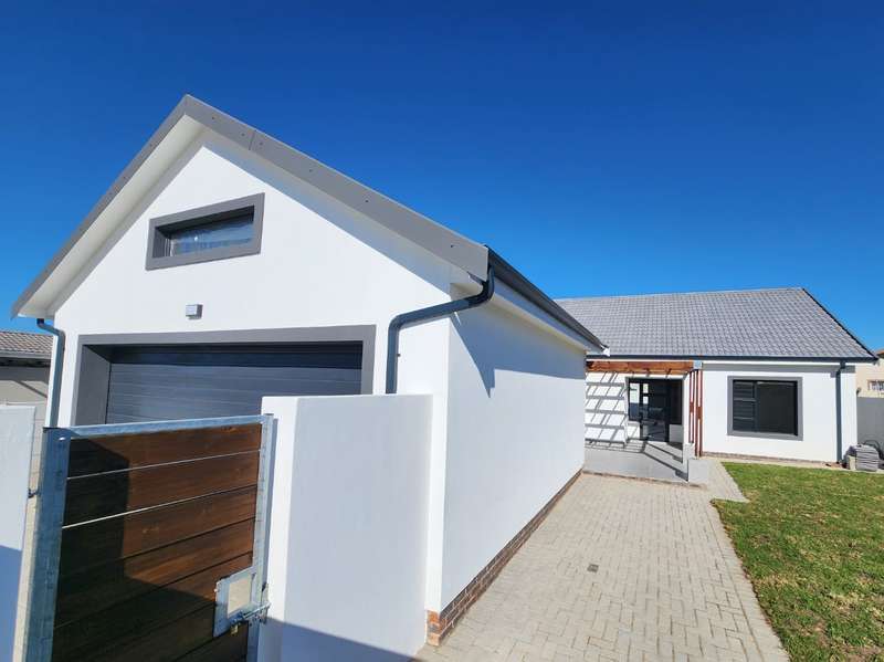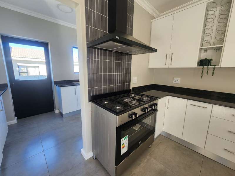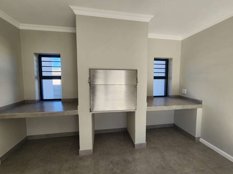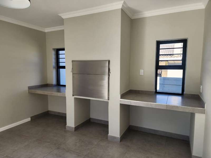Newly built family home in Fountains Estate with approved building plans, occupation certificate and NHBRC certificate. Enter this airy open plan lounge, dining and kitchen area. The kitchen has a movable island, gas stove top (Defy) and separate scullery with connections for dishwasher and washing machine. The kitchen leads to the entertainer’s area with built in braai, opening onto a sunny patio with pergola. This area also gives direct access into the double garage with automatic doors. The house has three spacious bedrooms all have built-in cupboards and the two modern bathrooms. The main bedroom has an en-suite bathroom. The house is fully walled, has a gas geyser, water tank and burglar bars. This new house will sell quickly, act soon!