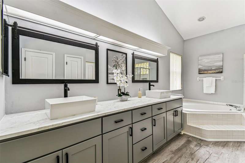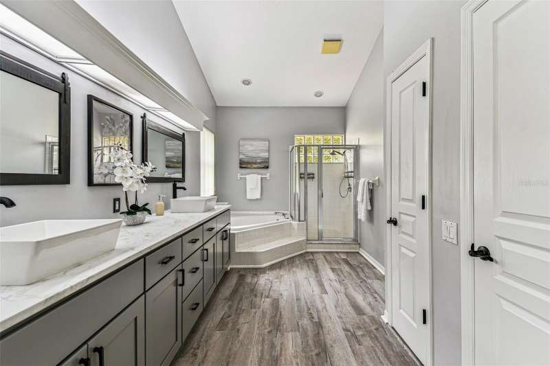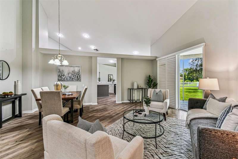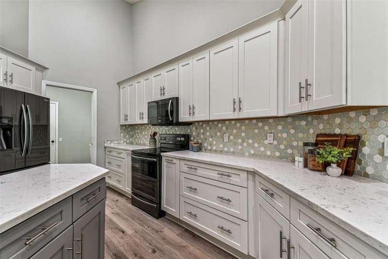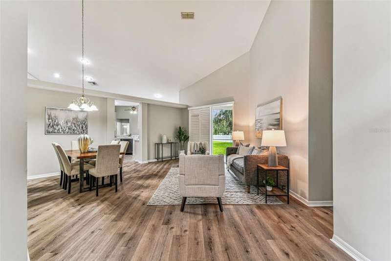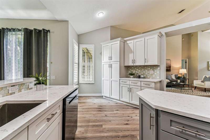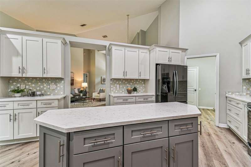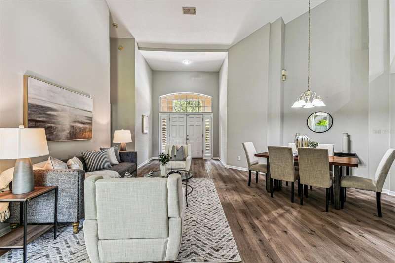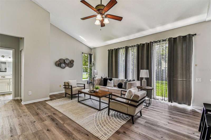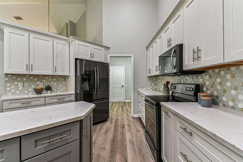 An extraordinary opportunity to own a rare piece of TAMPA PALMS real estate! This beautifully renovated home situated on a .32 acre waterfront lot offers 2,318 sq. ft. of luxurious living space, featuring 4 bedrooms, 3 baths, and a spacious 3-car garage with soaring 15+ ft ceilings throughout much of the home. No detail has been overlooked in this meticulously crafted property. A long list of recent high-end upgrades includes a new kitchen(2022), luxury vinyl plank flooring (2023), quartz countertops (2023) exterior paint (2020), HVAC system (2020), roof (2018) and much more! The heart of the home is the elegant, open-concept kitchen and living area, which seamlessly connects to the massive fenced in yard with beautiful views of the water—offering the perfect setting for relaxed indoor-outdoor living! The primary suite is a true retreat with vaulted ceilings, walk-in closet, remodeled bath and private access to the lanai with beautiful views of the water! Located within the prestigious community of Wellington at TAMPA PALMS, residents enjoy an impressive array of amenities including lighted tennis, pickleball, basketball, ball fields, multiple playgrounds, jogging trails and access to the Tampa Palms Golf and Country Club where the family will find a world-class Arthur Hills Designed golf course, exceptional amenities and a robust social calendar! The club even offers a 25-suite boutique luxury hotel for overnight stays and out-of-town guests! Convenient to top-rated schools, I-75, Wiregrass, Tampa Premium Outlets, hospitals, and dining, this home truly offers the ultimate Florida lifestyle in one of Tampa’s most sought-after communities!