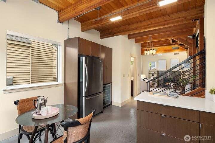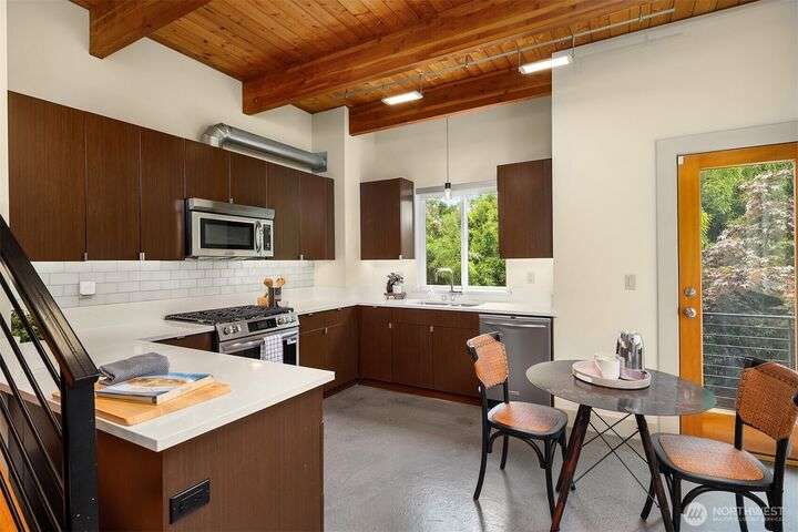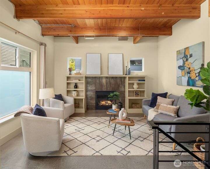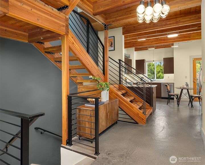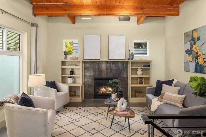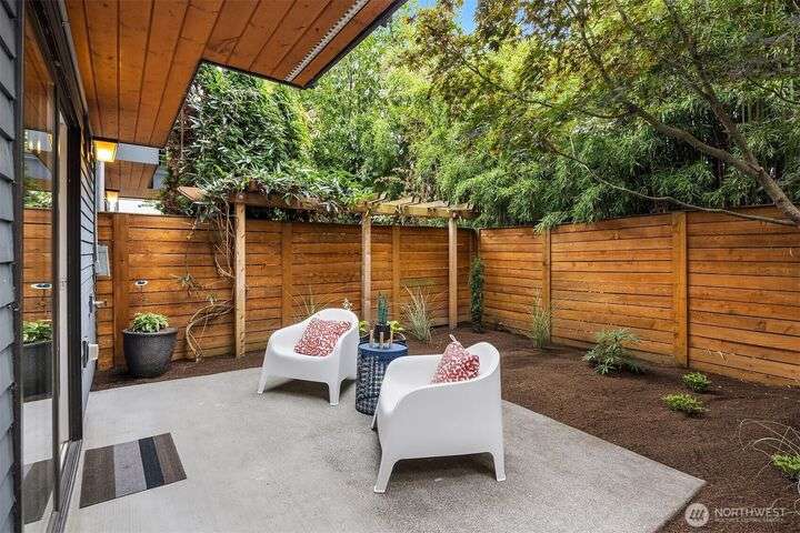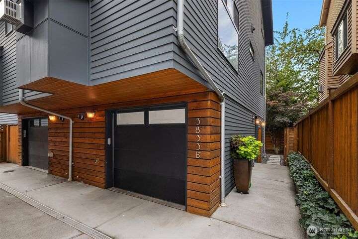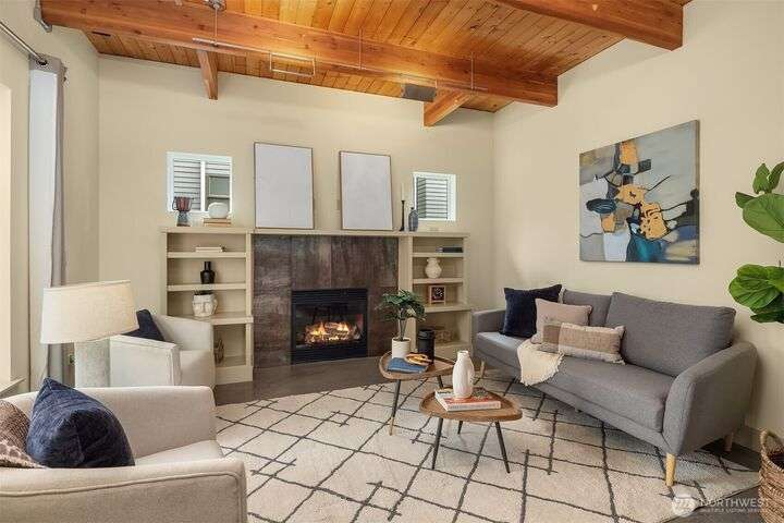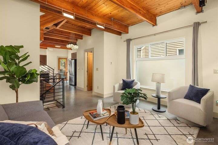 Located in the desirable Wallingford neighborhood. Close to excellent schools, parks, area restaurants, coffee shops and convenient access to downtown. Walk score of 88. Built in 2008, this townhome features an open floor plan, 10’ exposed beam ceilings, radiant heated concrete floors, gas fireplace and an open wood staircase with custom metal railings. Generous size kitchen with custom wood cabinets, quartz counters and stainless-steel appliances. The upper-level features two good size bedrooms with vaulted ceilings and a spacious full bath with jacuzzi tub. Lower level features a den/office space with slider access to rear yard and access to one car garage with extra storage. Private, fenced rear yard with entertainment size patio.