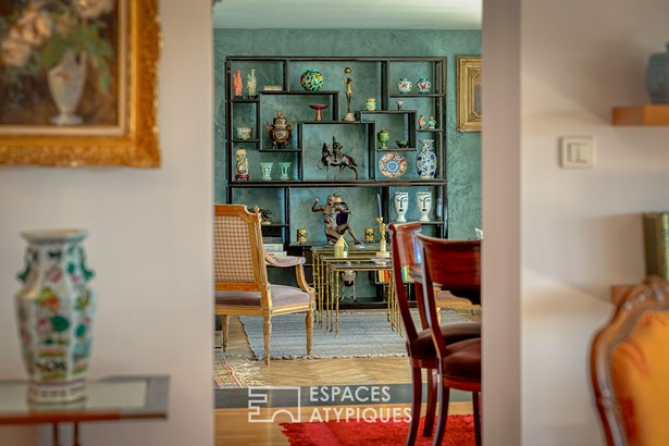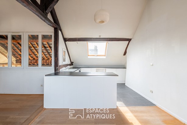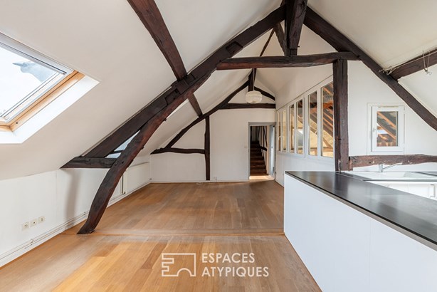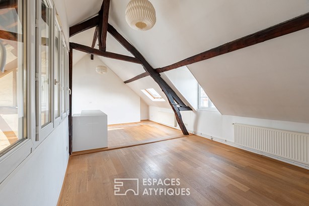 The heart of this floor is a generous 25m2 living room (Carrez law), enhanced by solid oak parquet flooring and exposed beams.