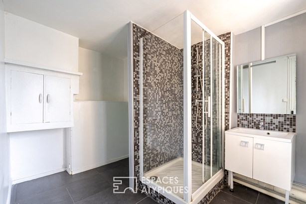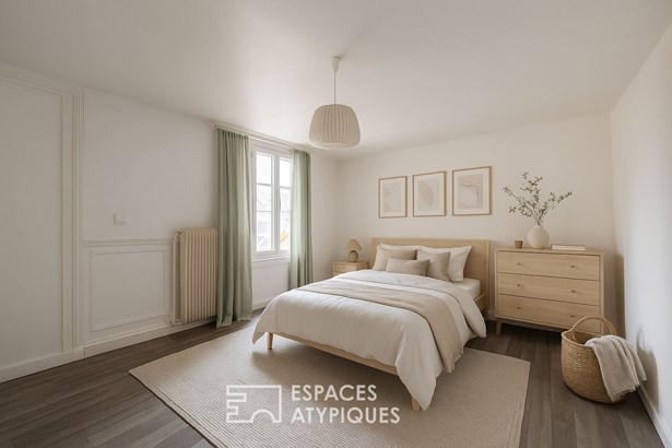 From the entrance, a long hallway leads to the living areas. On the right, a first large 17m2 bedroom, and on the left, a shower room with WC. Further on, a small office with closets leads to a spacious and bright 13.5m2 bedroom, adorned with herringbone parquet flooring and a black marble fireplace. A bathroom and separate WC complete this level.