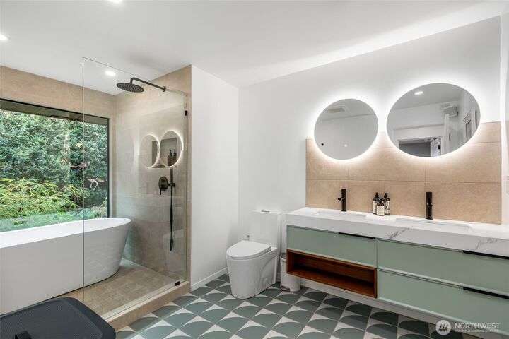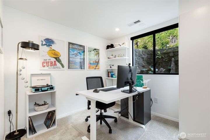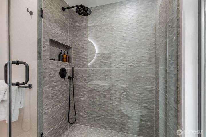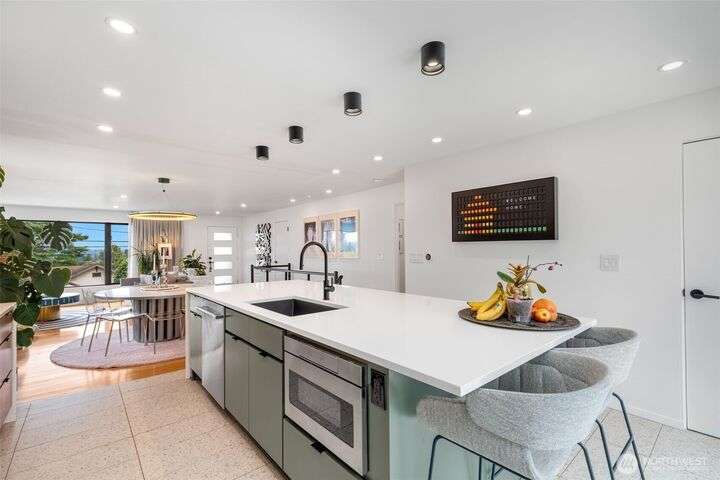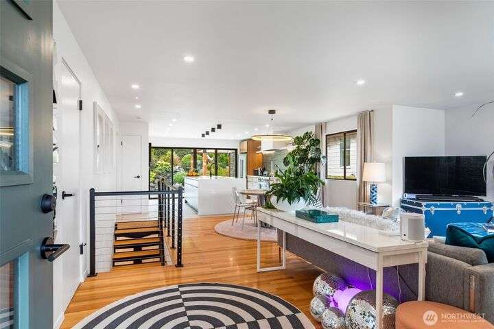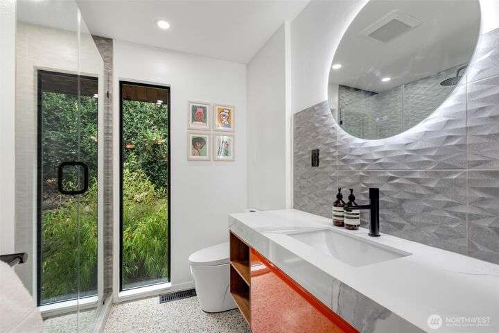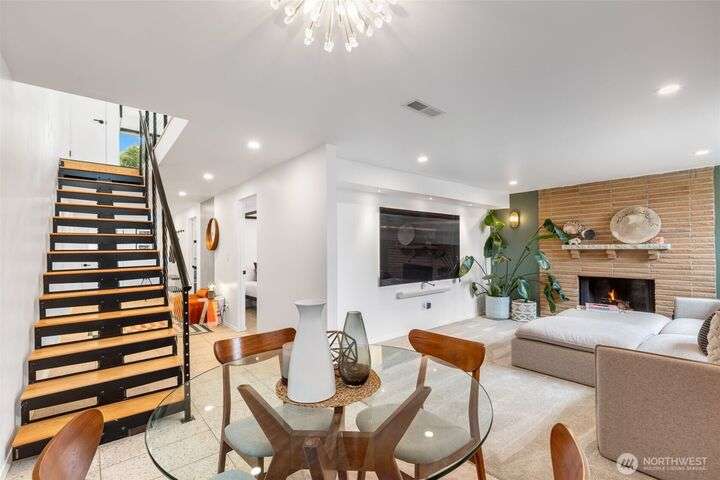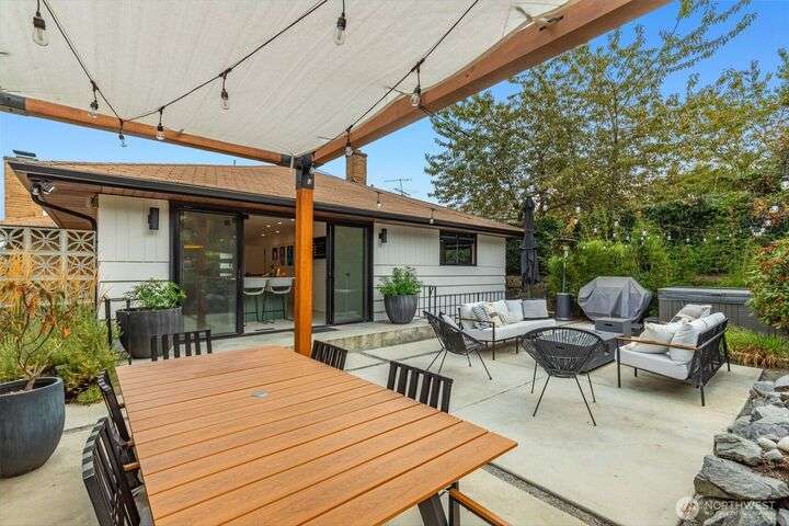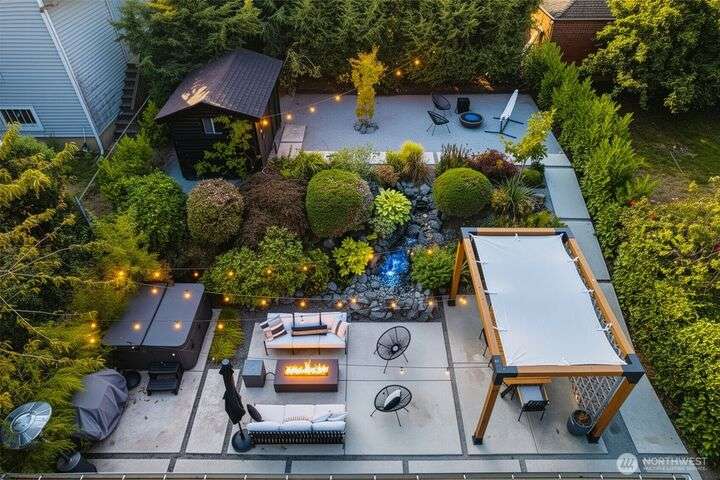 Stunningly remodeled mid-century home with sweeping territorial views to the east, just blocks from the Beacon Hill Light Rail. Stylistic open-concept living, dining and kitchen that flows seamlessly through oversized sliding doors to a private backyard oasis. 2 bedrooms on the main, the primary suite features a spa-inspired bath with floor-to-ceiling picture window—bringing natural light to this serene retreat. The light-filled lower level offers high ceilings, a cozy media room, 2 guest bedrooms, abundant storage, and attached garage with EV charging. Beautifully landscaped yard with both upper and lower seating areas, lush curated foliage, and exceptional privacy—perfect for relaxing or entertaining with a gazebo, waterfall & hot tub.