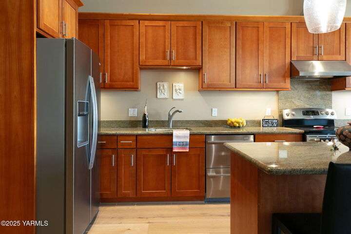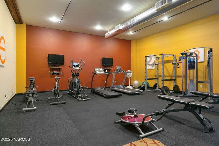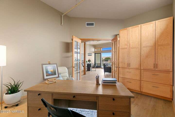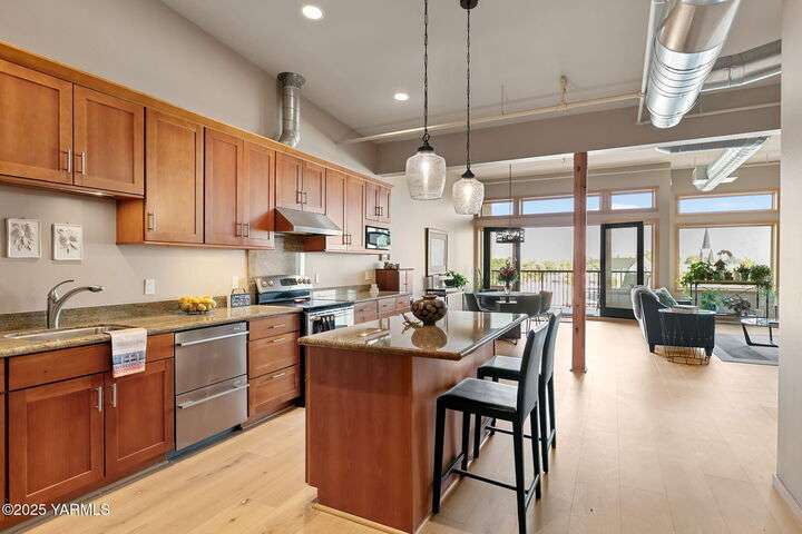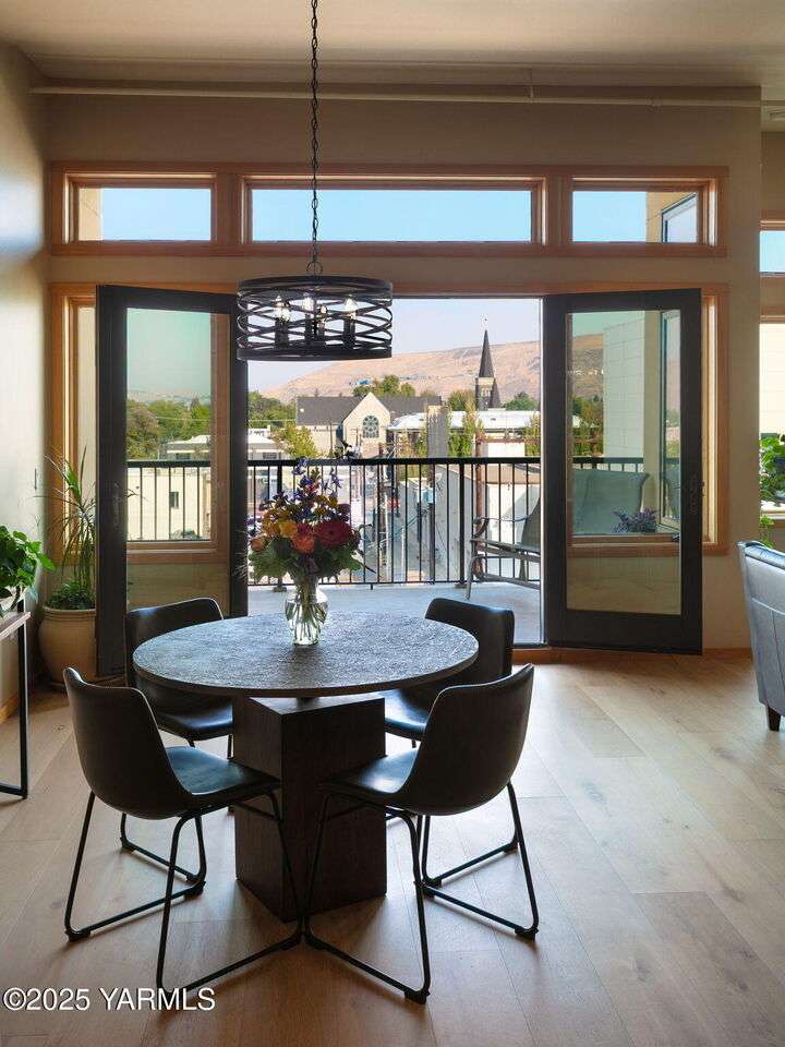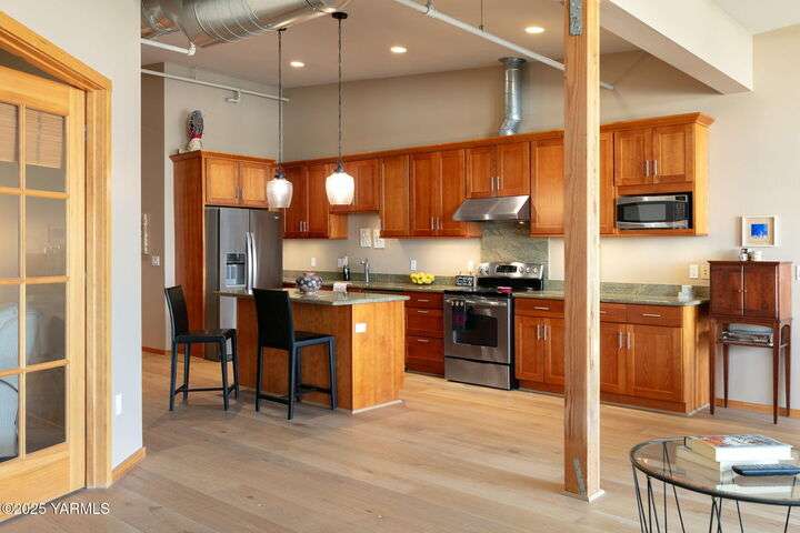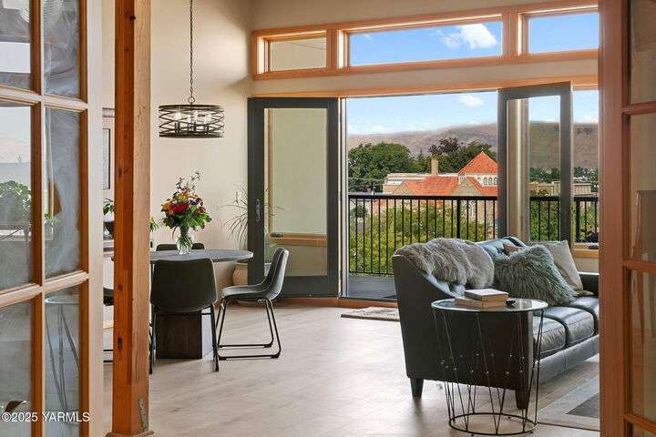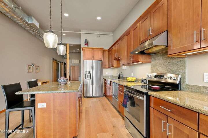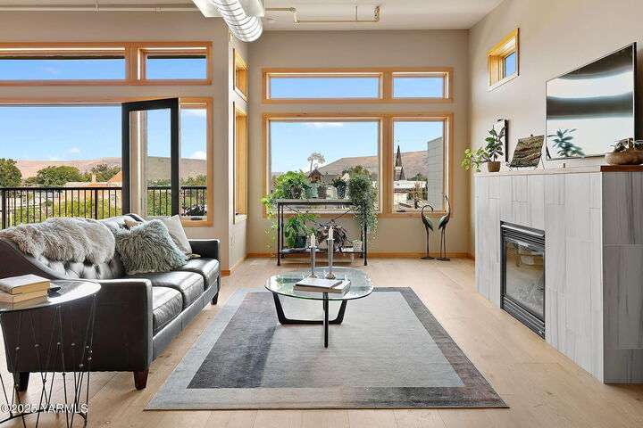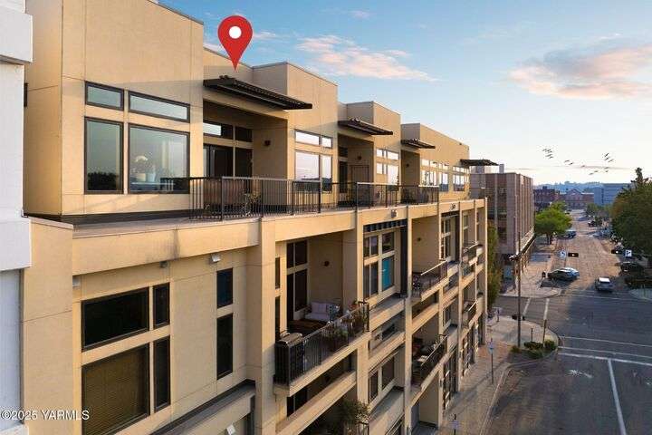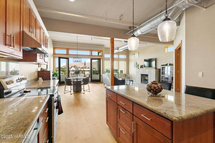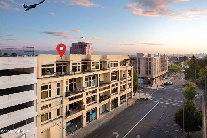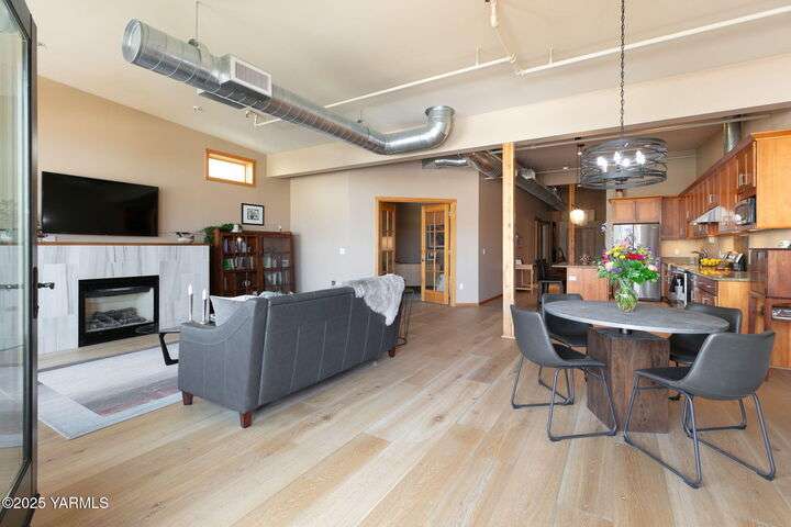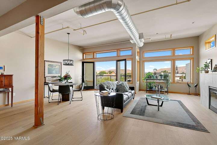 Urban Living Where History Meets Modern Design. Experience downtown Yakima living at its finest in this one-bedroom plus office/den condo at The Lofts, set on the historic site of the iconic Bon March. This stylish residence blends industrial character with modern comfortwide-plank oak floors, exposed beams and ductwork, and soaring ceilings create an airy, urban feel, while warm cherry cabinetry, a sliding barn door, and custom built-ins add timeless sophistication. The chef-inspired kitchen, with island prep space, a double-drawer dishwasher, and soft-close cabinetry, flows seamlessly into the open living area, complete with a cozy tiled fireplace and private north-facing balconyperfect for relaxing or entertaining. A sunlit office/den with glass doors provides flexibility for work or hobbies, while the spacious primary suite features a spa-like bathroom and a generous walk-in closet with built-in shelving and drawers for exceptional organization.Two secured underground parking spaces, a spacious storage unit, a private gym, and a community lounge round out this exceptional offering. All of this is within easy walking distance of the Capitol Theatre, downtown restaurants, breweries, tasting rooms, a movie theatre, farmers market, and year-round eventsoffering the freedom to explore everything Yakima has to offer, right from your doorstep.