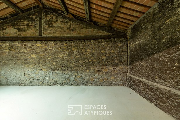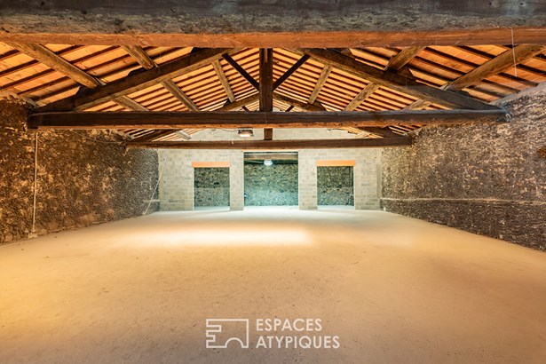 Upstairs, a second 336 sqm floor rests on a new concrete floor. The stone walls and exposed timbers reveal a charming authenticity. A building permit has been submitted and approved for the creation of a contemporary loft with 60 sqm of terraces, combining industrial character and residential comfort.