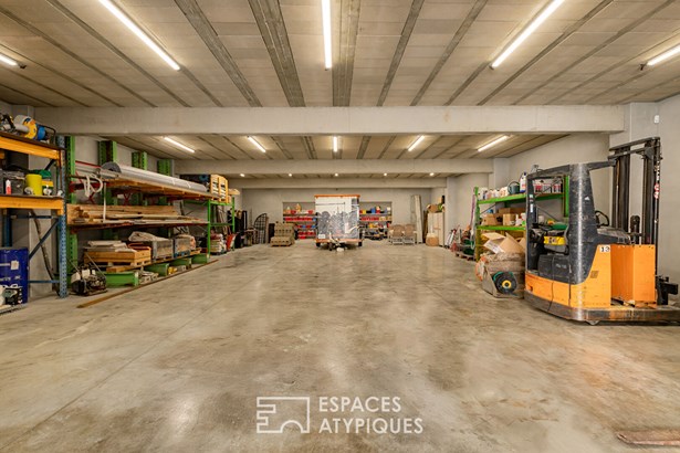 The perfectly maintained ground floor covers 336 sqm in a single block. A helicopter-smoothed concrete floor, rendered walls, LED lighting, and a 4-meter motorized gate create a functional and modern ensemble. A glass-enclosed office, bathrooms with shower and toilet, as well as generous ceiling heights allow for various uses: storage, parking, or a craftsman's workshop.