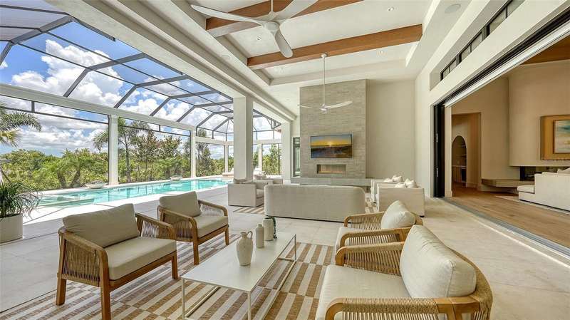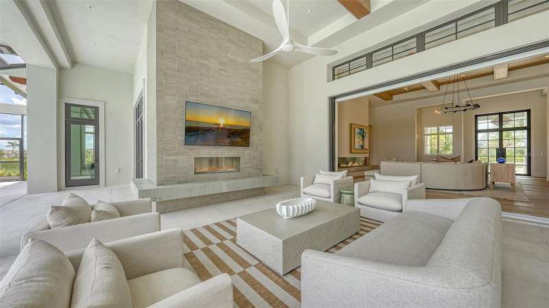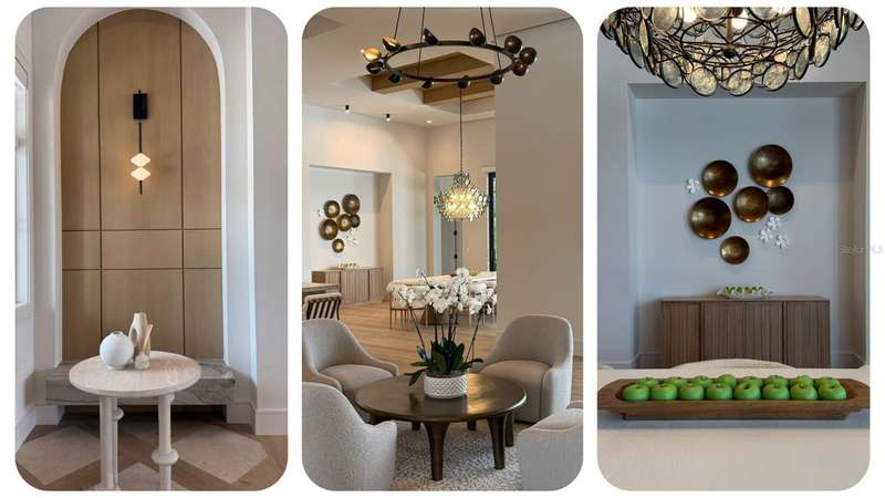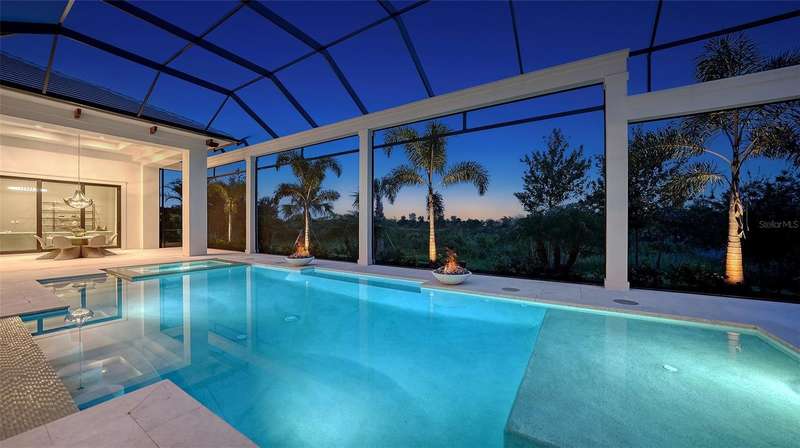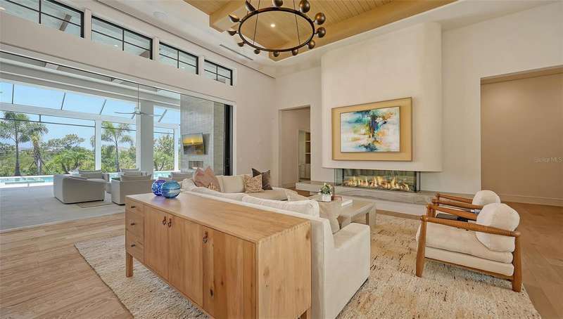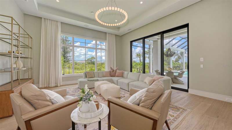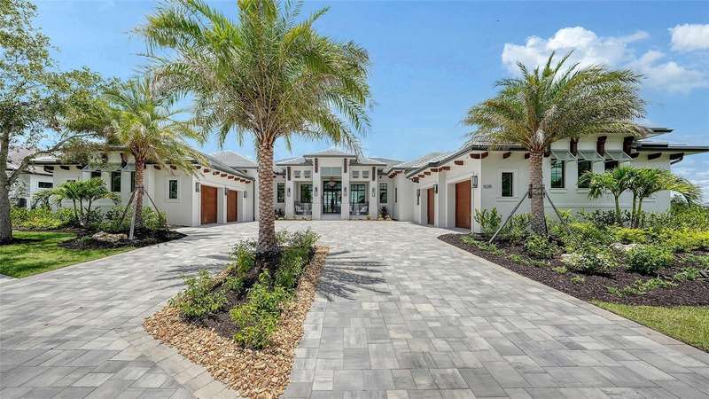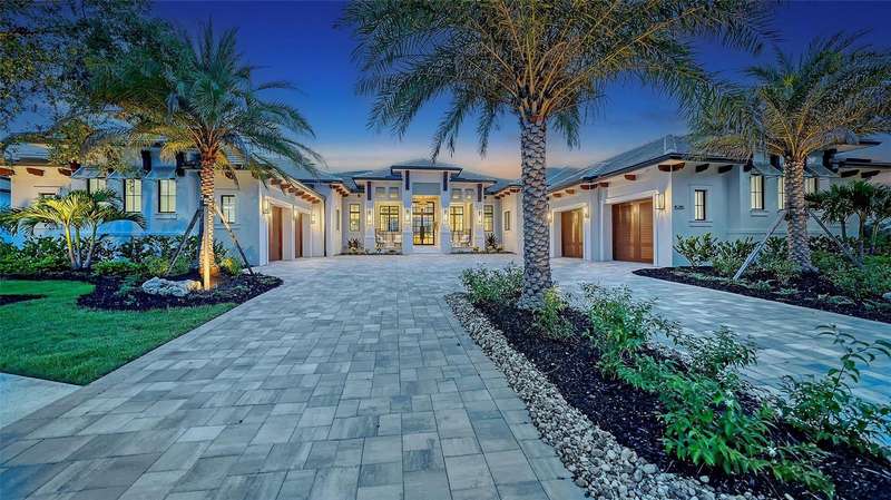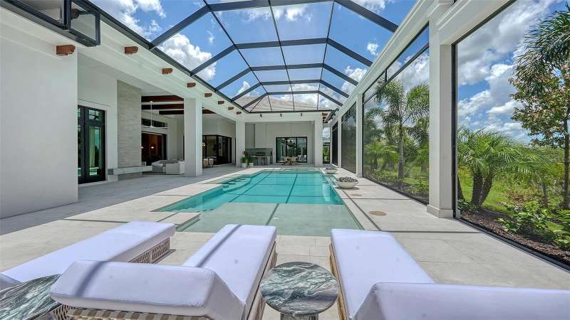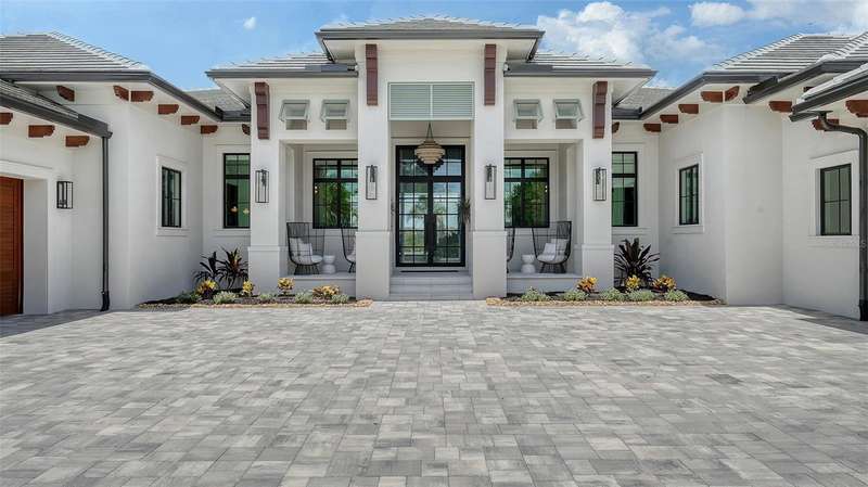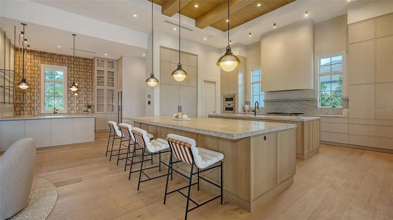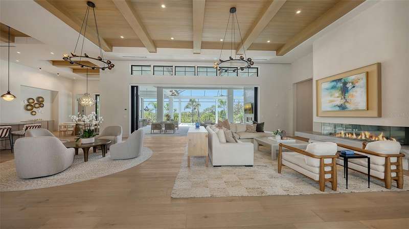 Under contract-accepting backup offers. Tucked within the private, gated cul-de-sac enclave of Anchorage Place in The Lake Club, this six-month-old Stock Custom Home is a true architectural masterpiece. Set on two-thirds of an acre with sweeping views of lush natural surroundings, this 5,997 sq. ft., four- bedroom, five-and-a-half bath estate blends modern sophistication with serene, Florida resort-style living. Professionally decorated and fully furnished with new furnishings ($350K furniture package and $100K in recent upgrades), this stunning home embodies “organic modern” elegance—defined by earthy hues, layered textures, and refined finishes. The thoughtful design is evident from the moment you arrive, beginning with a smart glass iron front door with switchable privacy feature, intricate inlay flooring, and 15-foot tongue-and-groove rift-cut white oak ceilings that match the wood flooring throughout. The light-filled great room is anchored by a curved stucco wall with a 72” three-sided gas fireplace and features 10-foot pocketing sliding glass doors topped with transom windows, seamlessly connecting the indoors to the outdoors. A concealed TV, tucked behind remote-controlled artwork, adds to the room’s sleek, sophisticated design. Across the room, a custom curved kitchen hood echoes the architectural elegance of the fireplace wall. The chef’s kitchen is a showstopper with leathered quartzite countertops and backsplashes, dual islands with hidden storage, a large butler pantry, and luxury-grade appliances—including paneled Sub-Zero refrigeration and two Cove dishwashers, and a Wolf dual gas range with six burners, griddle, and double ovens, and a Wolf steamer oven and speed oven. Just off the kitchen is a stylish wet bar with ceiling-mounted shelving, decorative wall tiling, Sub-Zero wine refrigeration, and built-in ice machine—perfect for effortless entertaining. The open-concept dining area features corner pocket sliding doors for full integration with the lanai and pool area, while a generous and versatile bonus room offers flexible living space. The primary suite is a luxurious private retreat, complete with a cozy sitting area, a separate office with floor-to-ceiling built-ins, a morning bar, two custom walk-in closets, and a spa-inspired bath with integrated travertine wall, countertops and flooring, dual water closets, a walk-through shower, and an oval soaking tub. Each of the three guest suites includes its own full en-suite bath and walk-in closet, offering privacy and comfort for family or guests. Step outside to your own private resort—an expansive screened lanai (3,270 sq ft) featuring covered and open-air seating and dining areas, a full outdoor kitchen with island and bar seating, a 72” TV over a 48” linear vent-free fireplace, a saltwater pool and spa with a swim-up bar, and dramatic fire bowls—all set against the tranquil backdrop of preserved natural beauty. Additional highlights include a spacious laundry room with custom cabinetry, a symmetrical four-car garage, a whole-house gas generator, Lutron and Hunter Douglas shades, and an integrated “Smart Home” which includes house-wide boosted Wi-Fi with system integration for selected lighting and shades, all TVs, music, thermostats, all exterior lighting including the lanai and home security cameras. The home includes Starlink to ensure uninterrupted internet access. Located in Lakewood Ranch, Lake Club amenities include a clubhouse, pools, fitness center, tennis and pickleball courts, scenic trail.