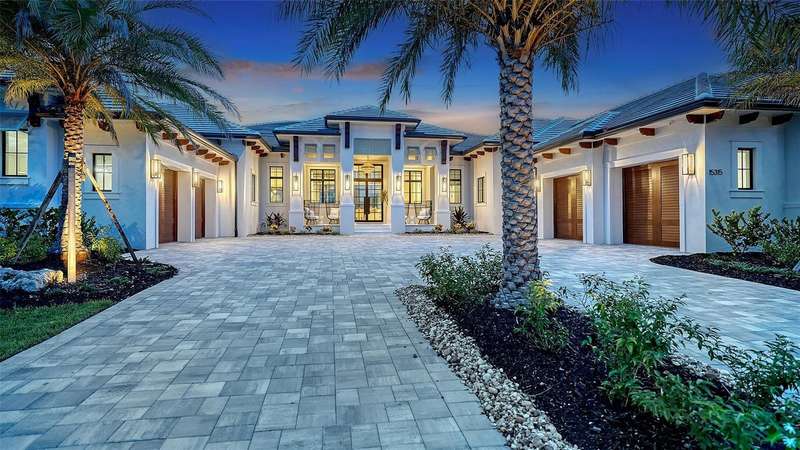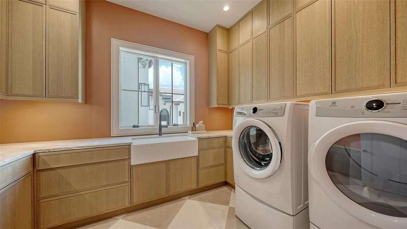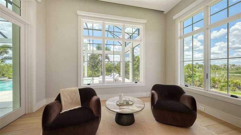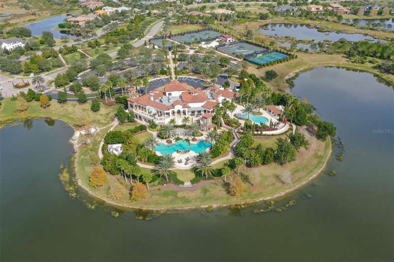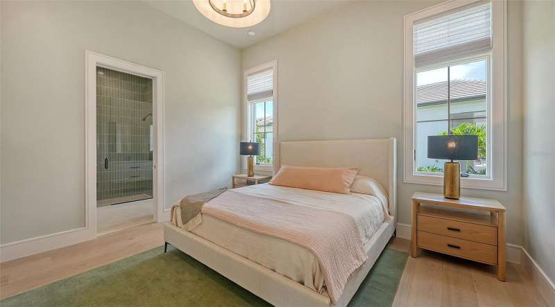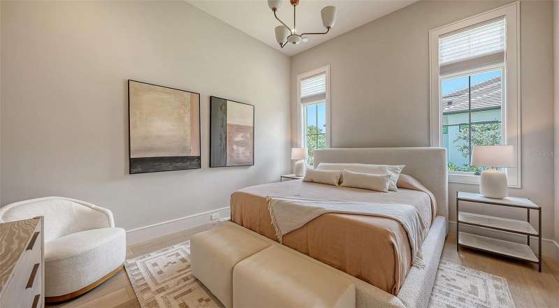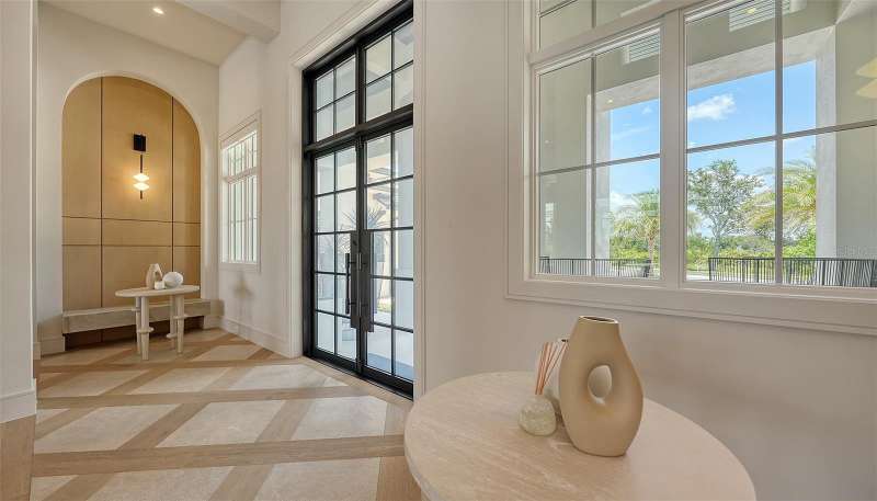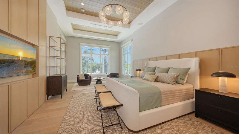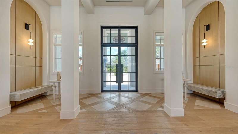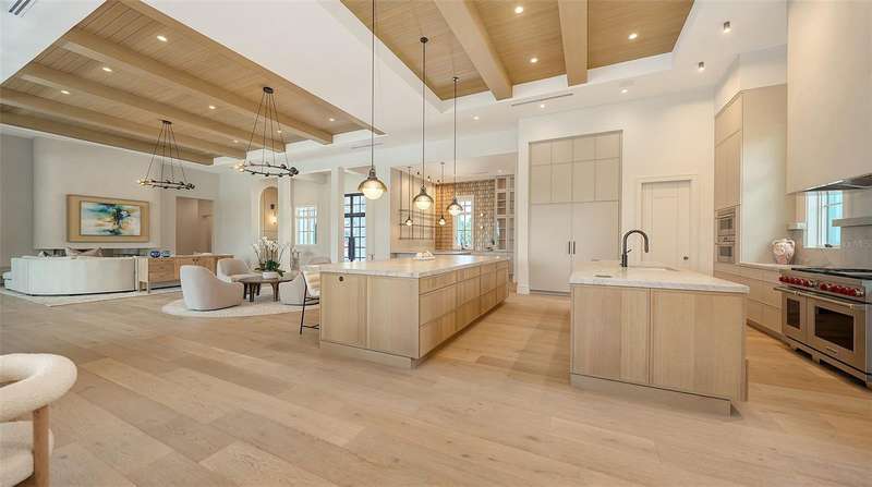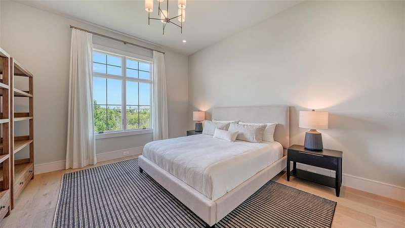 Under contract-accepting backup offers. Tucked within the private, gated cul-de-sac enclave of Anchorage Place in The Lake Club, this six-month-old Stock Custom Home is a true architectural masterpiece. Set on two-thirds of an acre with sweeping views of lush natural surroundings, this 5,997 sq. ft., four- bedroom, five-and-a-half bath estate blends modern sophistication with serene, Florida resort-style living. Professionally decorated and fully furnished with new furnishings ($350K furniture package and $100K in recent upgrades), this stunning home embodies “organic modern” elegance—defined by earthy hues, layered textures, and refined finishes. The thoughtful design is evident from the moment you arrive, beginning with a smart glass iron front door with switchable privacy feature, intricate inlay flooring, and 15-foot tongue-and-groove rift-cut white oak ceilings that match the wood flooring throughout. The light-filled great room is anchored by a curved stucco wall with a 72” three-sided gas fireplace and features 10-foot pocketing sliding glass doors topped with transom windows, seamlessly connecting the indoors to the outdoors. A concealed TV, tucked behind remote-controlled artwork, adds to the room’s sleek, sophisticated design. Across the room, a custom curved kitchen hood echoes the architectural elegance of the fireplace wall. The chef’s kitchen is a showstopper with leathered quartzite countertops and backsplashes, dual islands with hidden storage, a large butler pantry, and luxury-grade appliances—including paneled Sub-Zero refrigeration and two Cove dishwashers, and a Wolf dual gas range with six burners, griddle, and double ovens, and a Wolf steamer oven and speed oven. Just off the kitchen is a stylish wet bar with ceiling-mounted shelving, decorative wall tiling, Sub-Zero wine refrigeration, and built-in ice machine—perfect for effortless entertaining. The open-concept dining area features corner pocket sliding doors for full integration with the lanai and pool area, while a generous and versatile bonus room offers flexible living space. The primary suite is a luxurious private retreat, complete with a cozy sitting area, a separate office with floor-to-ceiling built-ins, a morning bar, two custom walk-in closets, and a spa-inspired bath with integrated travertine wall, countertops and flooring, dual water closets, a walk-through shower, and an oval soaking tub. Each of the three guest suites includes its own full en-suite bath and walk-in closet, offering privacy and comfort for family or guests. Step outside to your own private resort—an expansive screened lanai (3,270 sq ft) featuring covered and open-air seating and dining areas, a full outdoor kitchen with island and bar seating, a 72” TV over a 48” linear vent-free fireplace, a saltwater pool and spa with a swim-up bar, and dramatic fire bowls—all set against the tranquil backdrop of preserved natural beauty. Additional highlights include a spacious laundry room with custom cabinetry, a symmetrical four-car garage, a whole-house gas generator, Lutron and Hunter Douglas shades, and an integrated “Smart Home” which includes house-wide boosted Wi-Fi with system integration for selected lighting and shades, all TVs, music, thermostats, all exterior lighting including the lanai and home security cameras. The home includes Starlink to ensure uninterrupted internet access. Located in Lakewood Ranch, Lake Club amenities include a clubhouse, pools, fitness center, tennis and pickleball courts, scenic trail.