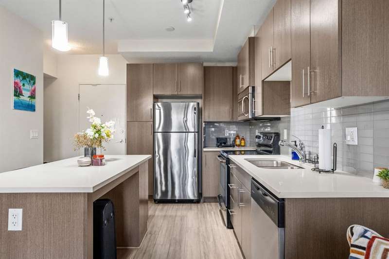 Move-in ready and full of natural light, this 1-bedroom, 1-bathroom condo in the highly sought-after lake community of Midnapore offers the perfect blend of comfort, convenience, and modern design. Whether you’re a first-time buyer, or investor, this bright and stylish home is the ideal opportunity to enjoy a low-maintenance lifestyle with year-round lake access. Inside, you’ll love the open-concept layout featuring 9-foot ceilings and large windows that create a spacious, airy feel. The modern kitchen is equipped with stainless steel appliances, quartz countertops, and a central island with seating, making it a great space for cooking, entertaining, or enjoying your morning coffee. The living and dining area flows seamlessly onto your private, east-facing patio—perfect for relaxing or barbecuing with the gas line hookup already in place. The privacy wall between balconies adds a nice sense of seclusion and comfort. The spacious bedroom offers generous closet space and large windows. You’ll also find in-suite laundry, keeping chores simple and convenient. Practical features include heated, titled underground parking, a separate titled storage unit, and pet-friendly policies that allow up to two cats or dogs (with board approval). This is one of the few affordable condos in a newer building in the area, offering fantastic value without compromise. Your monthly condo fees include heat, gas, water, and sewer, as well as the Midnapore Lake HOA fee, giving you full access to the lake and its incredible year-round amenities. Enjoy summer days swimming, kayaking, and paddle boarding, or take advantage of winter activities like skating and snowshoeing—all just steps from your front door. The location couldn’t be better—just a short walk to the CTrain station for quick access to downtown, and close to St. Mary’s University, Fish Creek Park, shopping, dining, and entertainment options. MidCity is a well-managed, pet-friendly complex offering exceptional value in one of Calgary’s most desirable lake communities. With a modern interior, secure parking, and full lake privileges, this home offers the perfect mix of urban convenience and outdoor lifestyle.